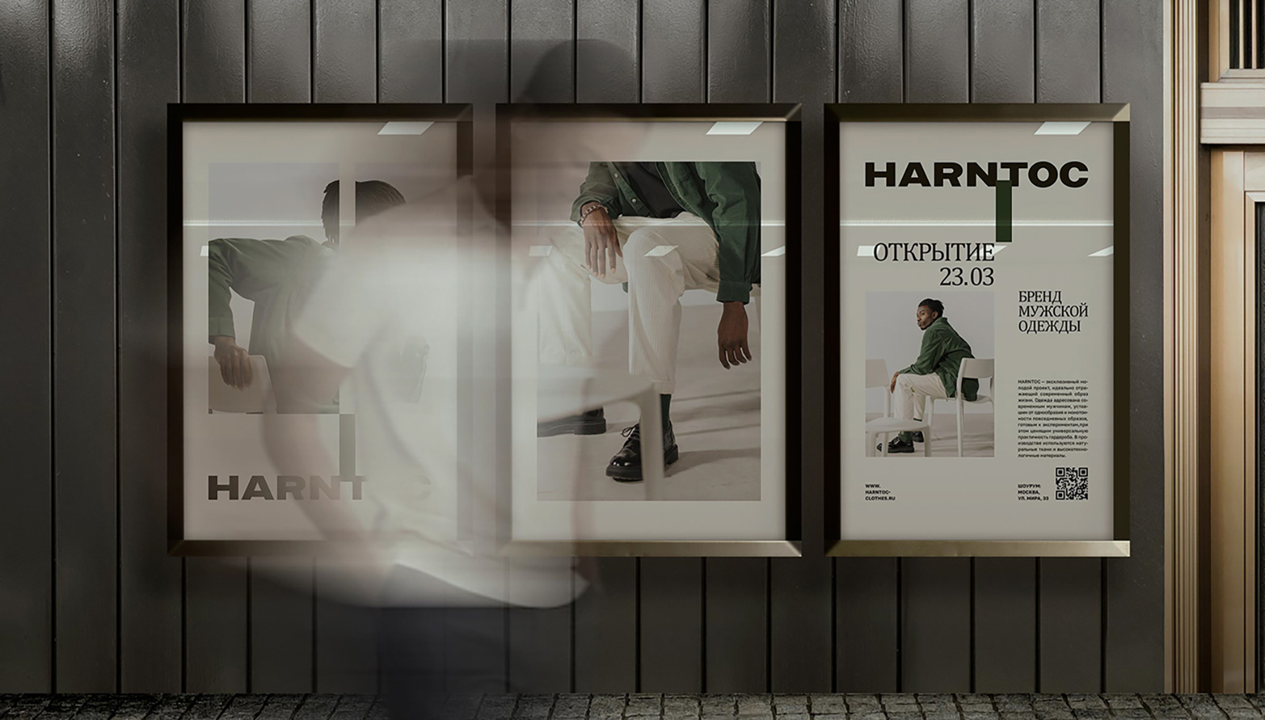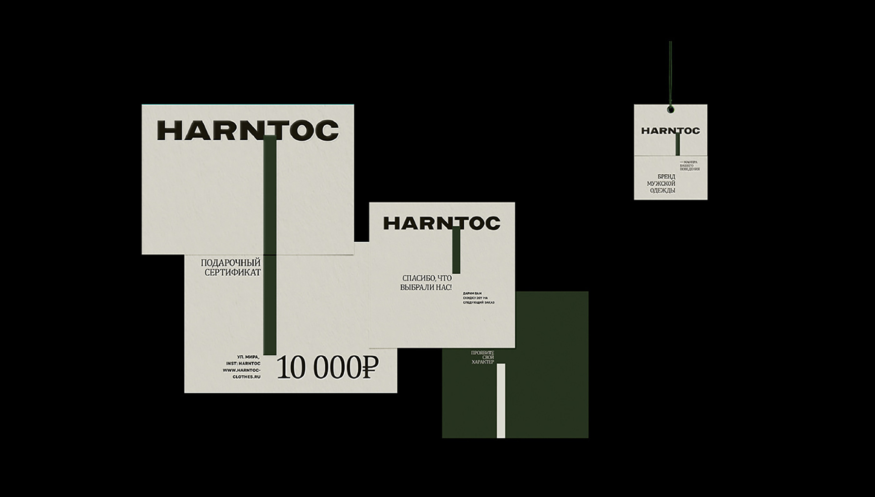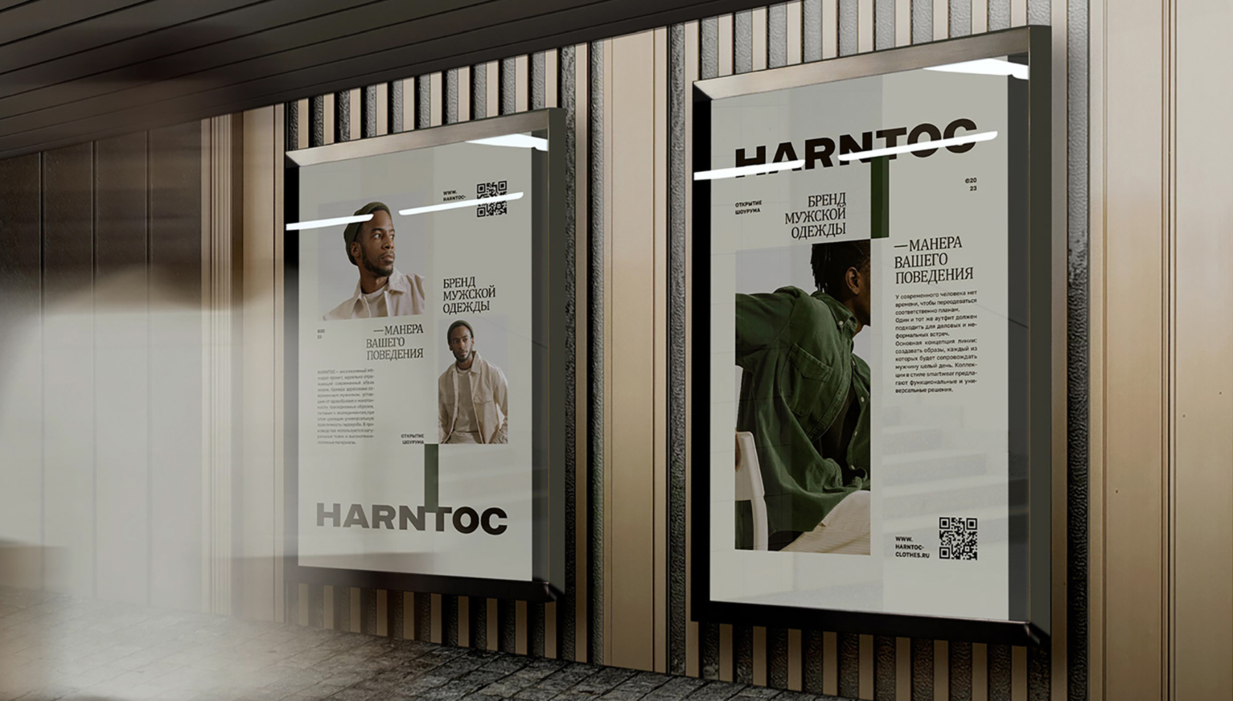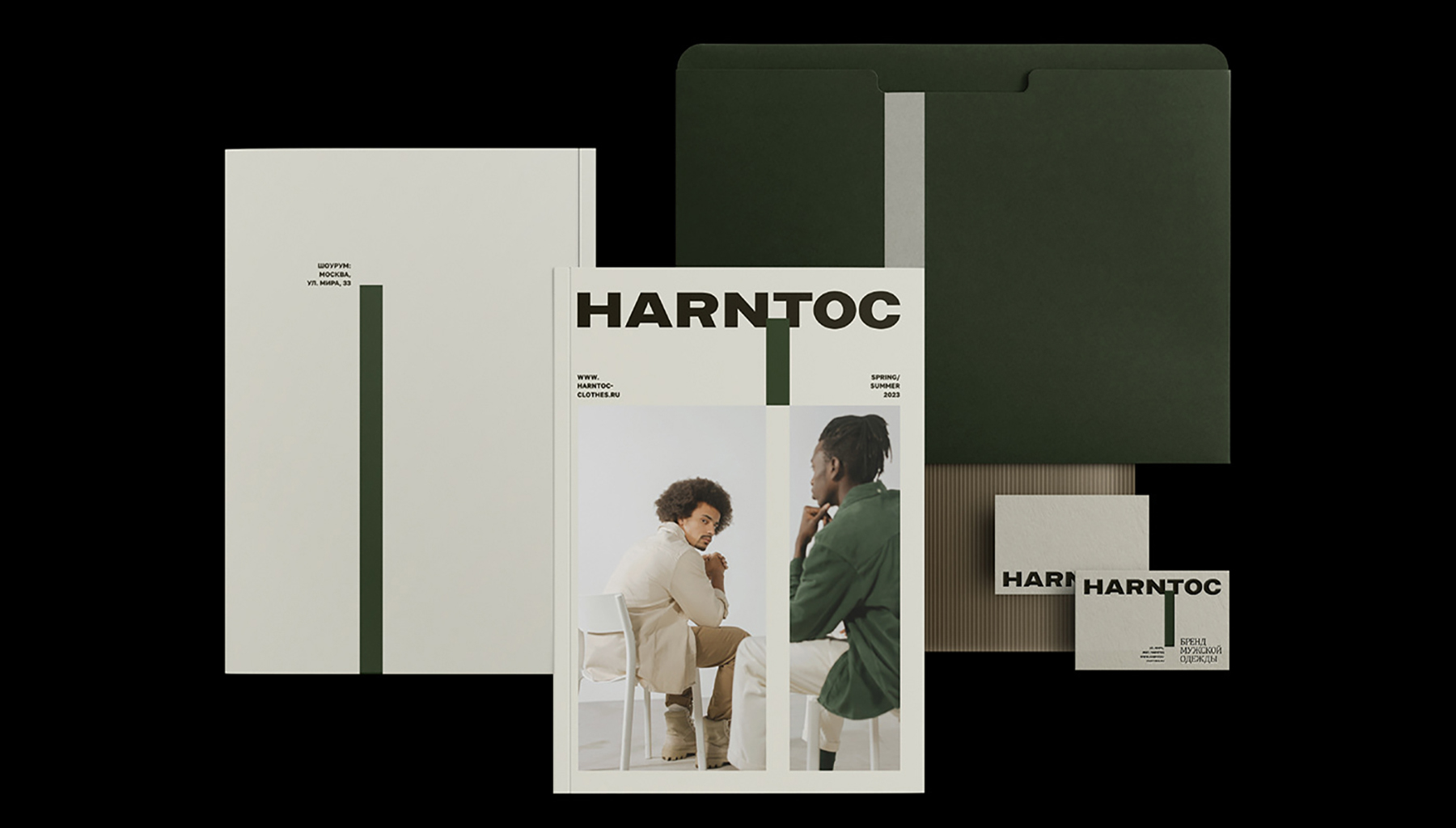 Для бренда был разработан логотип, каждая графема которого носит характер бренда: сила, независимость, свобода, при этом округлые формы ассоциируются с удобством и комфортом одежды HARNTOC.