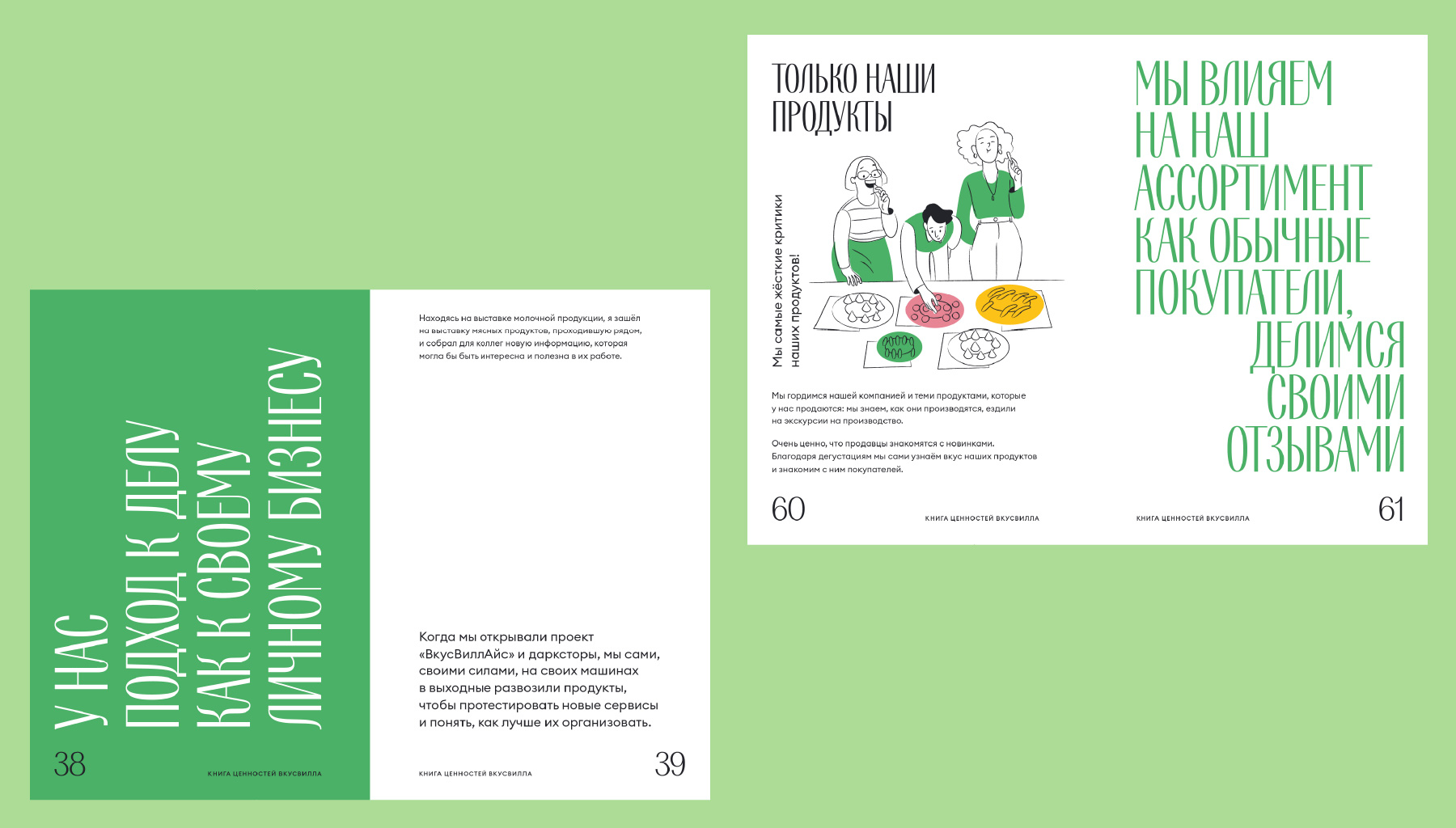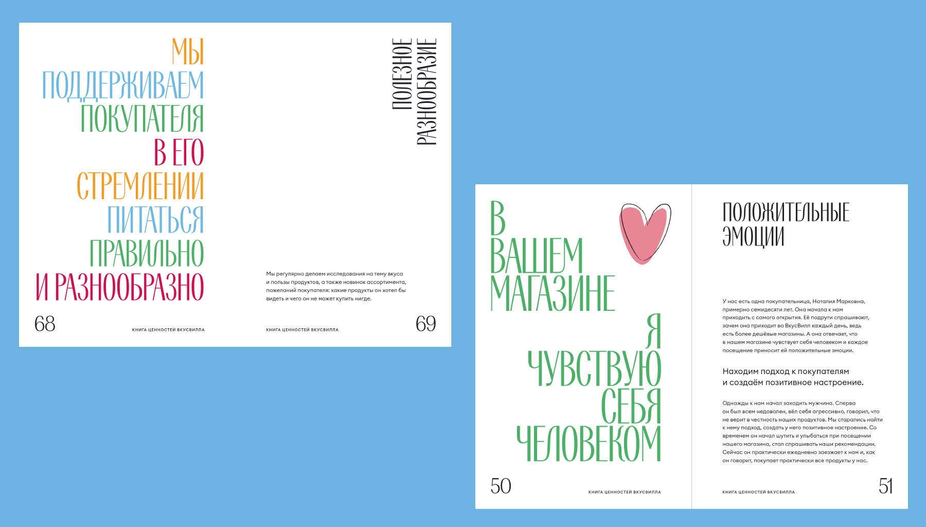Каждая история, рассказанная сотрудниками ВкусВилла в книге ценностей, говорит о том, какие они — сотрудники компании, что для них важно и что им помогает взаимодействовать с покупателями, партнерами и деловым сообществом, работать в команде и достигать блестящих результатов.