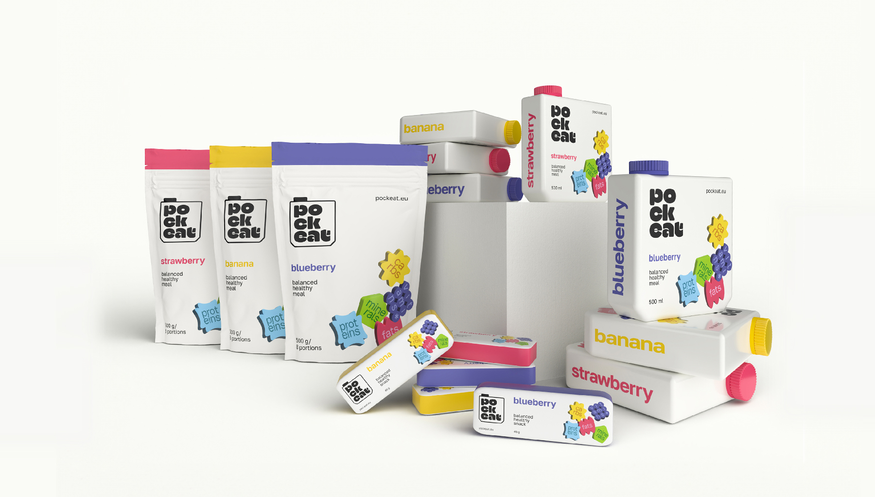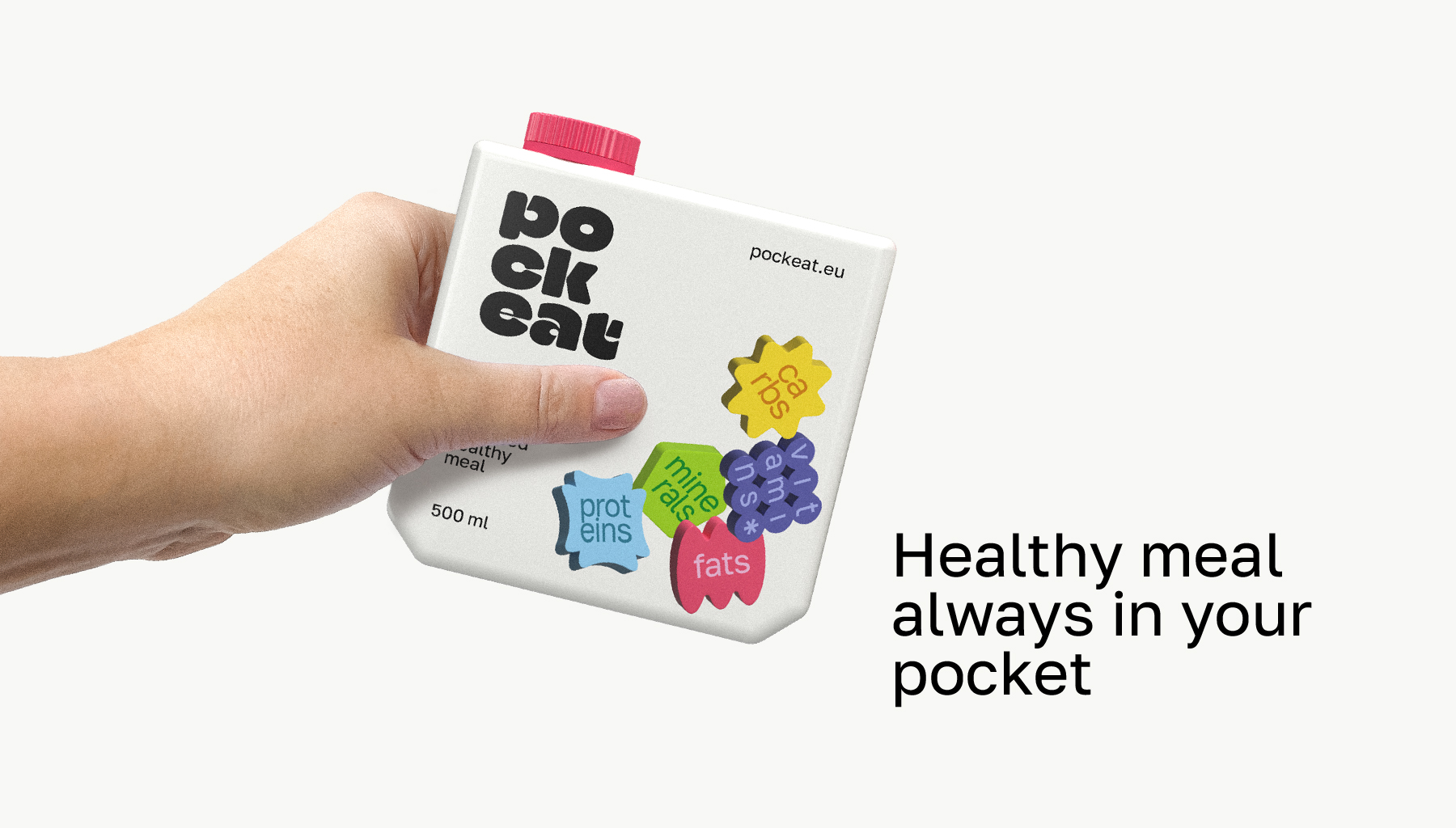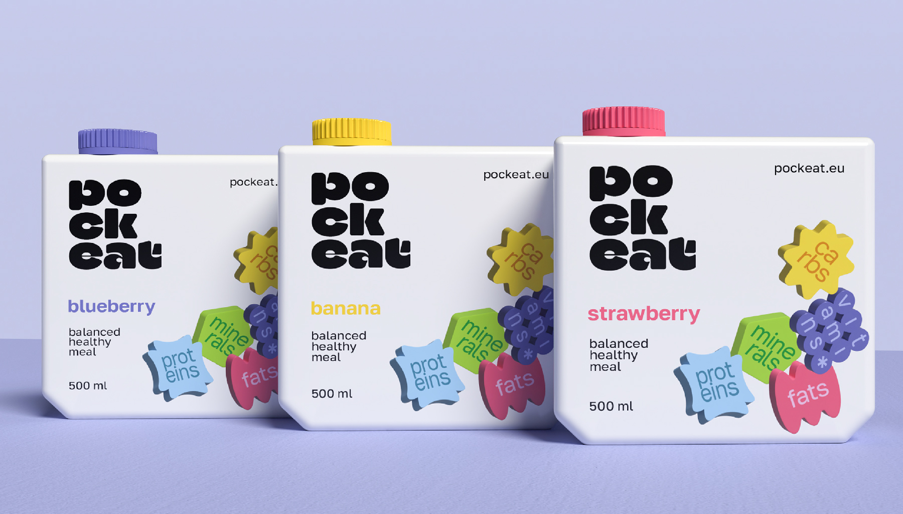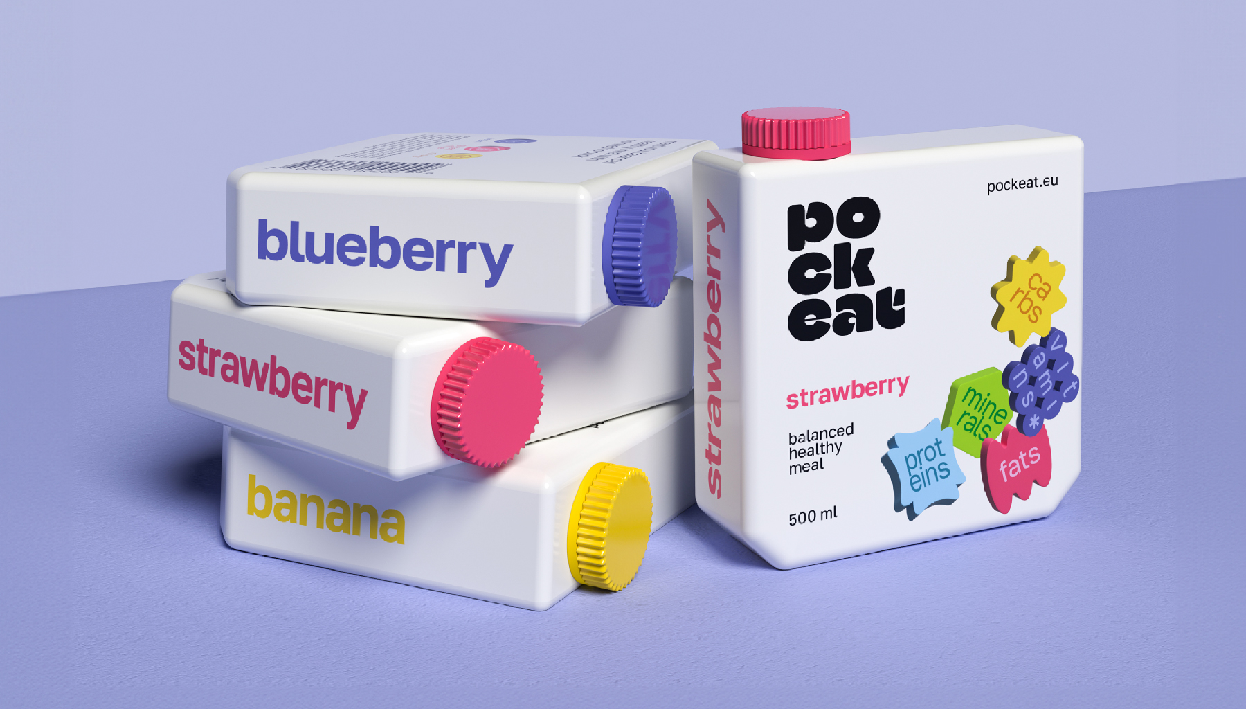 Напиток легко взять с собой, он помещается в карман. Эта идея воплощена в нейминге и дизайн системе бренда. Название pockeat = pocket + eat (карман + еда). Напиток содержит все необходимые элементы, они представлены визуально в виде простых геометричных форм — нутриентов. Геометрические элементы как мелочь в кармане.