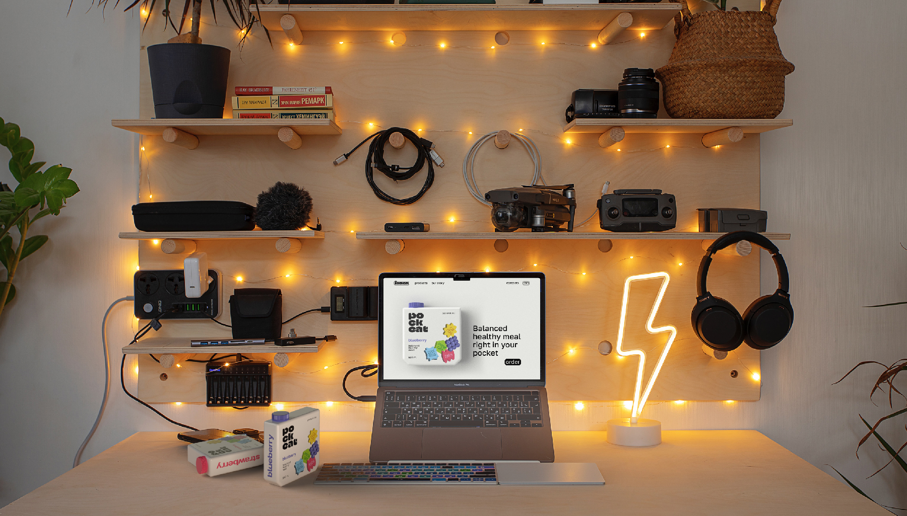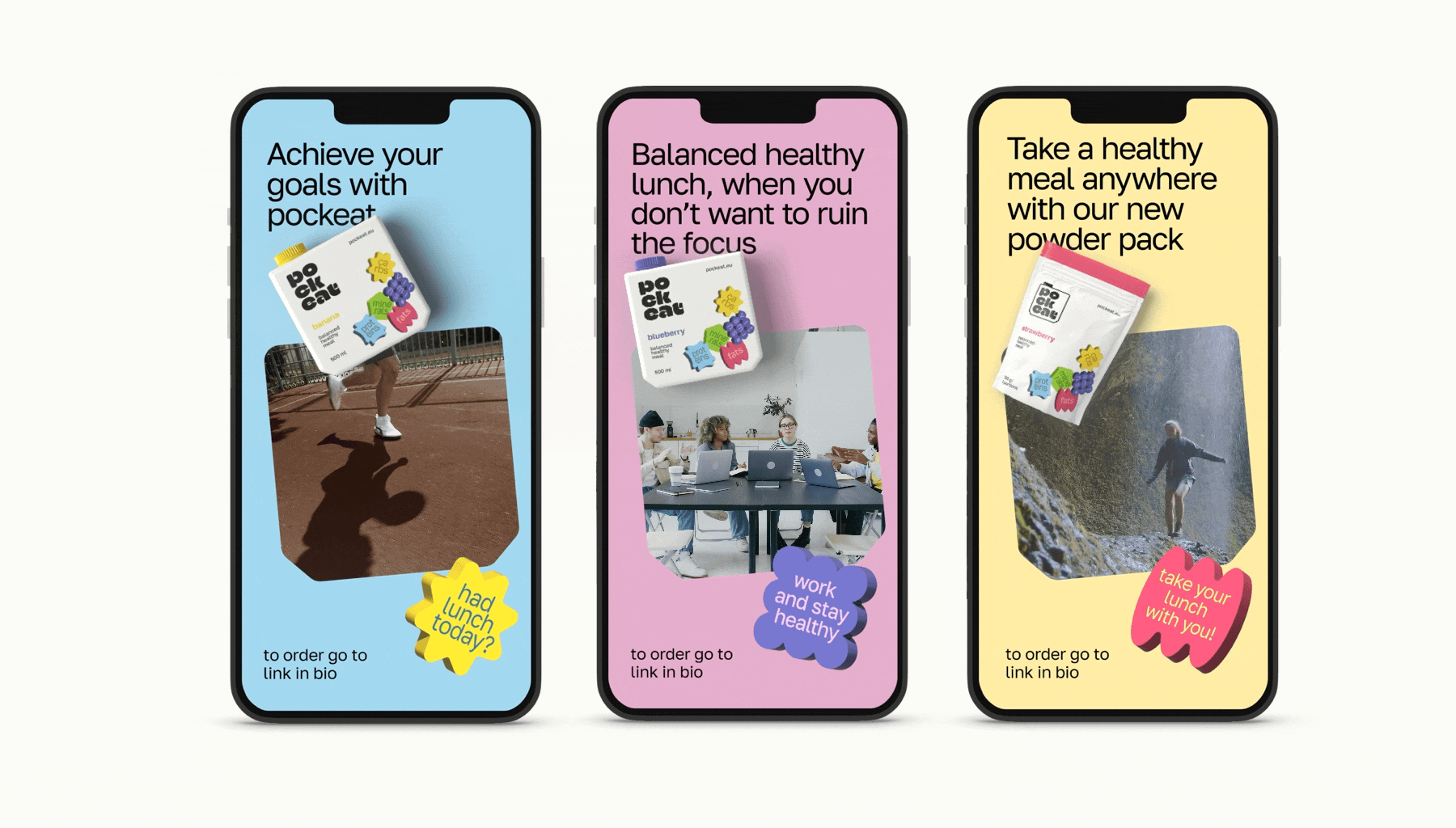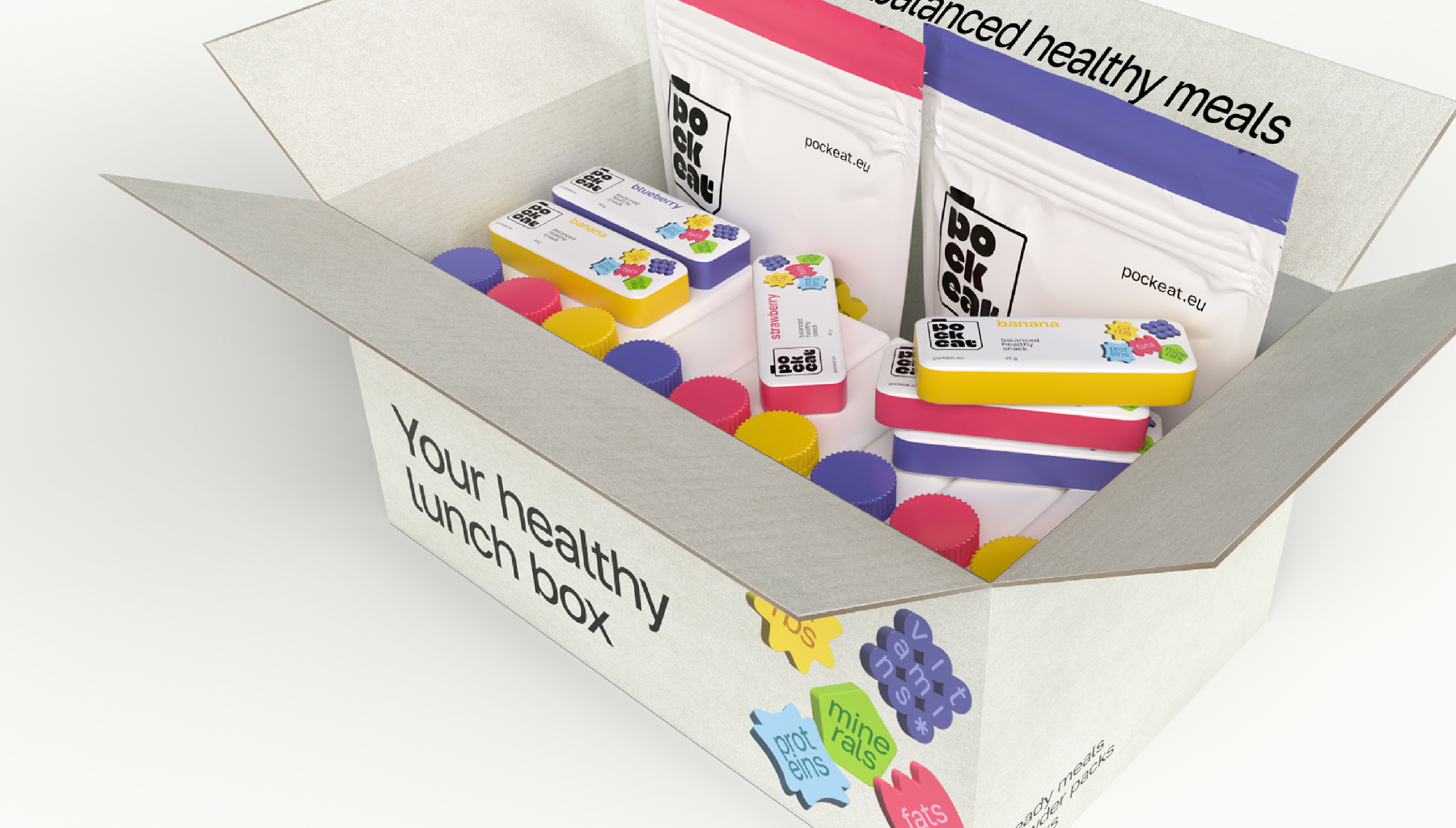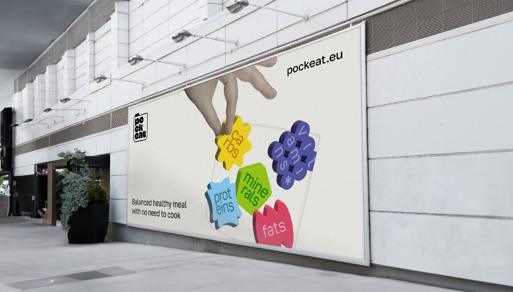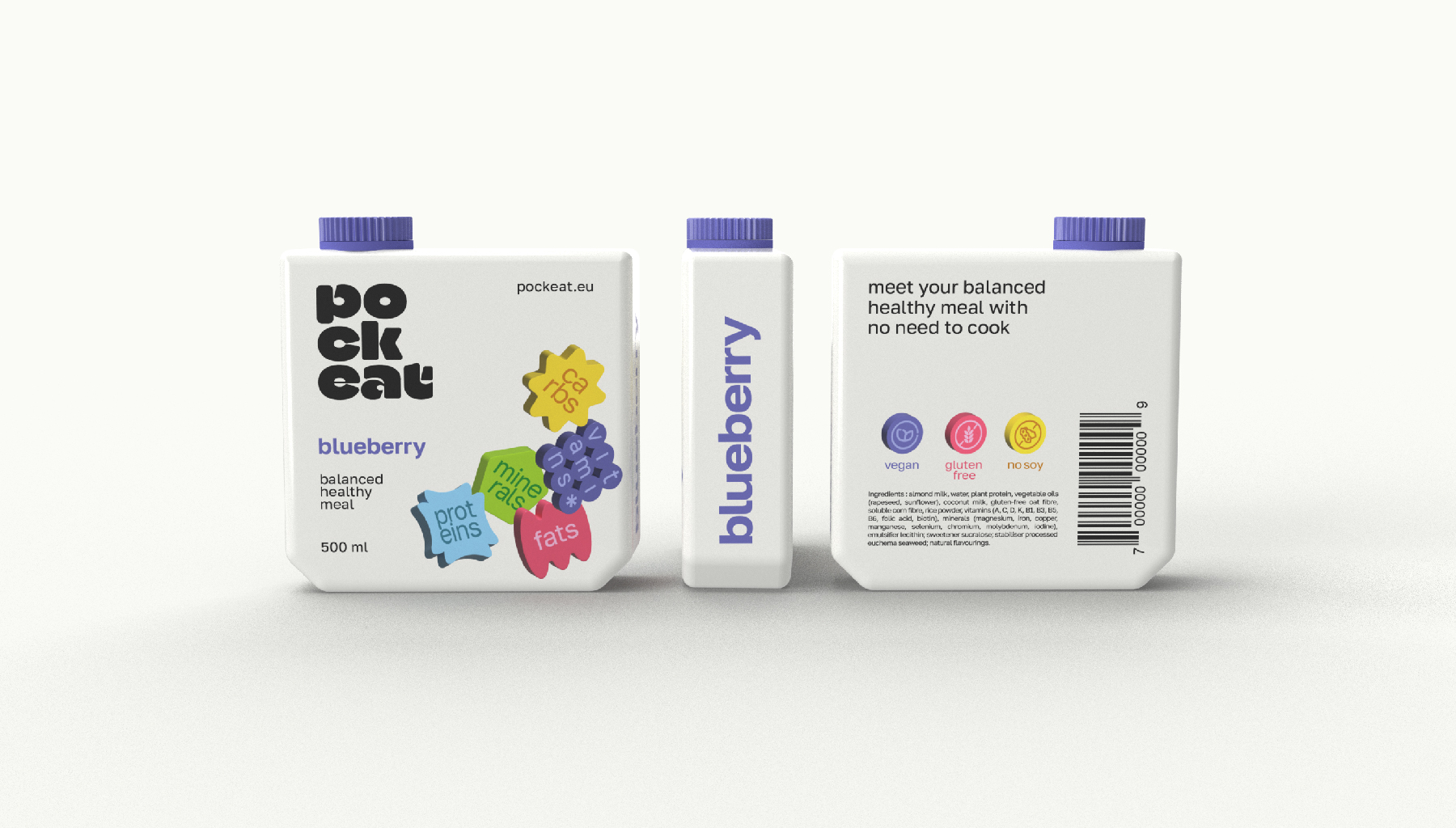 Напиток легко взять с собой, он помещается в карман. Эта идея воплощена в нейминге и дизайн системе бренда. Название pockeat = pocket + eat (карман + еда). Напиток содержит все необходимые элементы, они представлены визуально в виде простых геометричных форм — нутриентов. Геометрические элементы как мелочь в кармане.