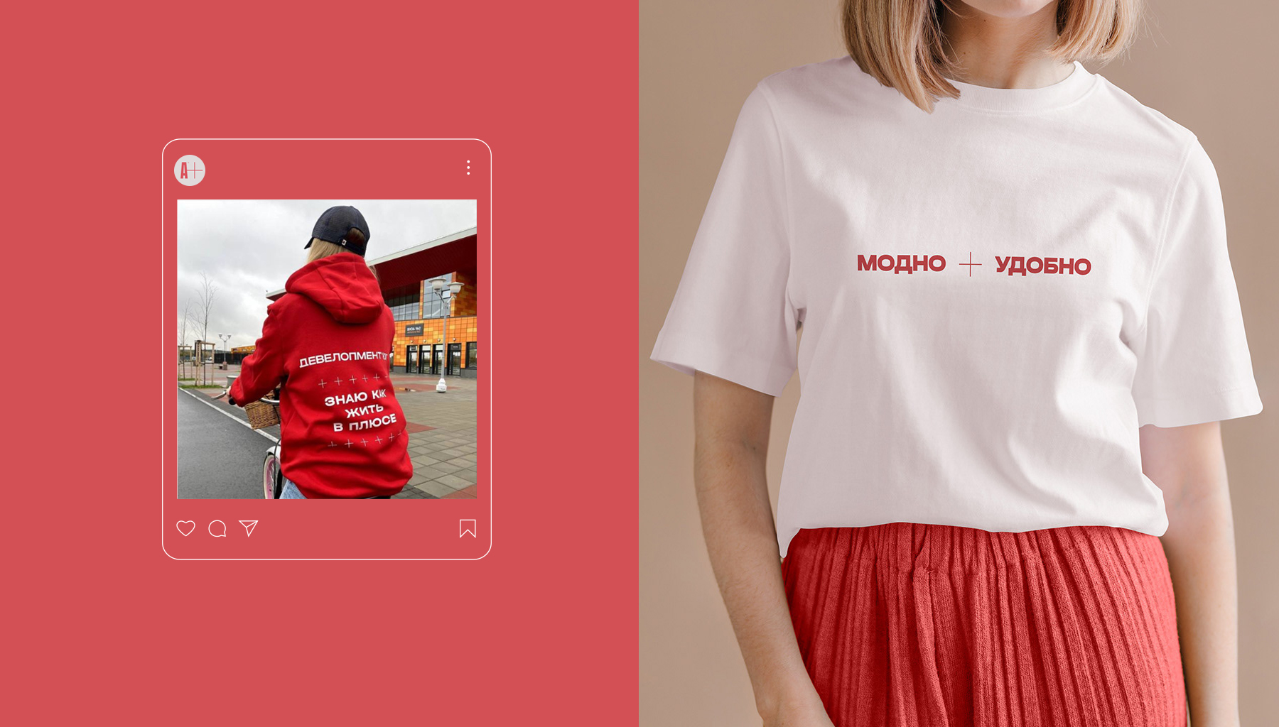 У логотипа 2 версии. Шрифтовая «А ПЛЮС» нужна на старте проекта, чтобы покупатель привык и к названию жилого комплекса, и к логотипу. Основная — «А+». Рекламные посылы мы сложили в паттерн, который можно масштабировать и адаптировать под любой мерч. В будущем клиент сможет выбирать, какие УТП хочет транслировать через мерч. Количество идей безгранично.