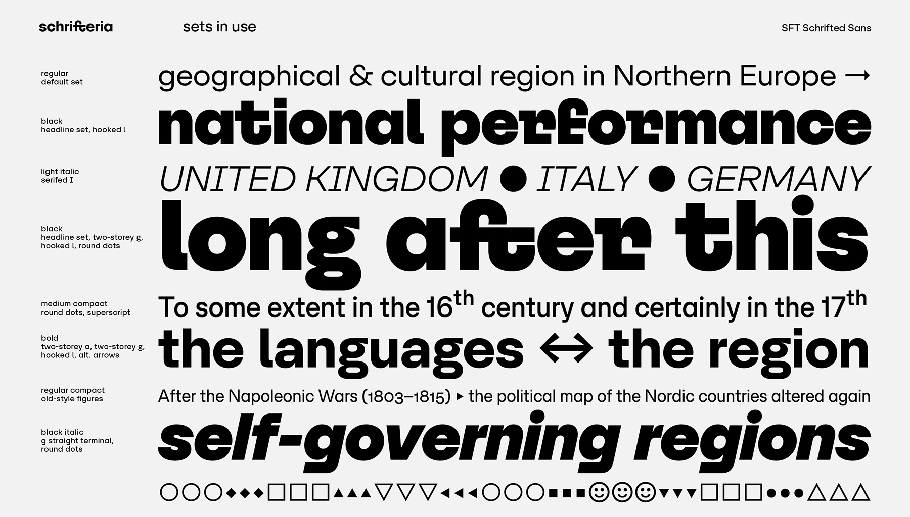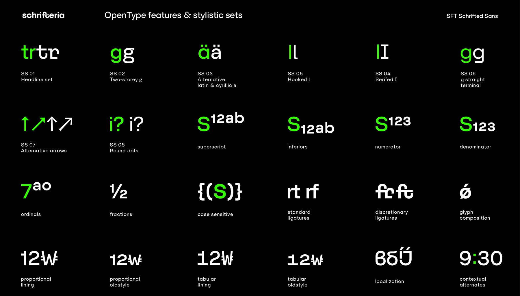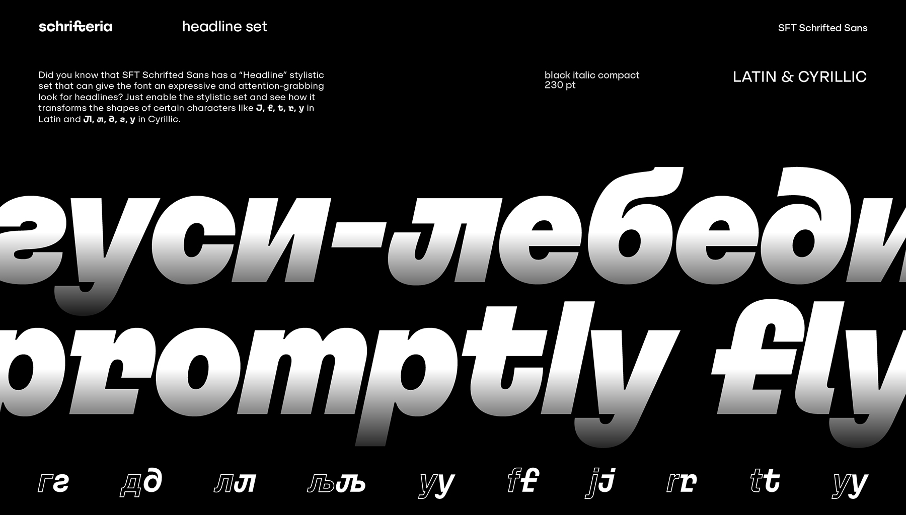 В SFT Schrifted Sans можно найти много стилистических сетов. Самый примечательный из них меняет внешний вид гарнитуры из относительно простого гротеска в дисплейный яркий шрифт.