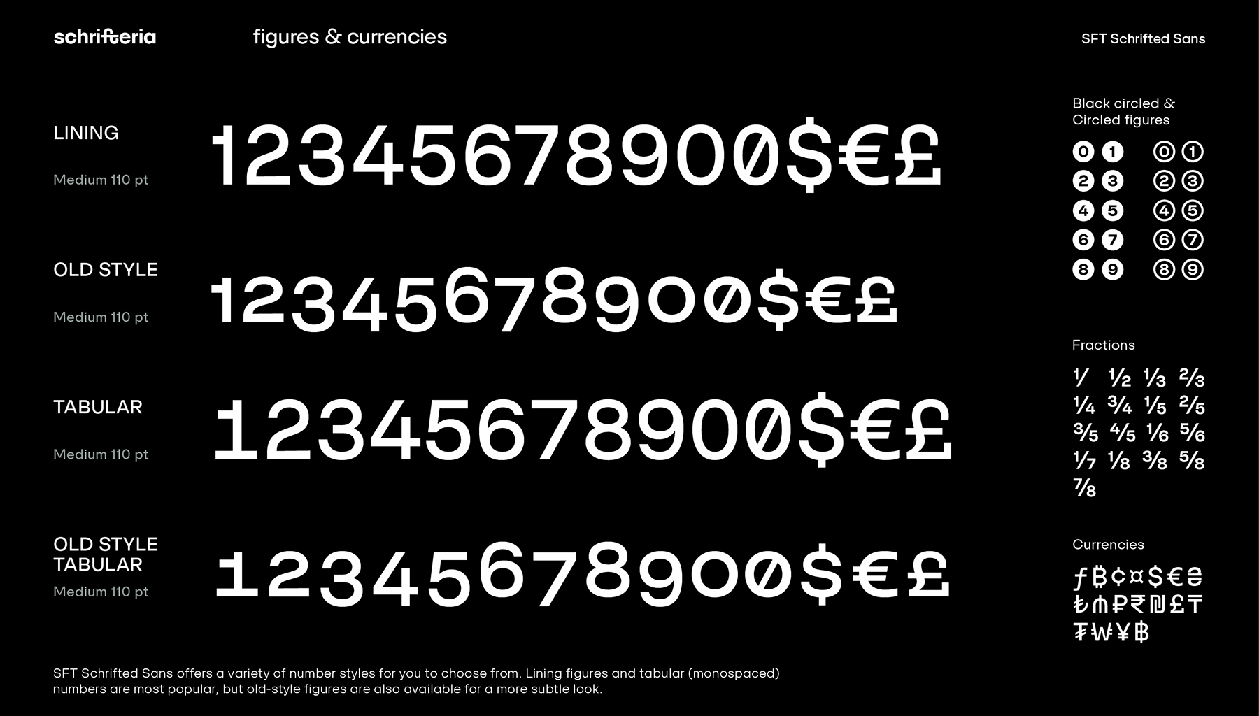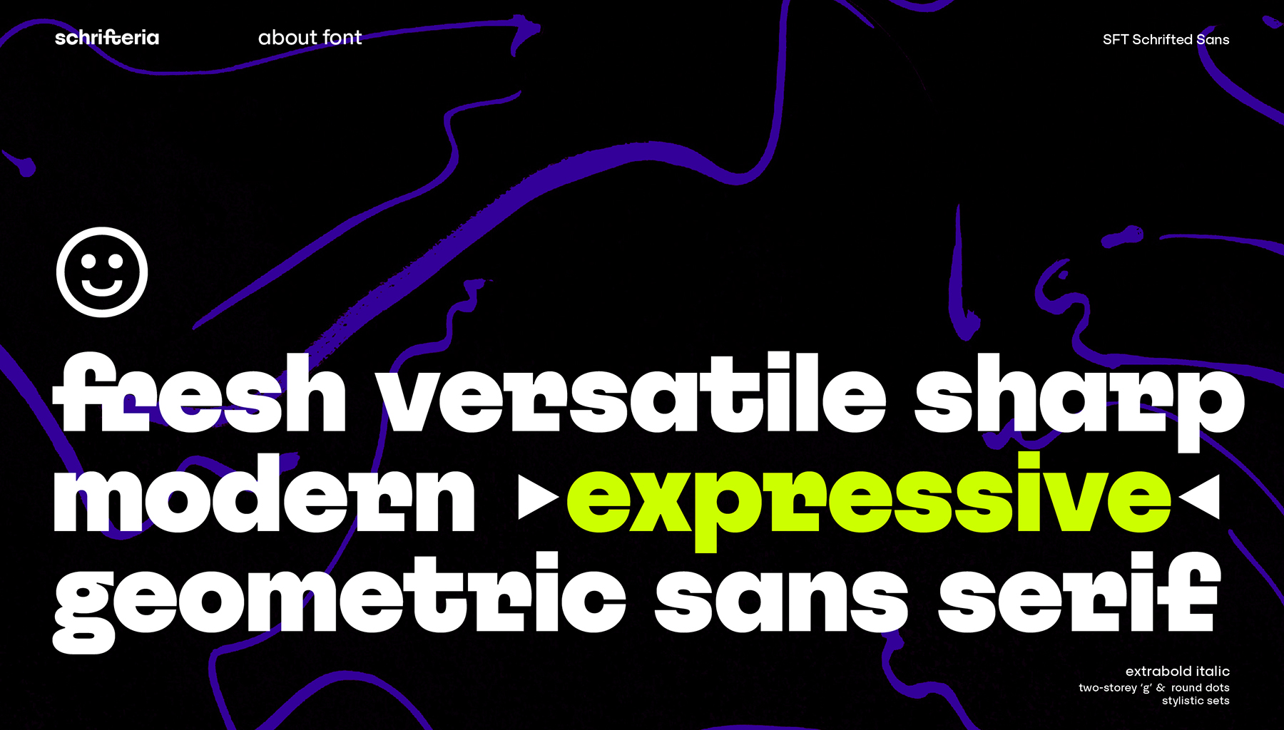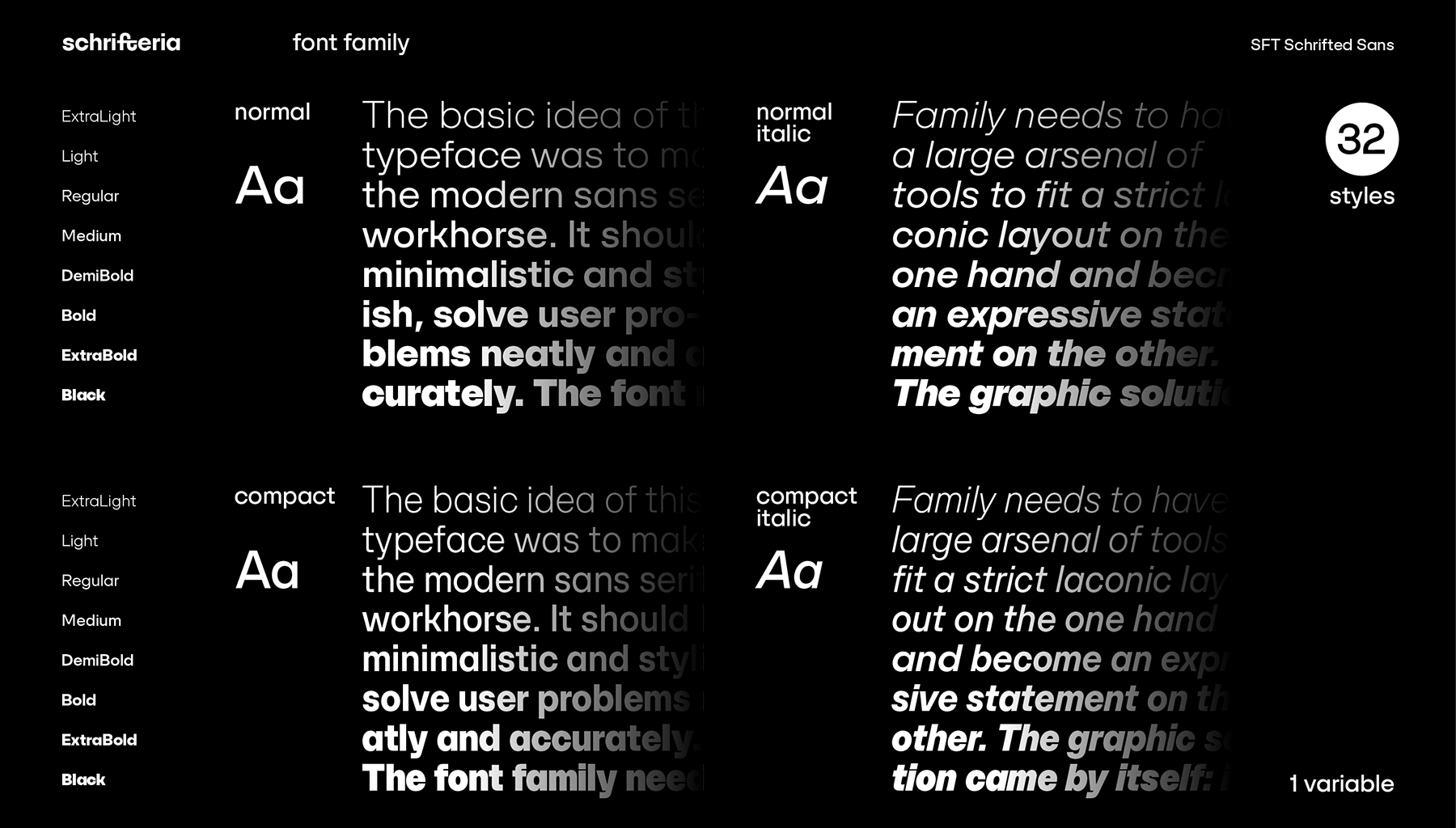 В SFT Schrifted Sans можно найти много стилистических сетов. Самый примечательный из них меняет внешний вид гарнитуры из относительно простого гротеска в дисплейный яркий шрифт.