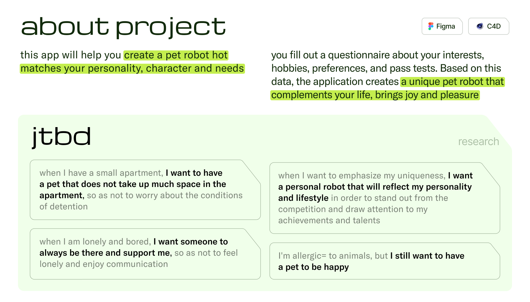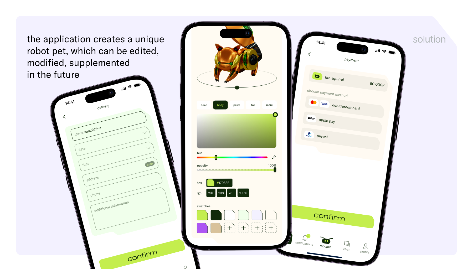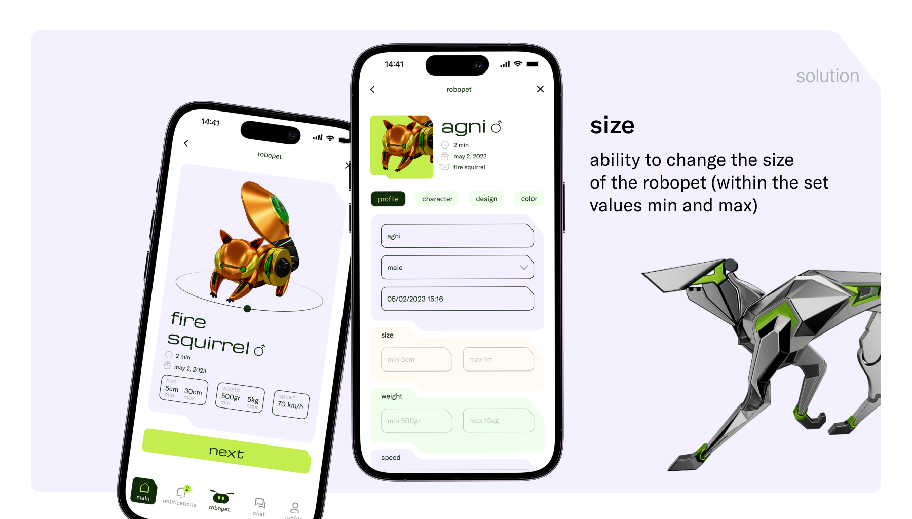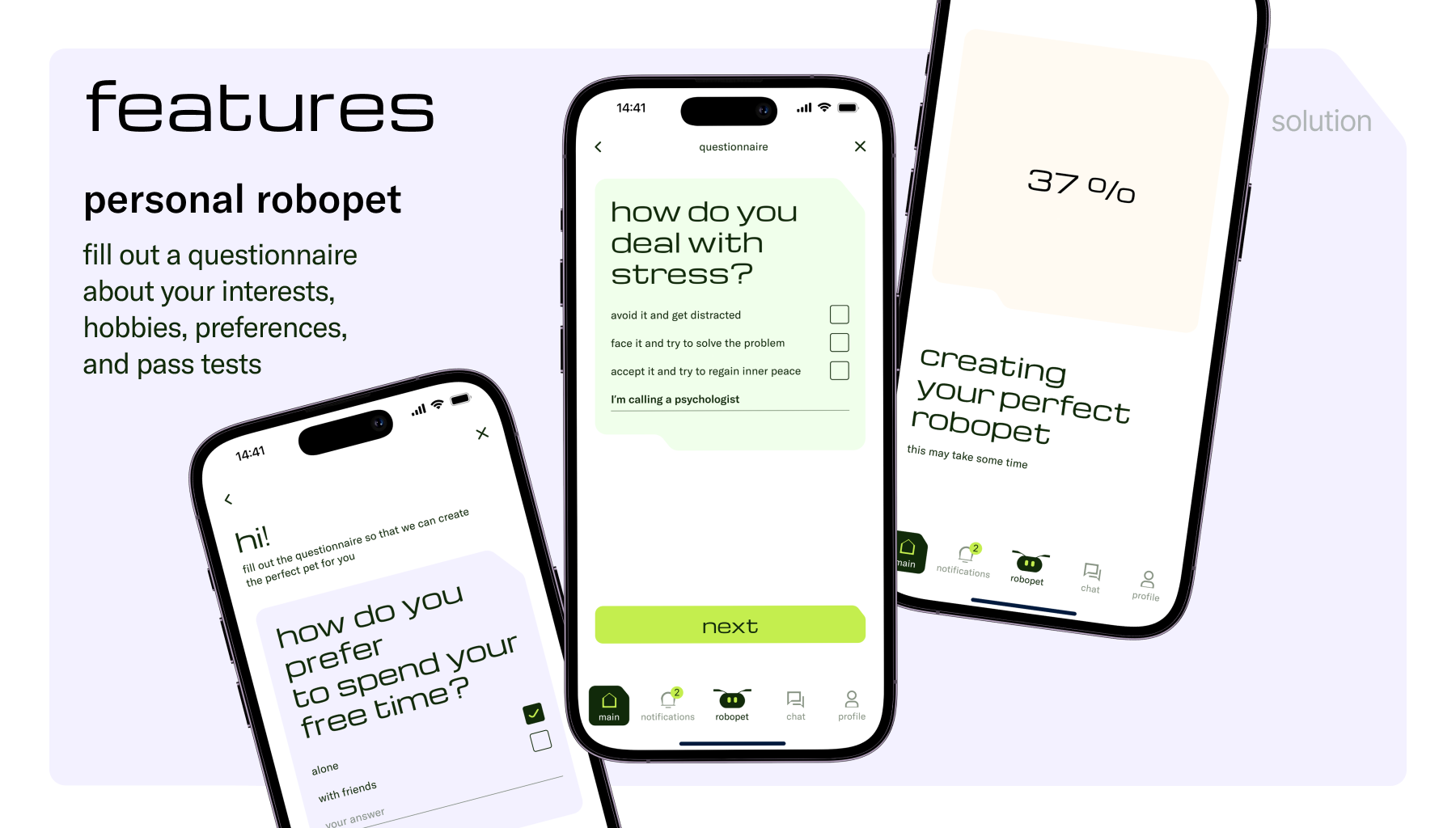 Это приложение поможет вам создать робота-питомца, который будет соответствовать вашей индивидуальности, характеру и потребностям. Вы заполняете анкету о своих интересах, хобби, предпочтениях и проходите тесты. Основываясь на этих данных, приложение создает уникального робота-питомца, который дополнит вашу жизнь, принесет радость и удовольствие.