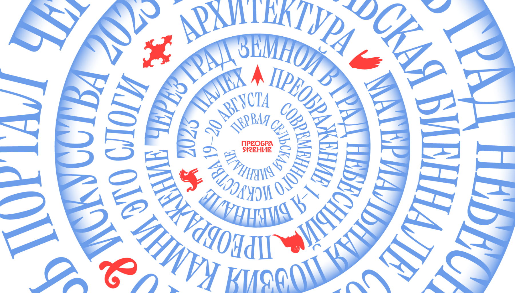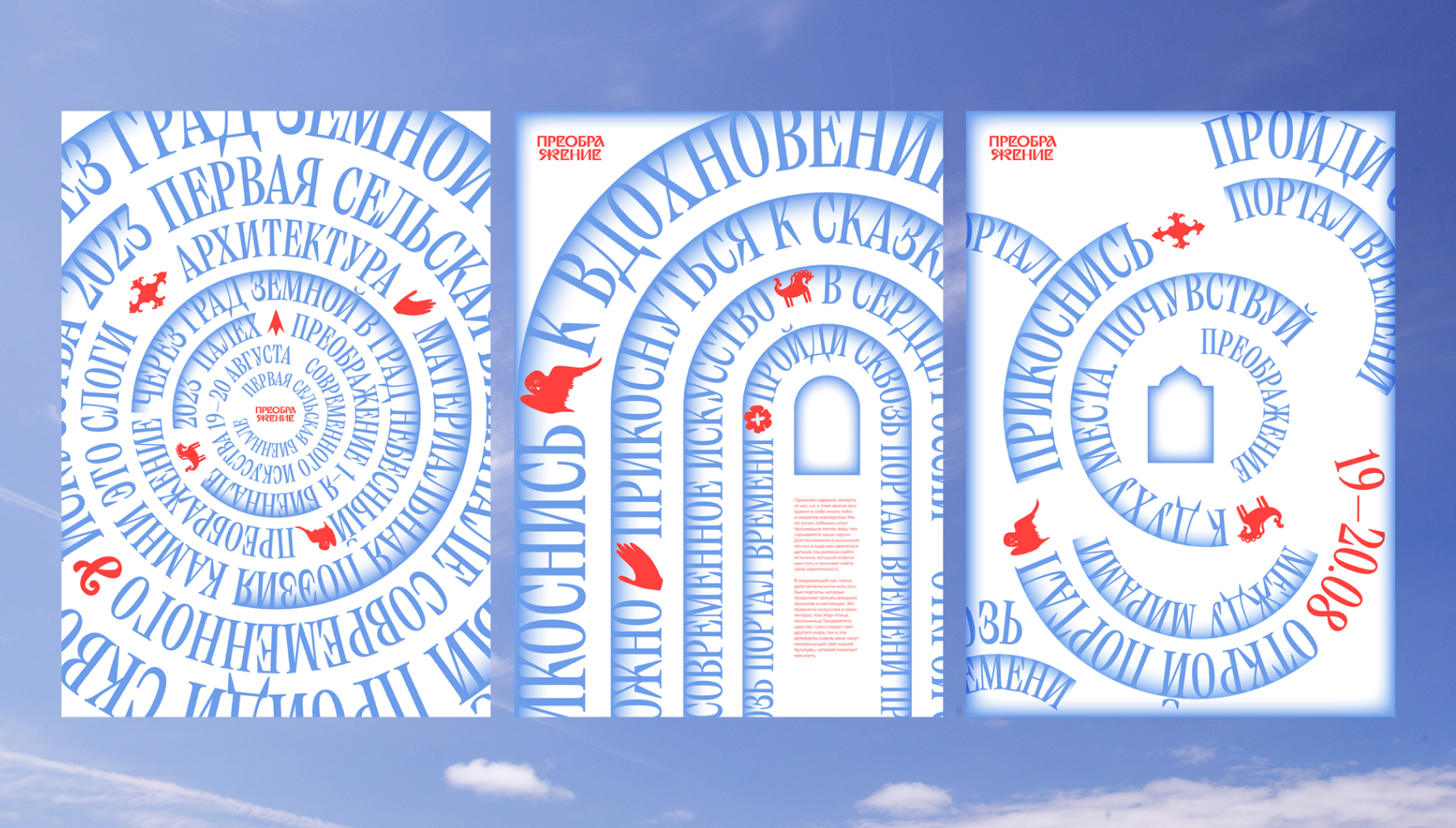 Ключевая метафора фирменного стиля — портал. Как переход между мирами, соединяющий традиционное и современное искусство. Основой визуального стиля стали различные формы порталов и типографика, которая им вторит и разносится в пространстве как колокольный звон. А также иллюстрации, вдохновленные палехской росписью и элементами деревянной архитектуры. Мы рады, что нам удалось передать дух творчества и перевести образ Палеха на новый уровень. Ведь традиции — это передача огня, а не поклонение пеплу.