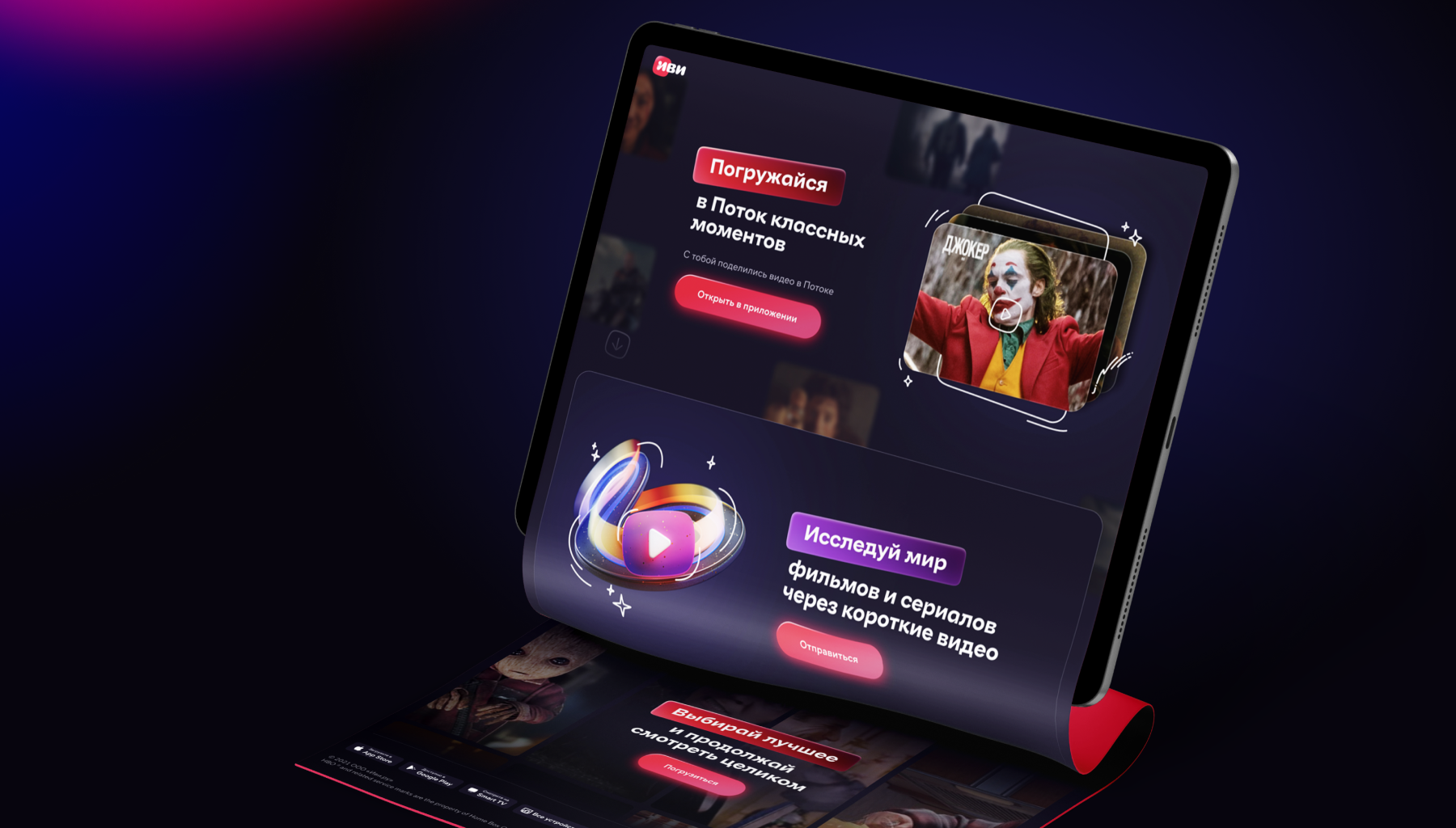 Для погружения в него Иви создал лендинг, который рассказывает о том, как просто находить интересное в Потоке. Под стать самой идее Потока лендинг простой, короткий и увлекающий. Отвечающий основным принципам нового подхода Иви к выбору кино — лёгкому и больше развлекающему, чем утомляющему.