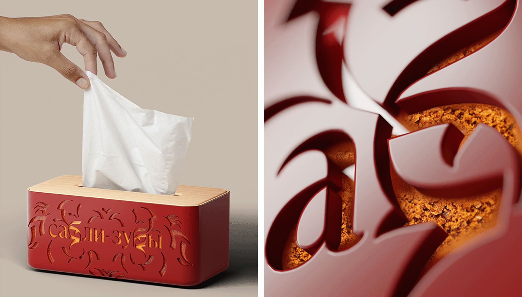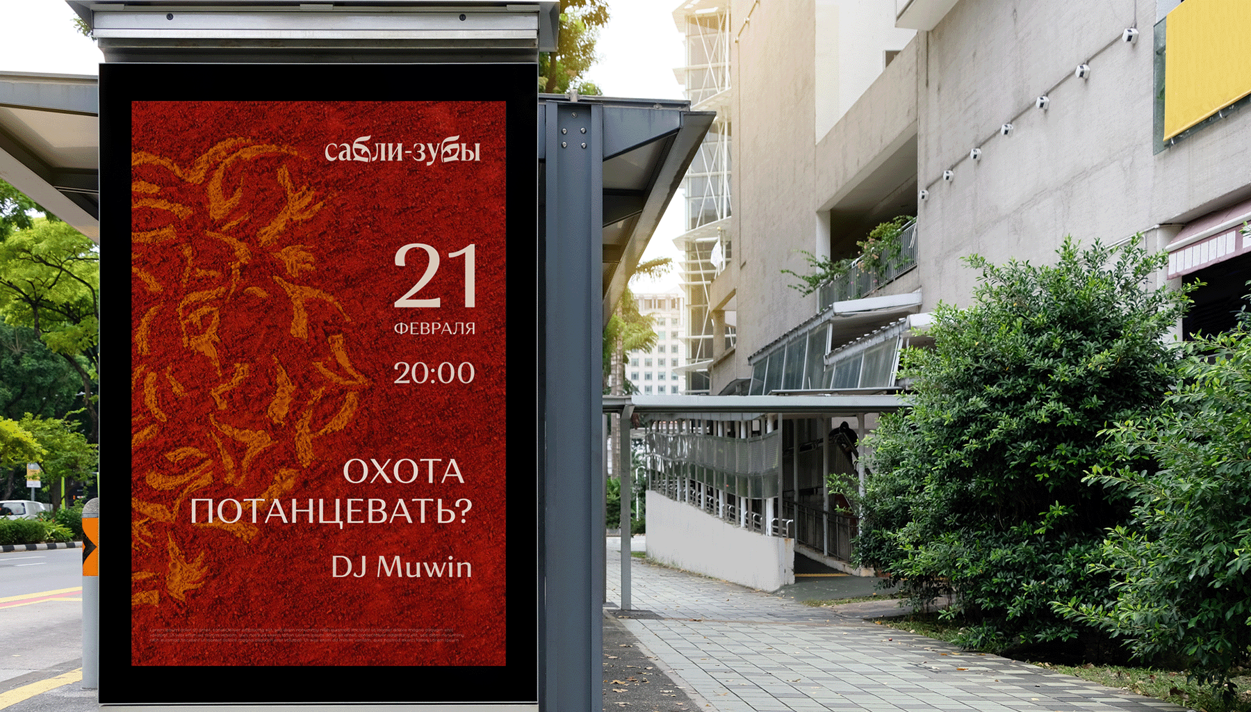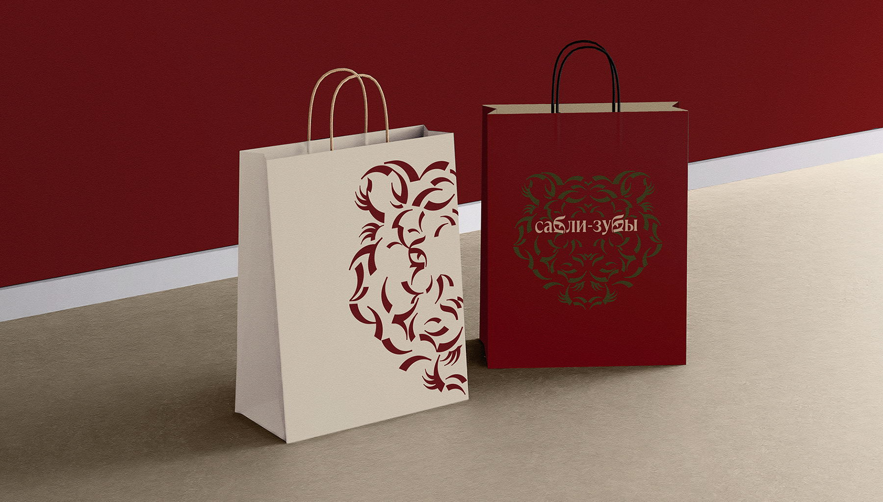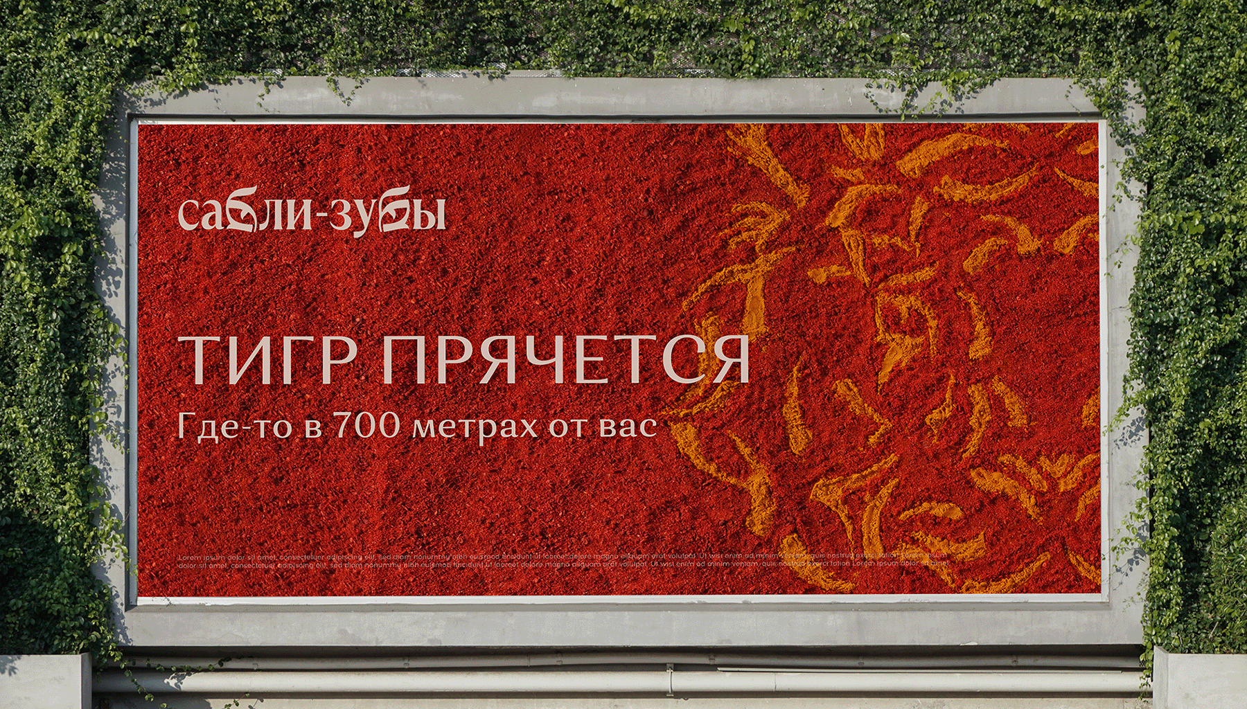 Так буквы «б» в слове «Сабли-зубы» стали глазами хищника, а его черты — вязью паттерна. В этот орнамент заложен потенциал: его можно продолжать, дорисовывая элементы, чтобы спрятать тигра. Когда художница закончила работу, выложила рисунок паприкой и куркумой, мы перевели изображение в вектор и разложили на разные носители. Где-то тигр бросается в глаза, а где-то едва считывается внутри узора.