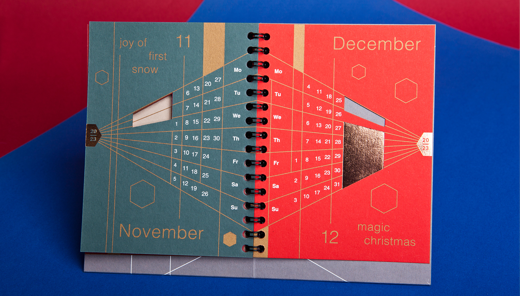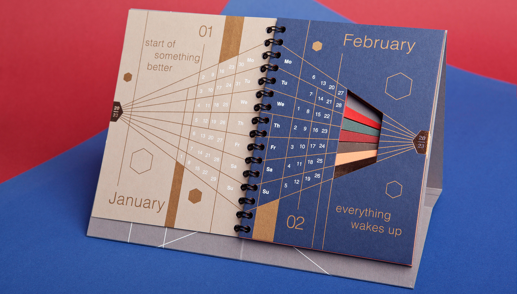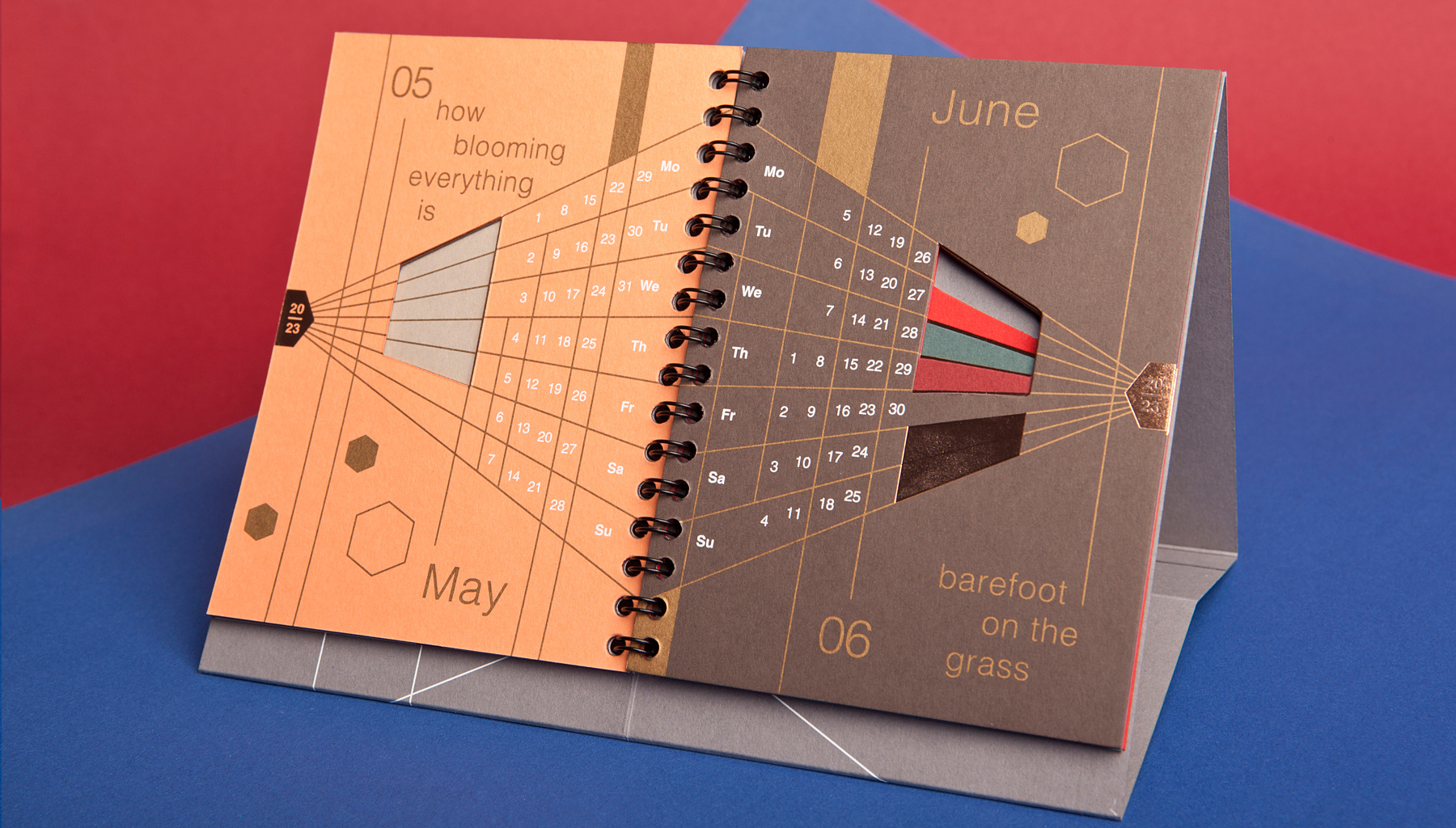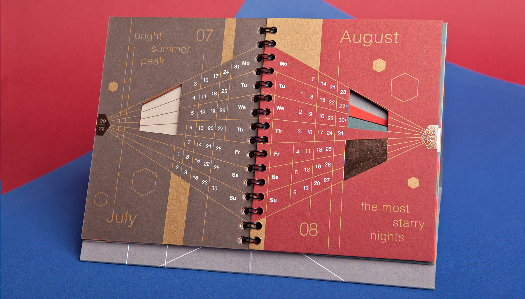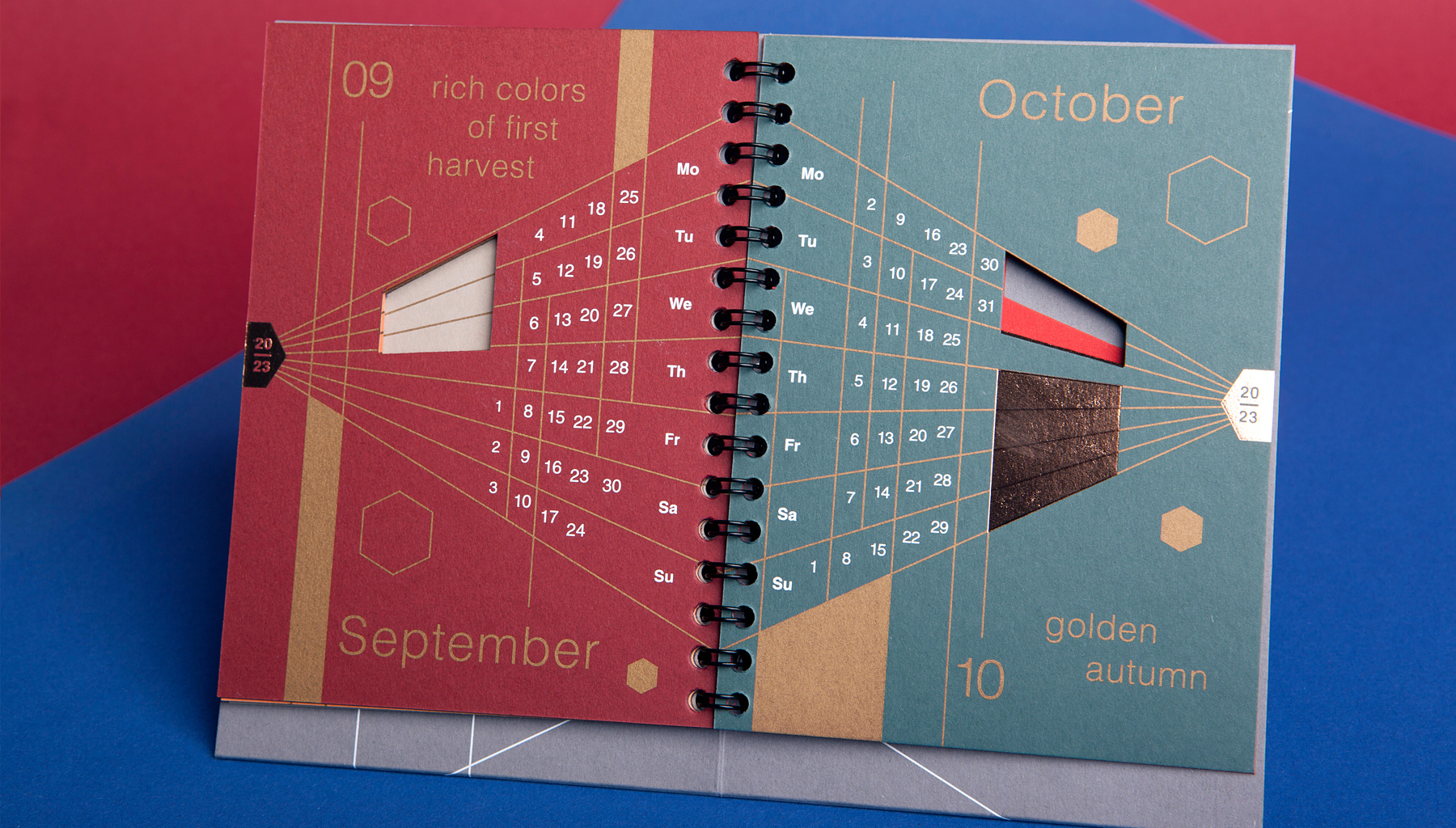 Прикоснитесь к бумаге, посмотрите на ее яркий, нежный или глубокий цвет и вспомните что-то лучшее из своей жизни, фантазируйте и творите. Дизайн и формат календаря разработаны с учетом удобства отправки по почте. При производстве использовалась шелкография - печать белой и бронзовой краской, тиснение фольгой, вырубка и фигурная резка.