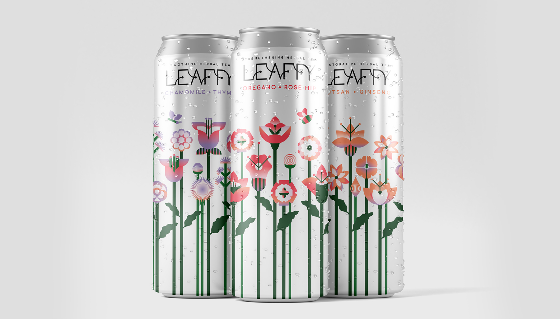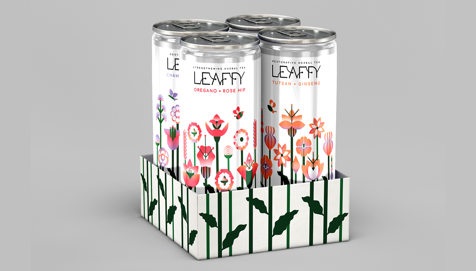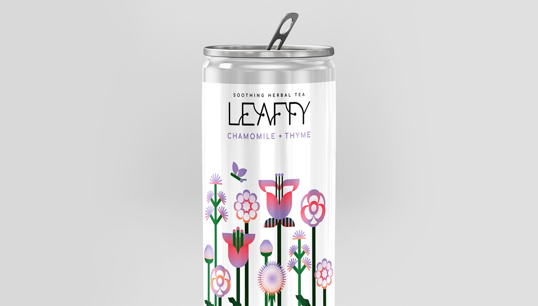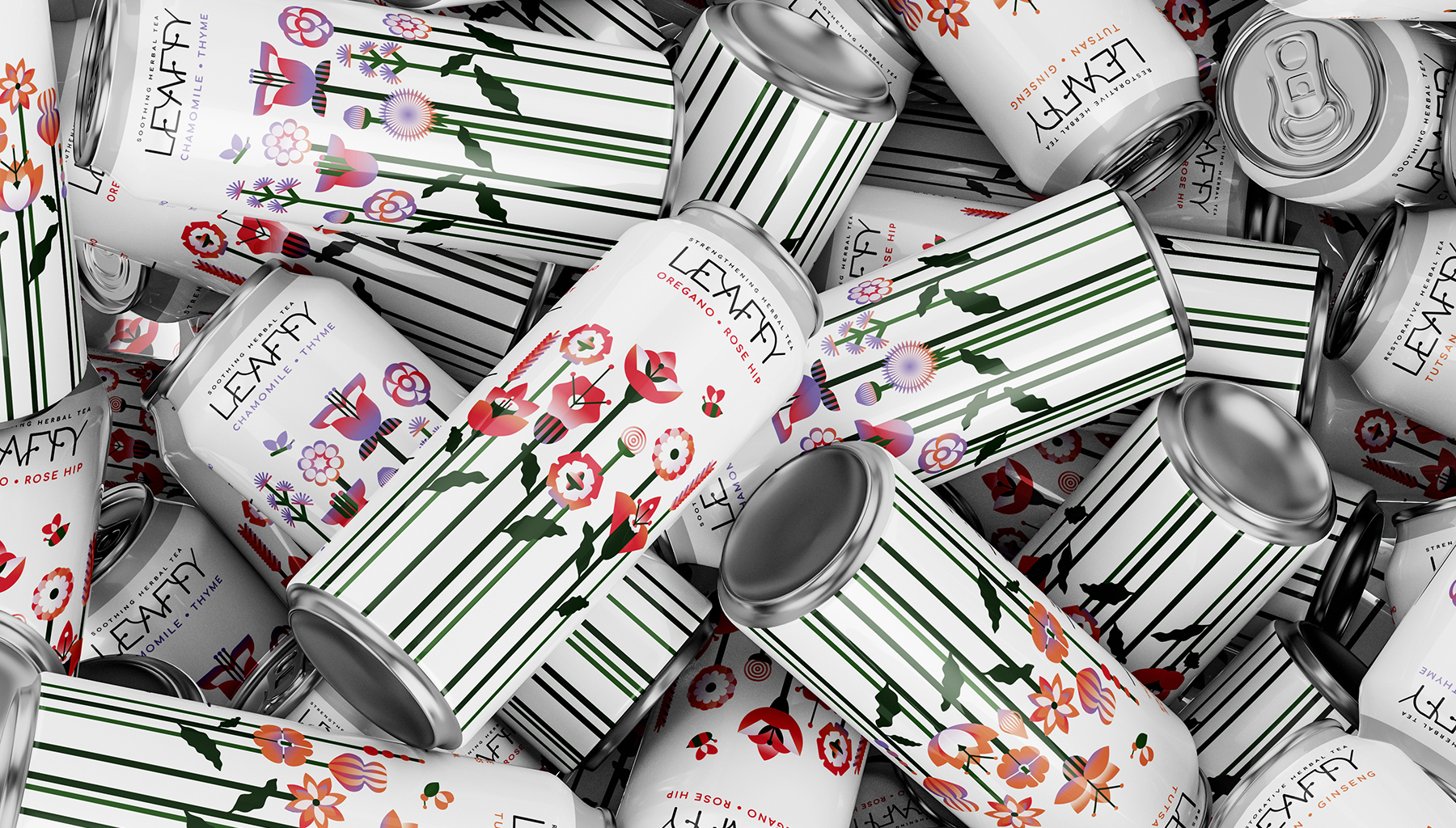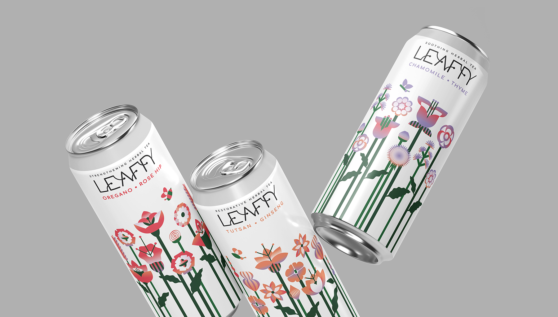 LEAFFY насыщает организм витаминами, укрепляет иммунитет и успокаивает. В линейке напитков три вкуса: душица/шиповник, зверобой/женьшень, ромашка/чабрец. Для каждого из них был создан уникальный графический паттерн. В дизайне используются векторные изображения цветов, отображающих вкус травяного чая.