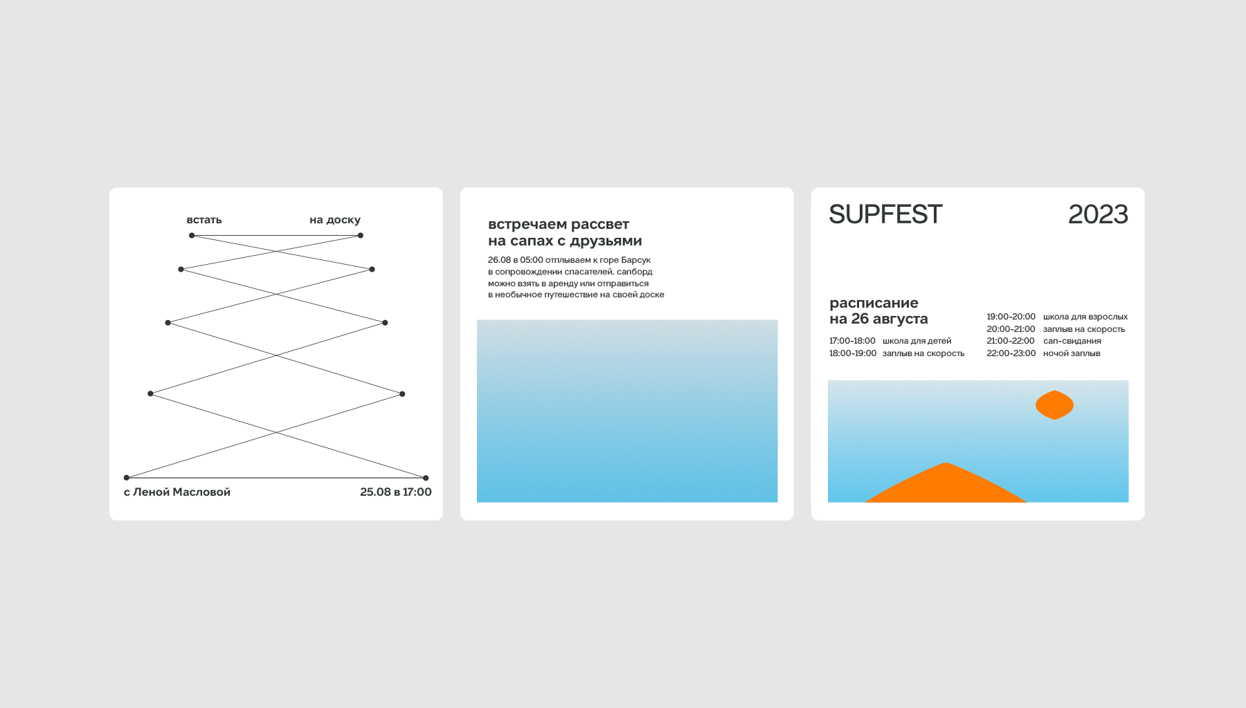В основе айдентики лежит образ сап-досок в моменте заплыва. Одна доска всегда размещена так, будто на ней мы сами. Дополняет стиль шнуровка, которая расположена на верхней части сапборда, для закрепления вещей. Зрителю предлагается «Собирать моменты» в ту самую сетку-шнуровку и двигаться навстречу свободе.