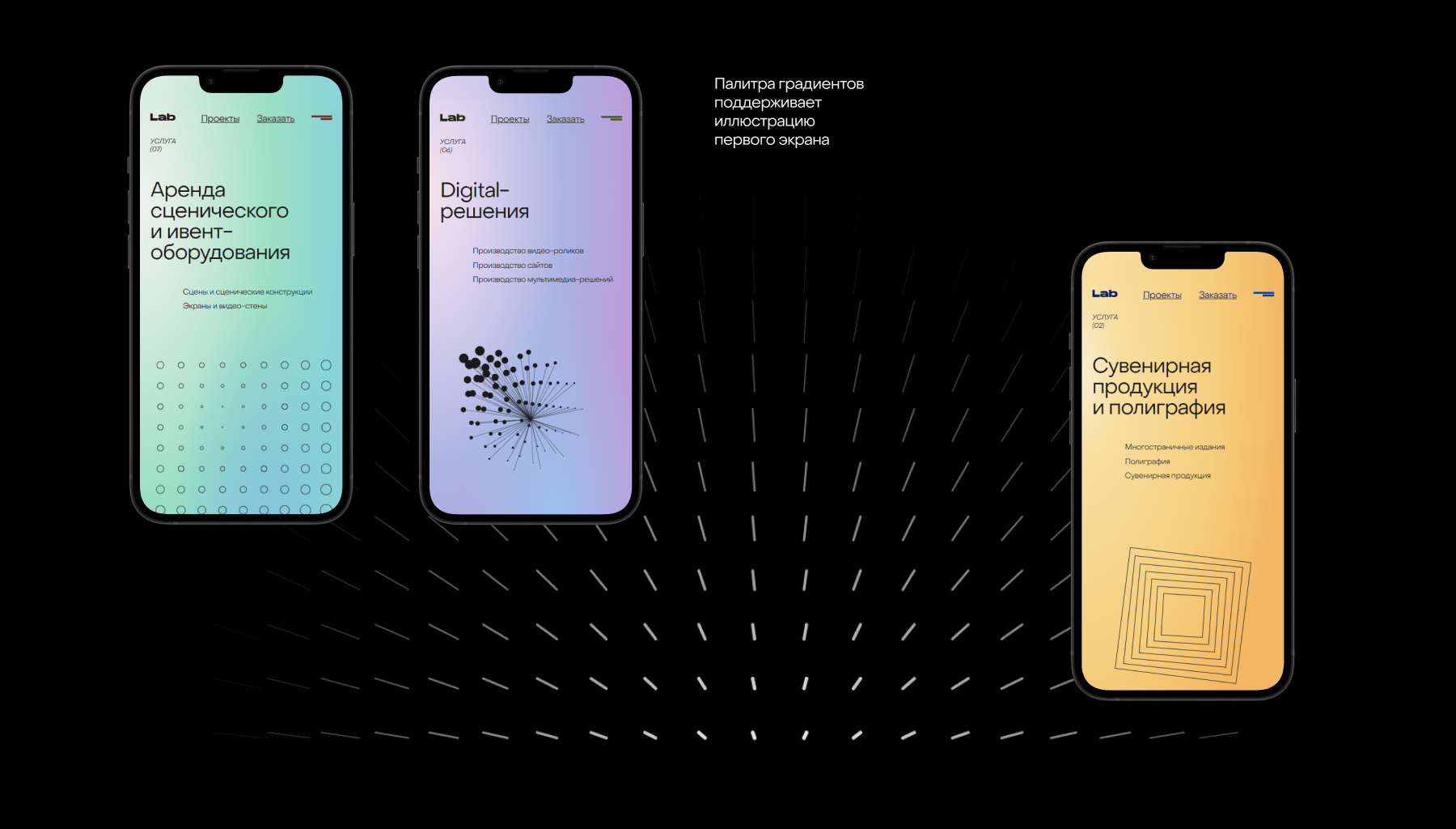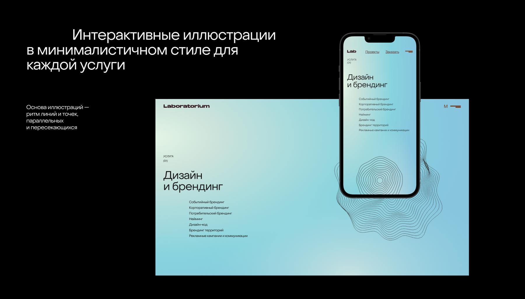 Дизайн опирается на две графические константы по принципу контраста: сочные цвета, градиенты и графичные формы. Завораживающие интерактивные графические иллюстрации используются для разделов услуг — интересное взаимодействие для пользователей. Протестируйте их все в разделе «Услуги».