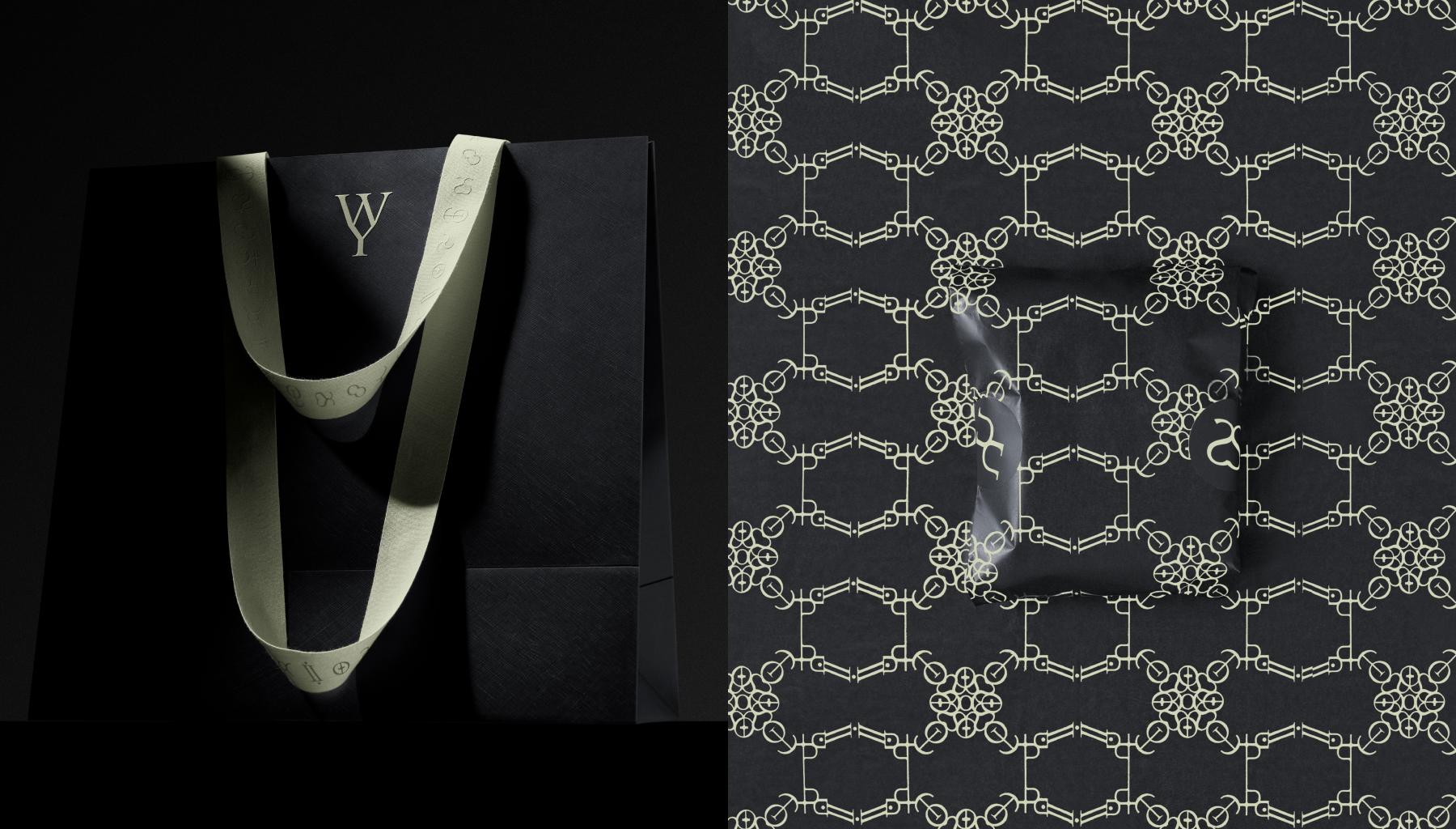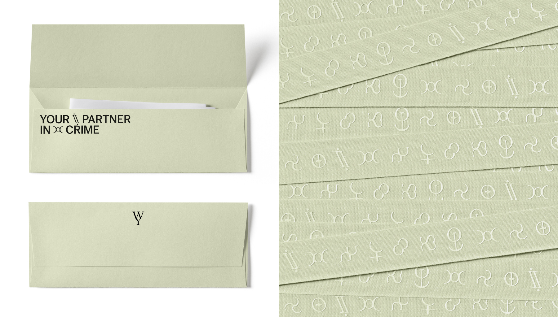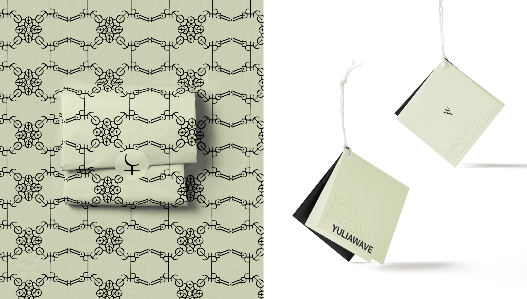 Разный характер YULIAWAVE проявляется уже в сочетании грубых гротескных графем логотипа и антиквенной монограмме YW, где рядом плавные изгибы и строгие формы. YULIAWAVE — одновременно громкий убедительный манифест и тихий закадровый голос, озвучивающий внутренний монолог героини. Функциональные сообщения набраны CoFo Gothic Medium в контрастных цветах, а тайные послания — CoFo Gothic Medium в деликатной палитре. Логотип выделяется в соотношении с толщиной штрихов функциональных сообщений и, наоборот, отдает внимание более жирным штрихам тайных посланий с архаичной символикой. Девять символов формируют систему, где им назначены черты характера YULIAWAVE, соответствующие каждой букве названия бренда. Визуально они дополняют загадочную сторону, и вместе с тем с — смелую и решительную, когда соединяются в паттерн с узором «кольчуги».