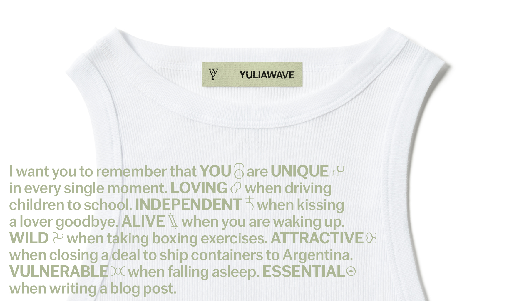 YULIAWAVE — созданная в 2014 году марка одежды, уравновешивающая чувственность и силу современной женщины. Вместе с Юлией мы разработали стратегию и визуальную систему, которая акцентирует стремление YULIAWAVE быть влиятельной фигурой в актуальной женской моде — объединять в своих коллекциях эстетику и смелость, давать свободу самовыражения и помогать восхищать естественностью.