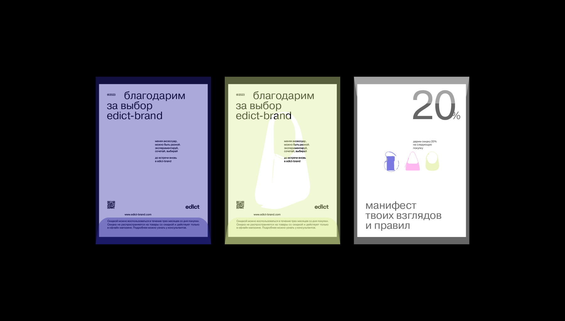 «Edict» – сокращение от латинского слова edictum, что в переводе означает провозглашение, указ. Сумки и аксессуары Edict – это тоже своего рода провозглашение, манифест характера и взглядов. Одежда и обувь могут быть лаконичными и спокойными, но именно сумка станет ярким центром образа.