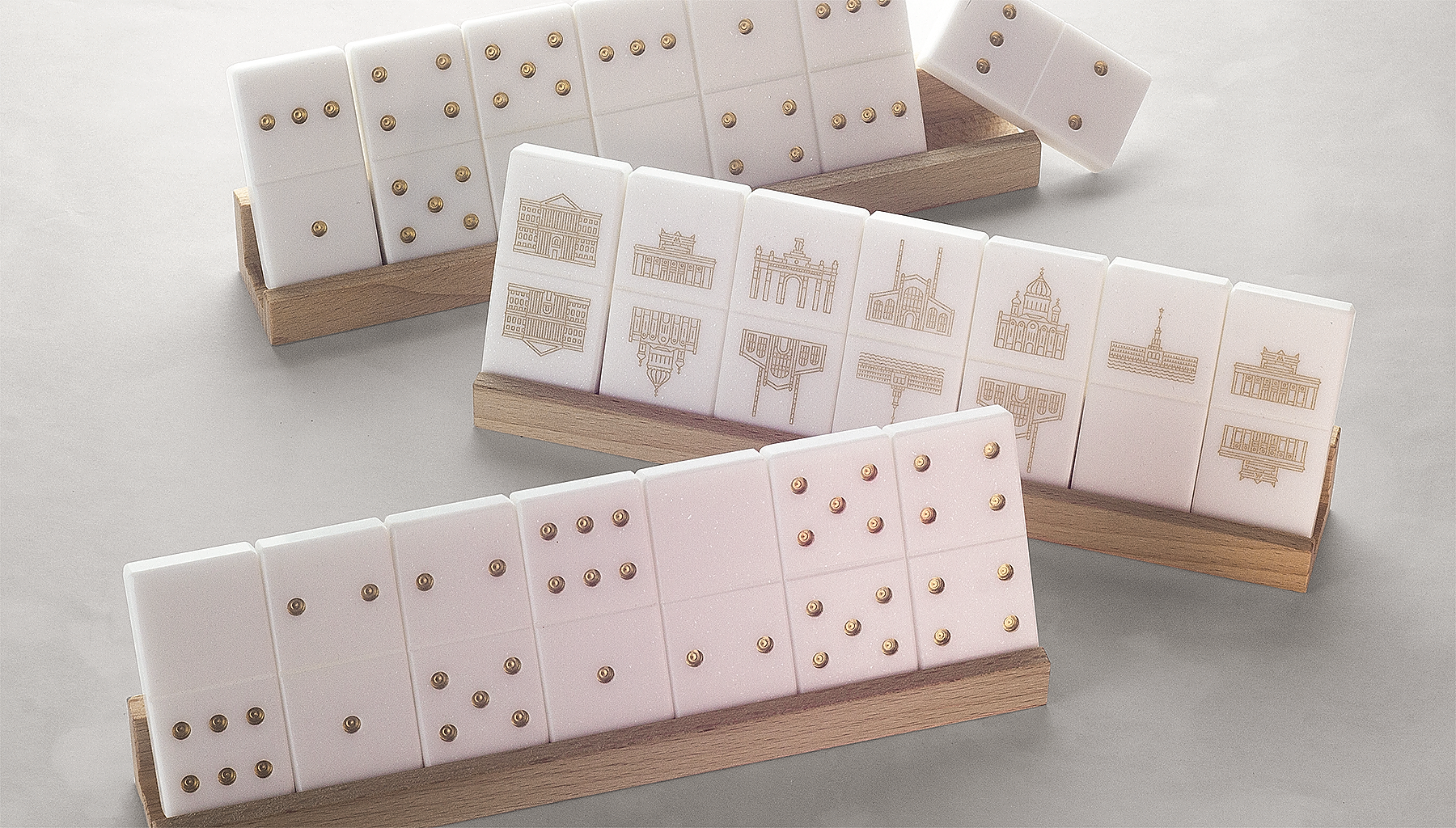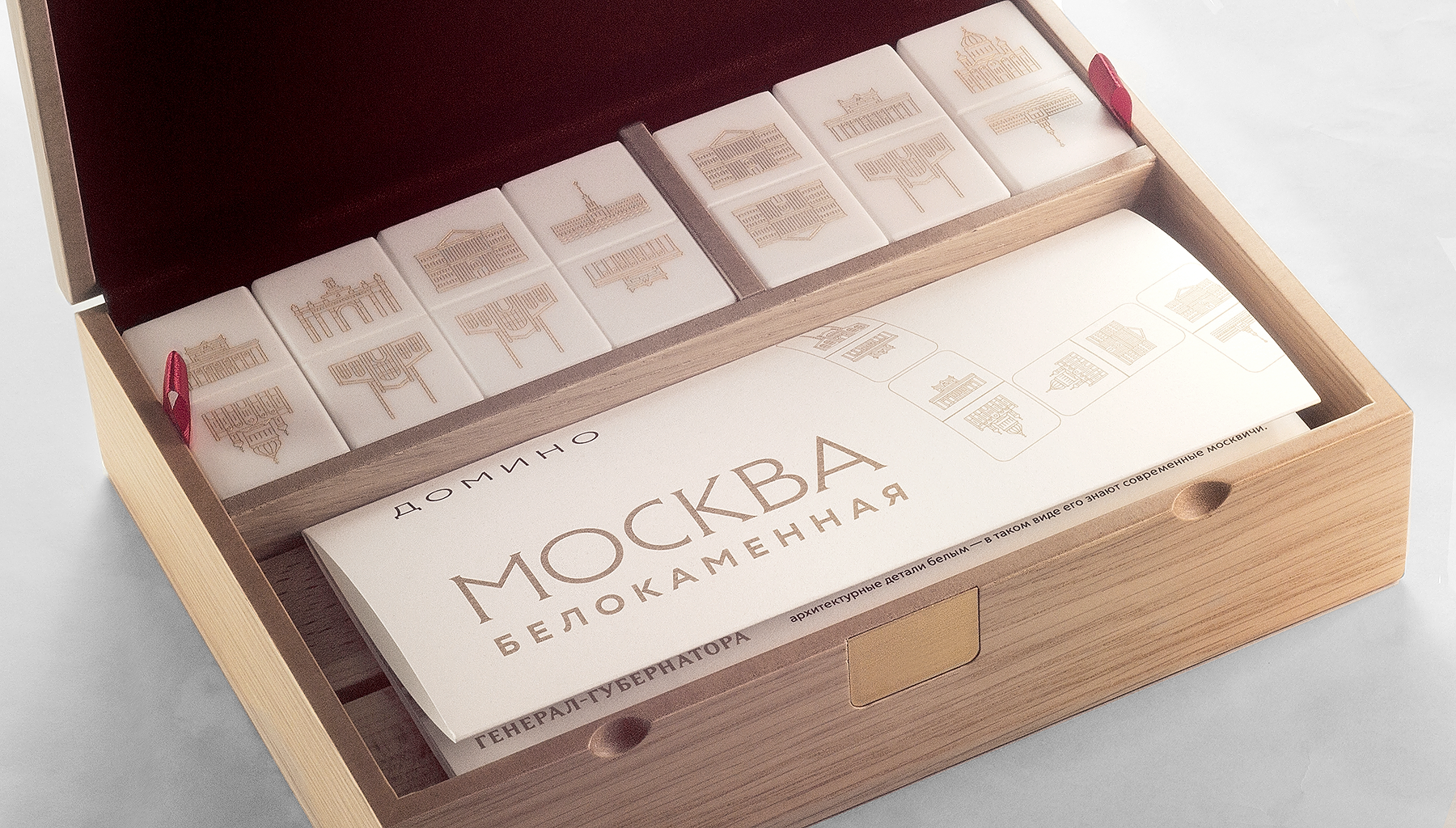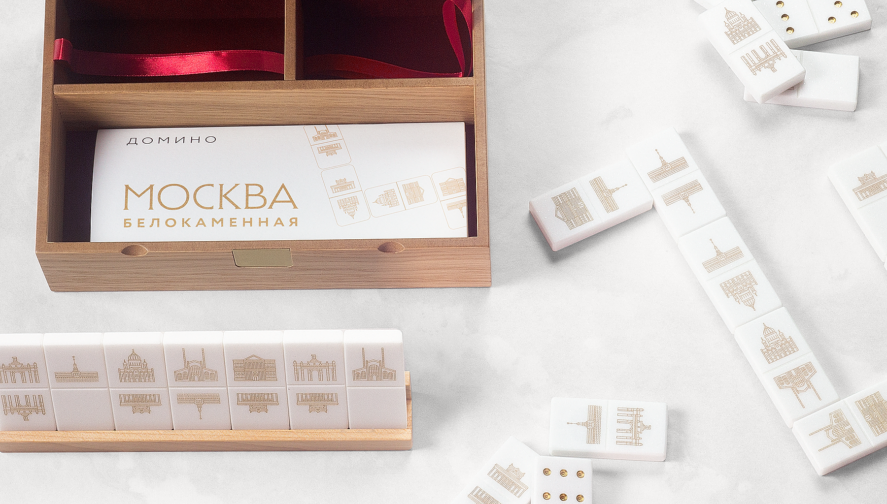В этом наборе для игры в домино игральные кости белые – он посвящен истории московского белого камня. Во времена Дмитрия Донского Москву обнесли стеной, с тех пор название Москва белокаменная стало вторым именем города. В этом наборе на рубашках костей выгравированы знаковые для истории города здания, начиная с дома московского генерал-губернатора (здание мэрии), в фундамент которого был заложен камень из стен Белого города.