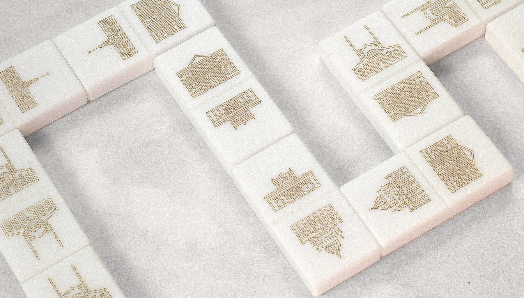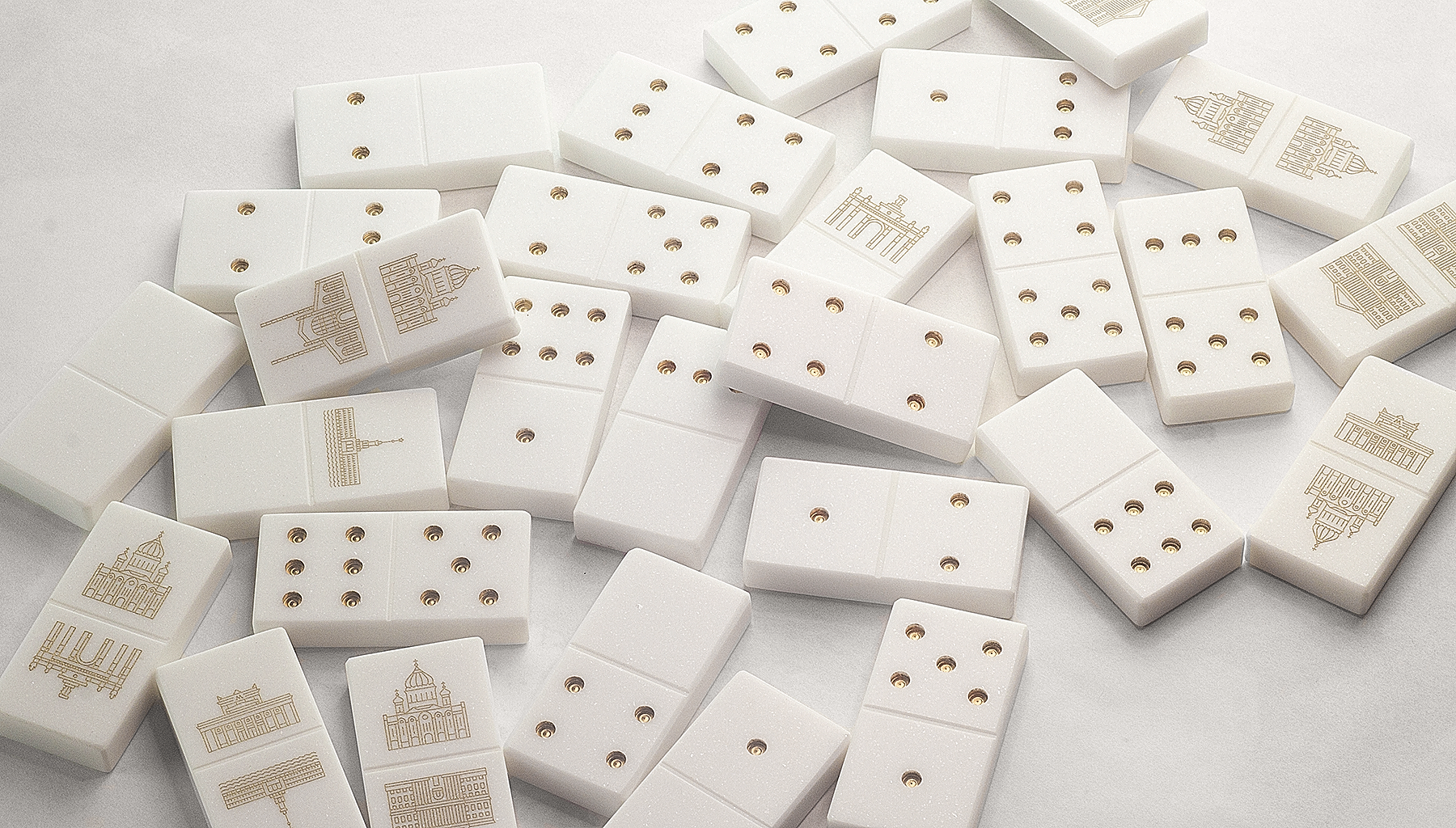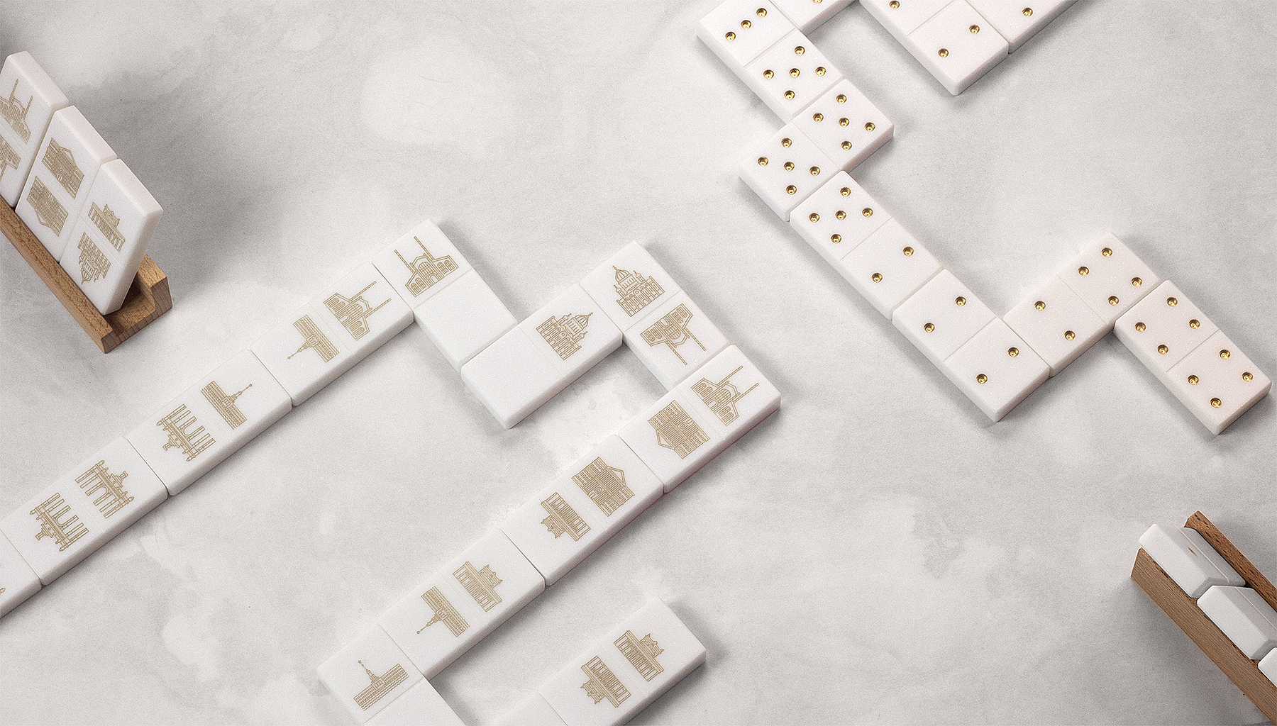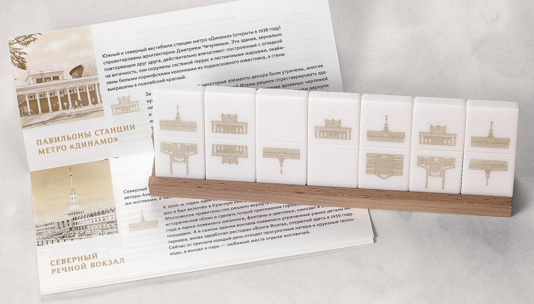 В этом наборе для игры в домино игральные кости белые – он посвящен истории московского белого камня. Во времена Дмитрия Донского Москву обнесли стеной, с тех пор название Москва белокаменная стало вторым именем города. В этом наборе на рубашках костей выгравированы знаковые для истории города здания, начиная с дома московского генерал-губернатора (здание мэрии), в фундамент которого был заложен камень из стен Белого города.