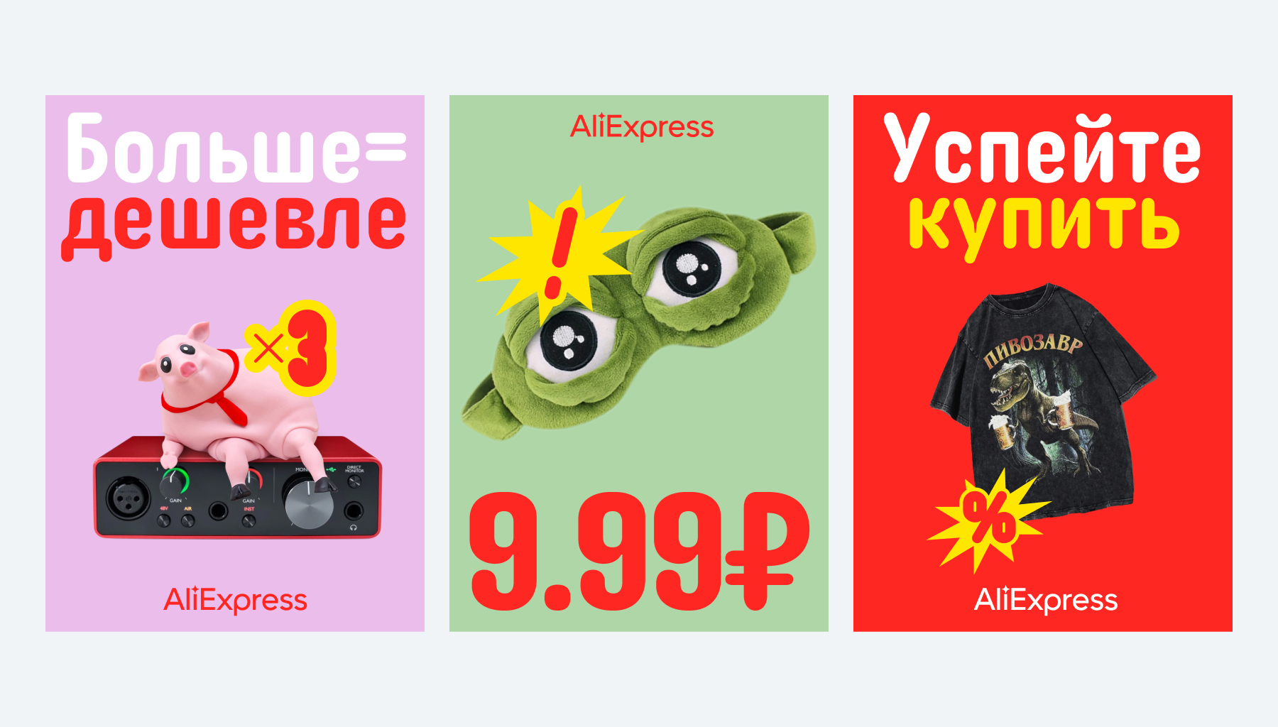 Именно эстетика доступного праздника стала основным и главным источником вдохновения для возвращения AliExpress к истокам: вывески-лайтбоксы, уличные штендеры, «раскладушки», бесконечные плакаты «распродажа».