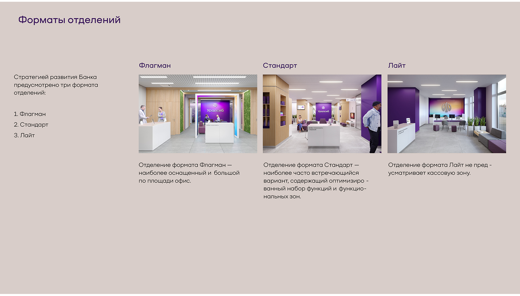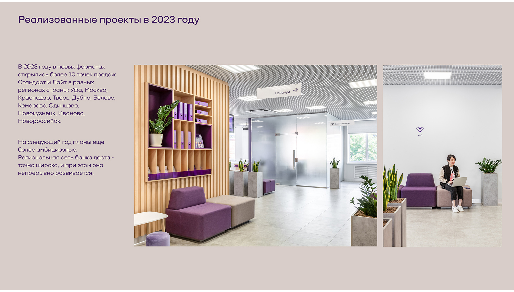 В 2023 году Банк Уралсиб закончил разработку руководства по оформлению точек продаж в новой стилистике. В течение года было обновлено более 10 офисов в разных регионах страны: Уфа, Москва, Краснодар, Тверь, Дубна, Белово, Кемерово, Одинцово, Новокузнецк, Иваново, Новороссийск. Но работа не заканчивается, на следующий год планы еще более амбициозные. Региональная сеть банка достаточно широка, и при этом она непрерывно развивается.