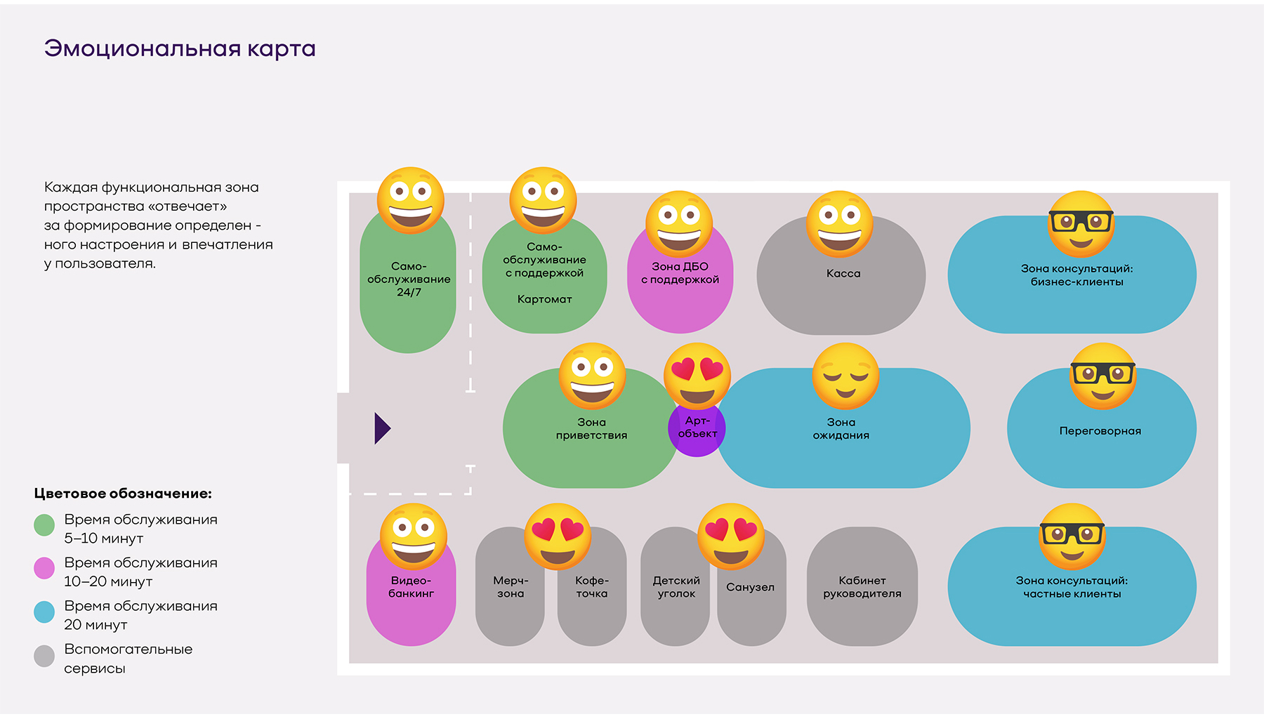 Были разработаны сервисные сценарии взаимодействия сотрудников банка с клиентами, реализация которых учитывает все потребности потребителей и позволяет добиться целевой эмоции в разных функциональных зонах. В данных сценариях были отражены ценности банка: