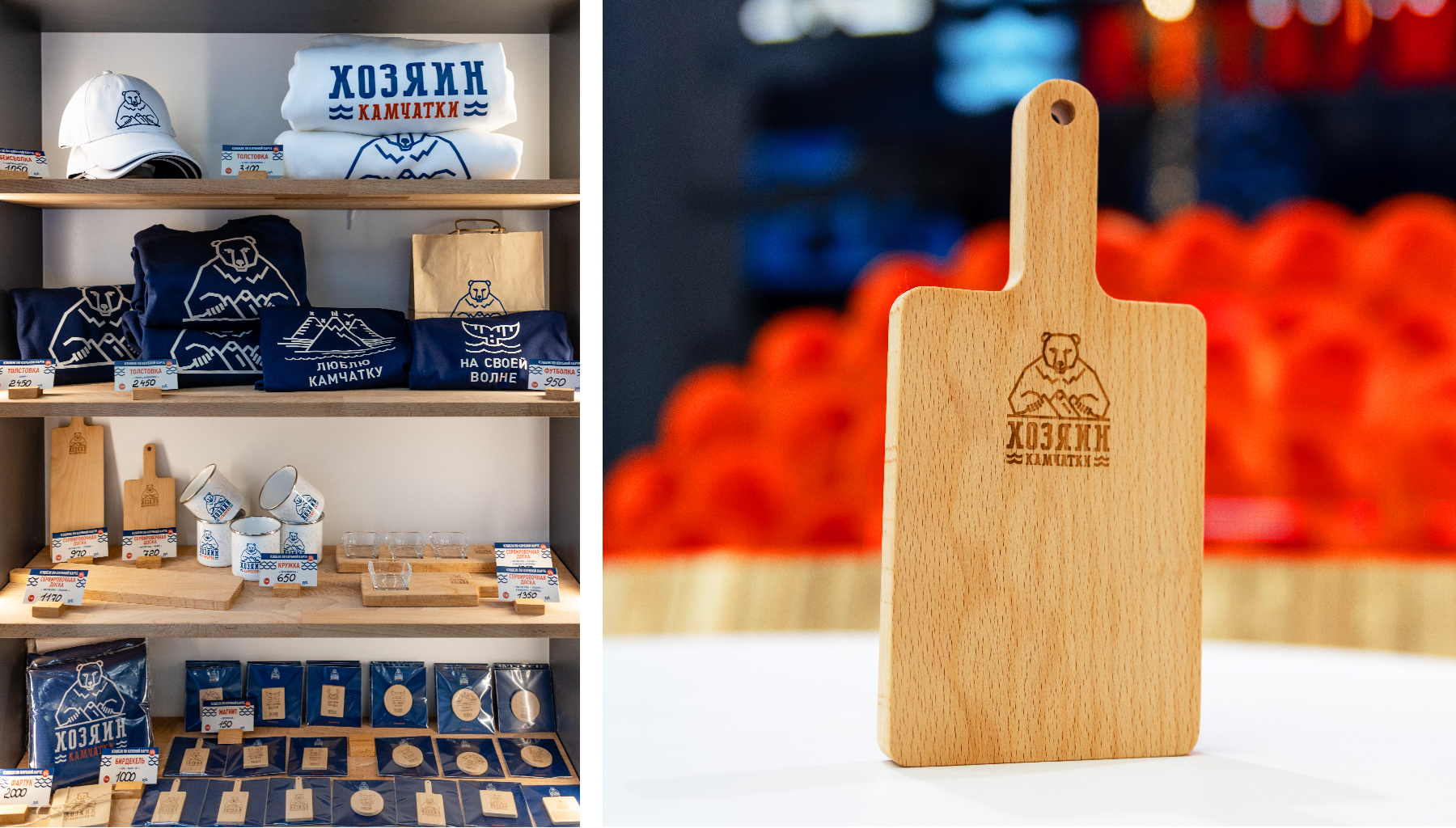 Специально для «Хозяина Камчатки» выпущена коллекция мерча, которая подчеркивает экспертность бренда. В неё входят профессиональные кухонные аксессуары (доски для приготовления и сервировки, кожаные и текстильные фартуки), а также стандартные востребованные позиции (сумки-шоперы, футболки, худи, магниты и т.д.).