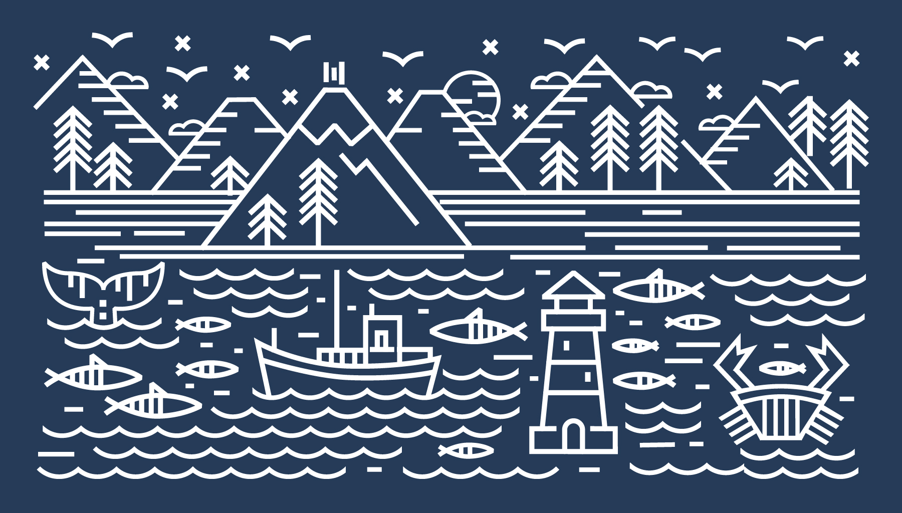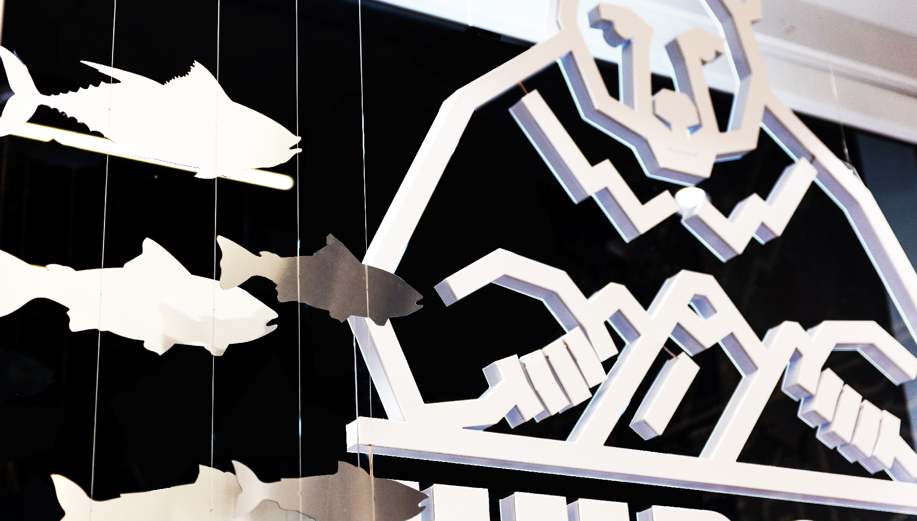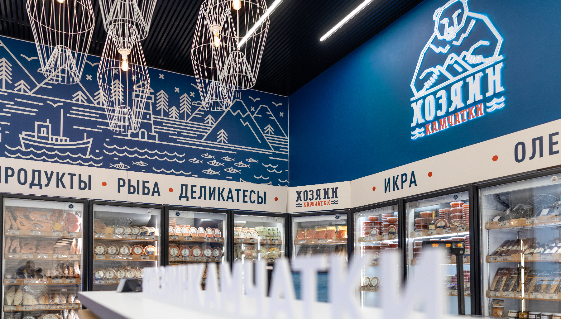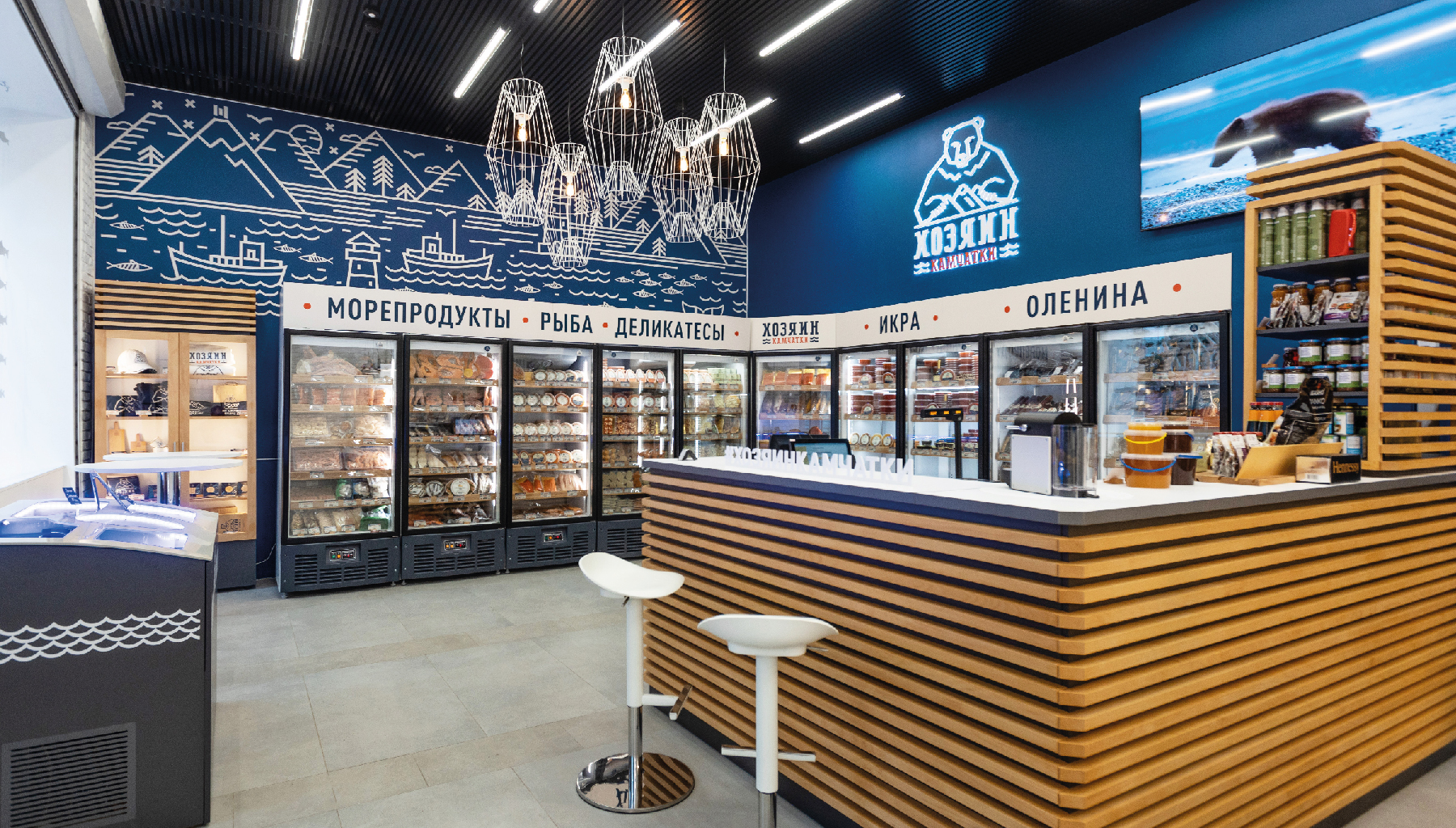 Интерьер содержит ряд ассоциативных якорей, усиливающих связь с брендом и традициями рыбного промысла. За основу цветового решения взят глубокий синий оттенок океана, который дополнен контрастным икорным акцентом. Цветовое решение поддержано фирменной авторской графикой, вдохновлённой природой Камчатки, её знаменитыми вулканами. Ключевой фигурой является медведь – тот самый хозяин территории, главный символ бренда.