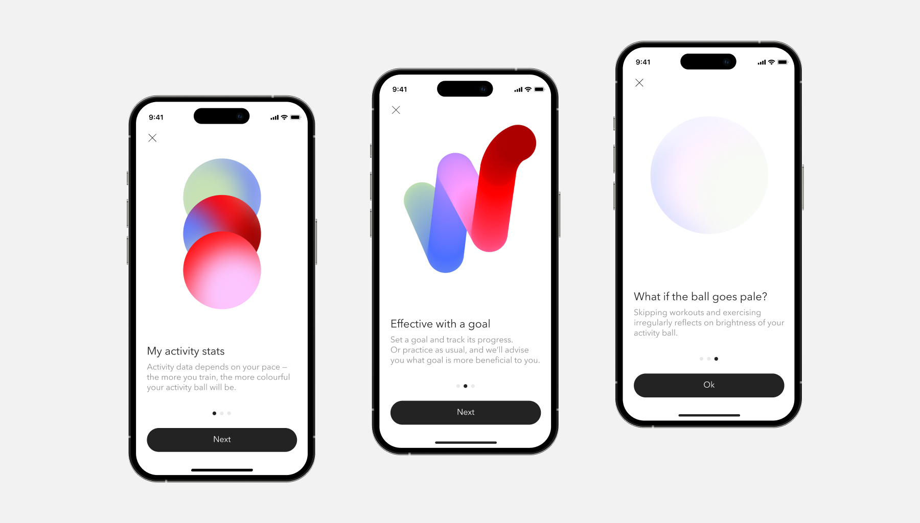 У каждого вида тренировок свой цвет: у Wellness — салатовый, у набора мышечной массы — бордовый и т. д. У того, кто налегает на кардио и развитие выносливости, шар будет преимущественно красный, а у любителей тренировок в воде — синий.