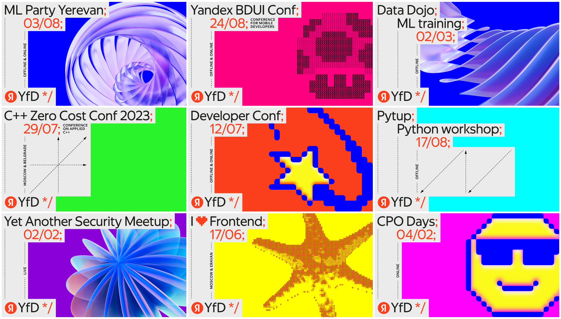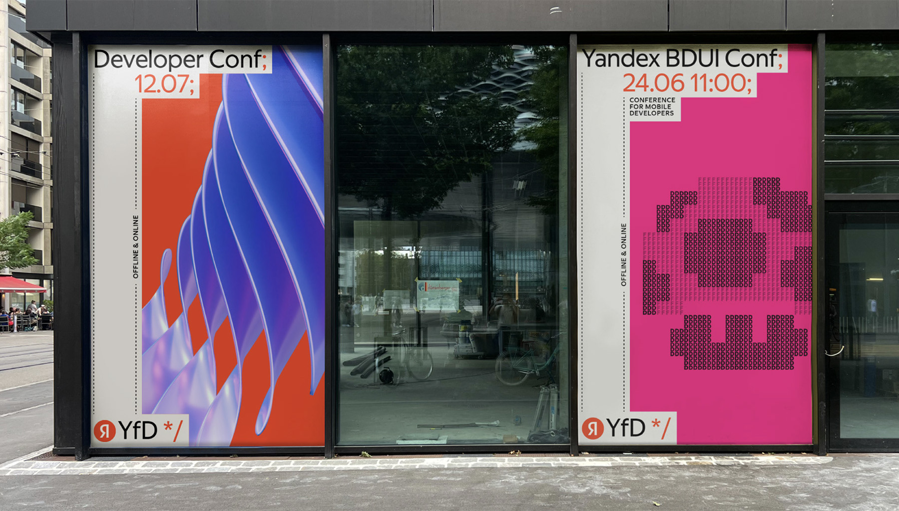Yandex for Developers (YfD) — платформа для нетворкинга и развития специалистов из IT-индустрии. Новая гибкая дизайн-система бренда основана на типографике, адаптирующей общие правила синтаксиса языков программирования. События разных направлений артикулированы с помощью кастомного генератора моушн- и статичной графики, дополненного яркой и разнообразной цветовой палитрой.