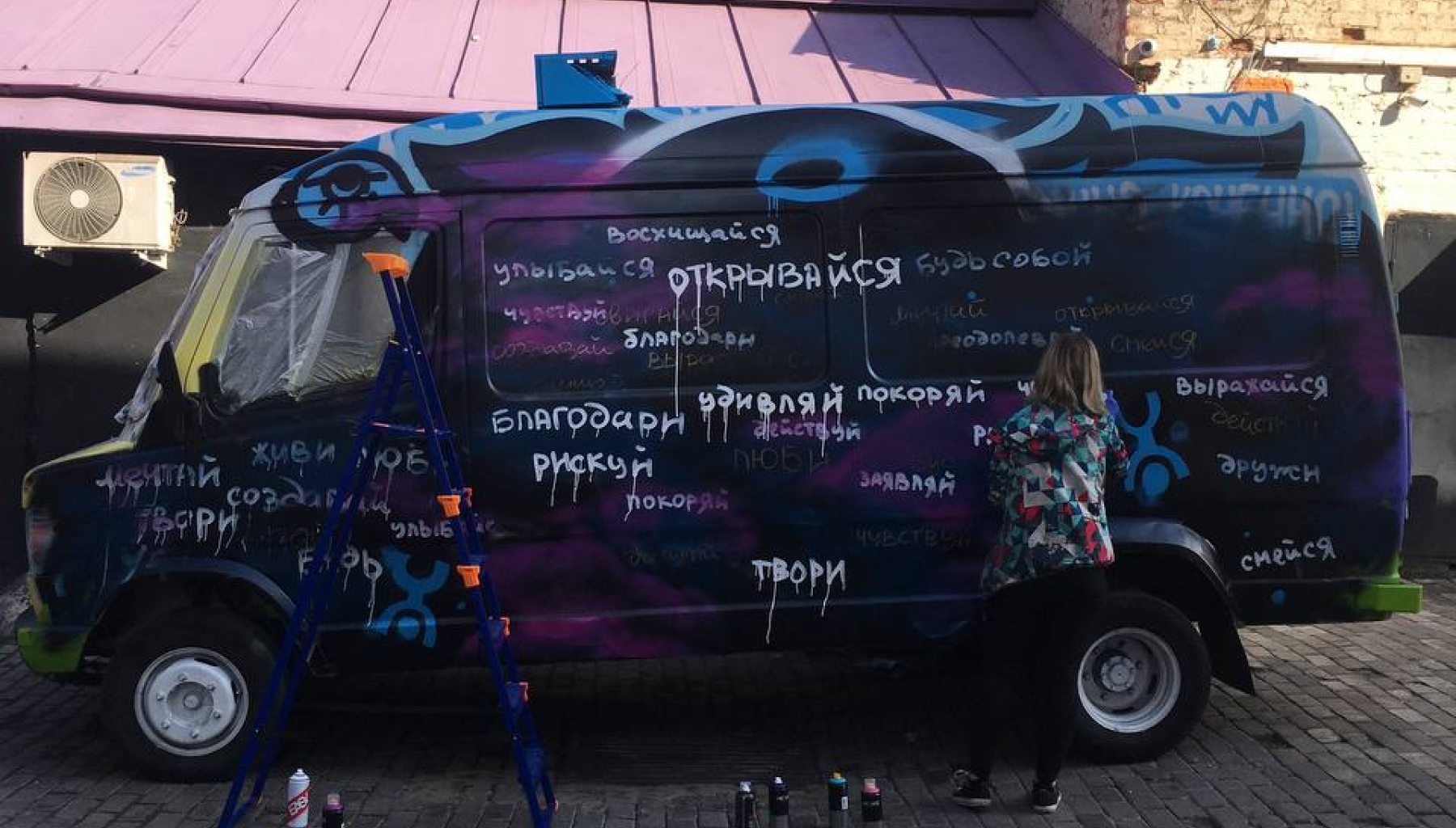 Акт 1. В пространство Punk Fiction мы привезли автобус и раскрасили его словом «МОЖНО», превратив двор возле бара в творческую мастерскую.