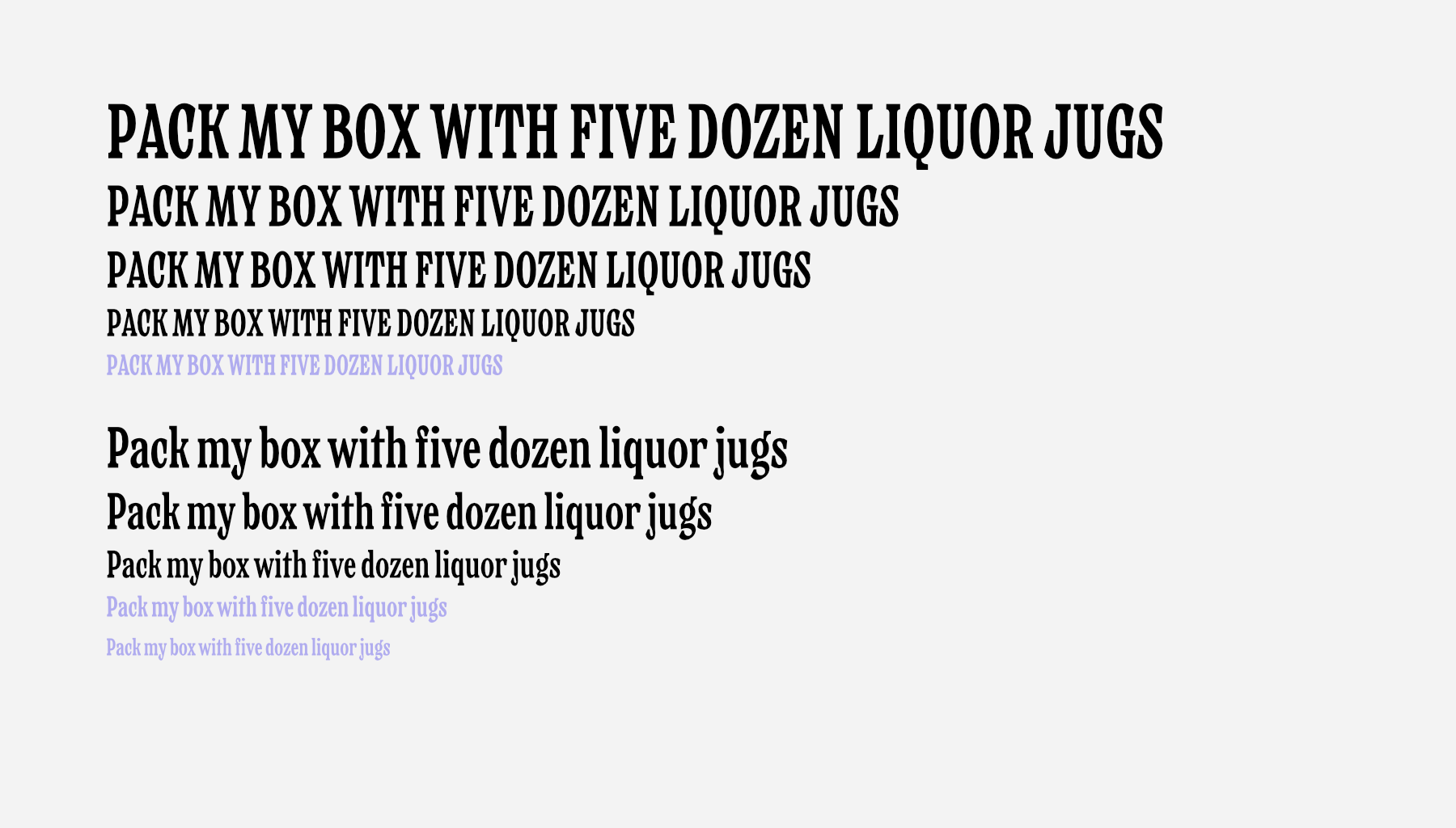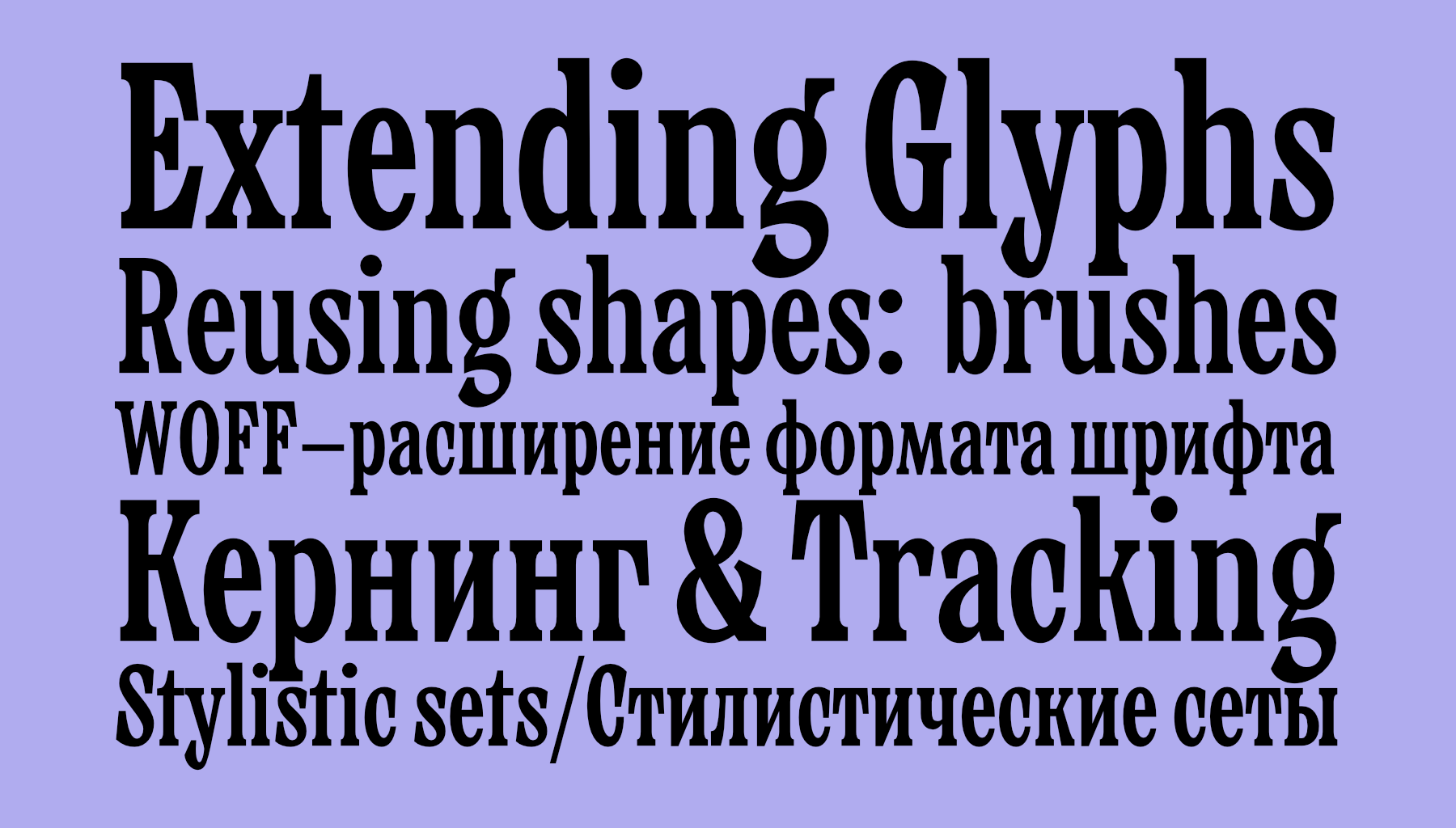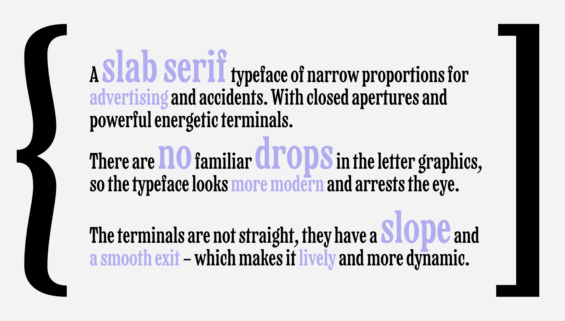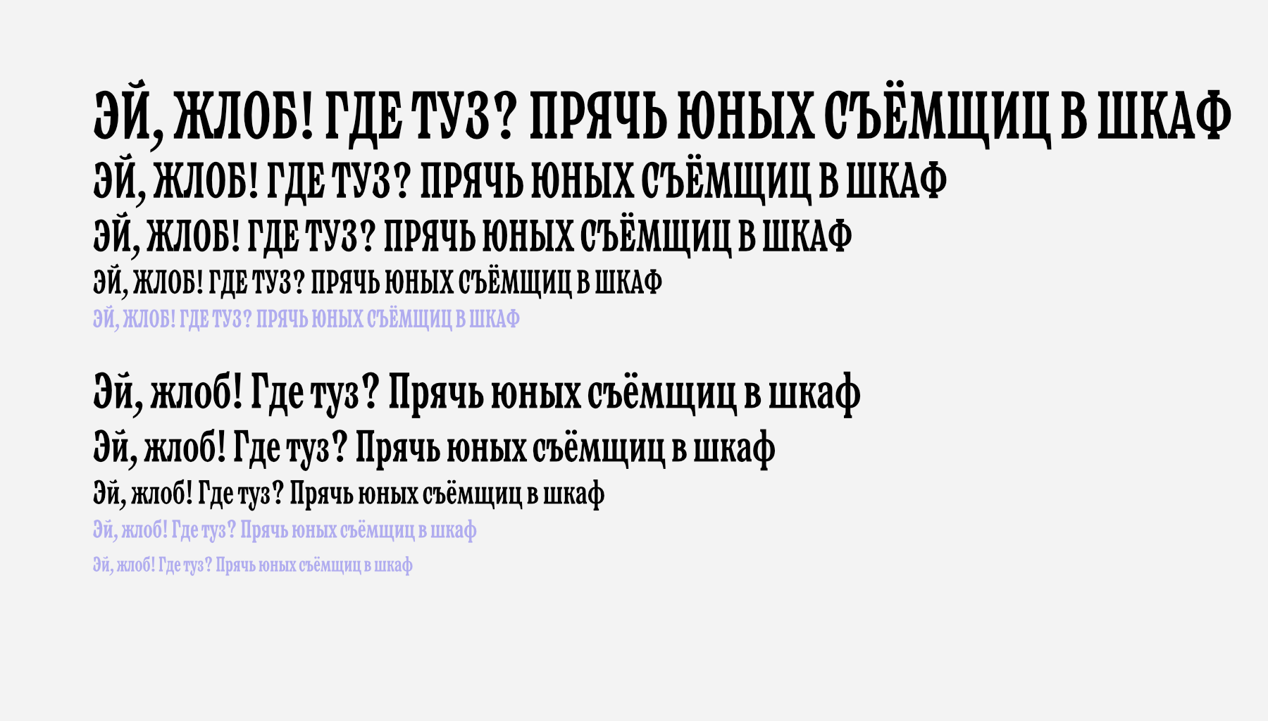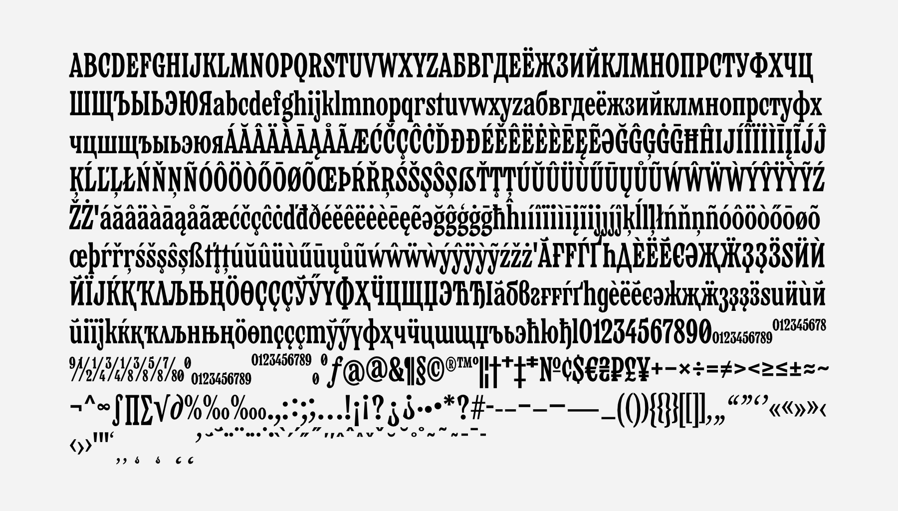 Verpacker — малоконстраный брусковый шрифт узких пропорций для рекламы и акциденции. C закрытыми апертурами и мощными энергичными терминалами. Шрифт сочетает функциональность и цепляющий характер набора. В графике букв нет привычных капель, так шрифт выглядит современней и задерживает взгляд. Терминалы не прямые, имеют наклон и плавный выход - что делает его живым и более динамичным.