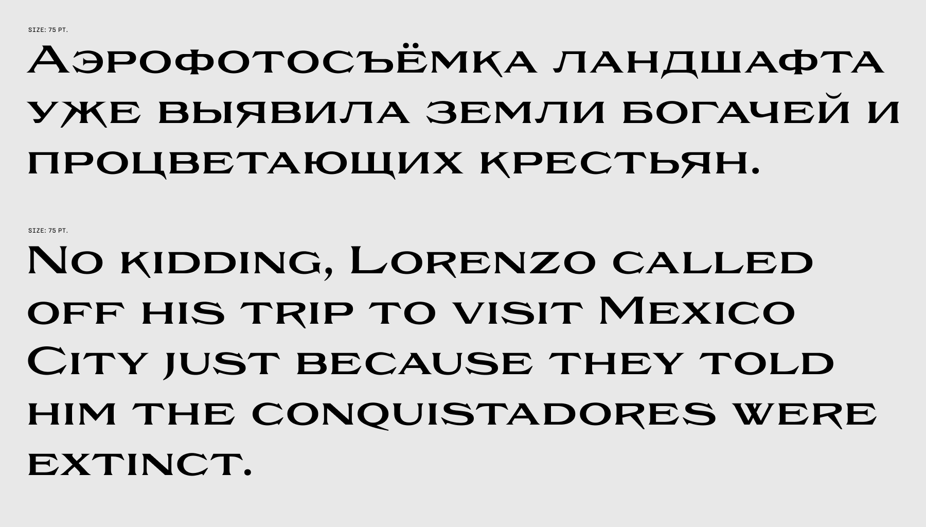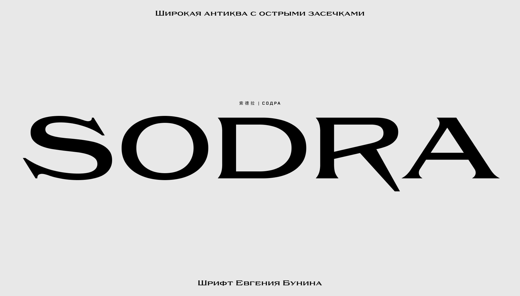 Sodra - это широкая акцидентная антиква с острыми засечками. Этот шрифт появился из отрывка манифеста “Manifesto del Futurismo” автора Filippo Tommaso Marinetti. Одно короткое слово стало вдохновением и напутствием для создания данного шрифта. Попытка создать что-то уникальное и выделяющиеся из множества других антикв, попытка добавить в что-то историческое немного современного. Особая эстетика и его выразительность, которую передаёт шрифт, заставит всматриваться в каждую букву и привлекать внимание.