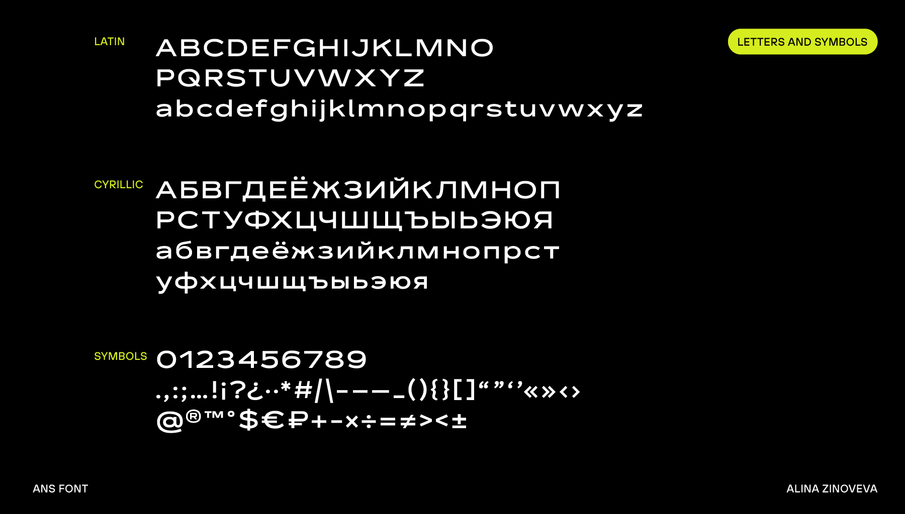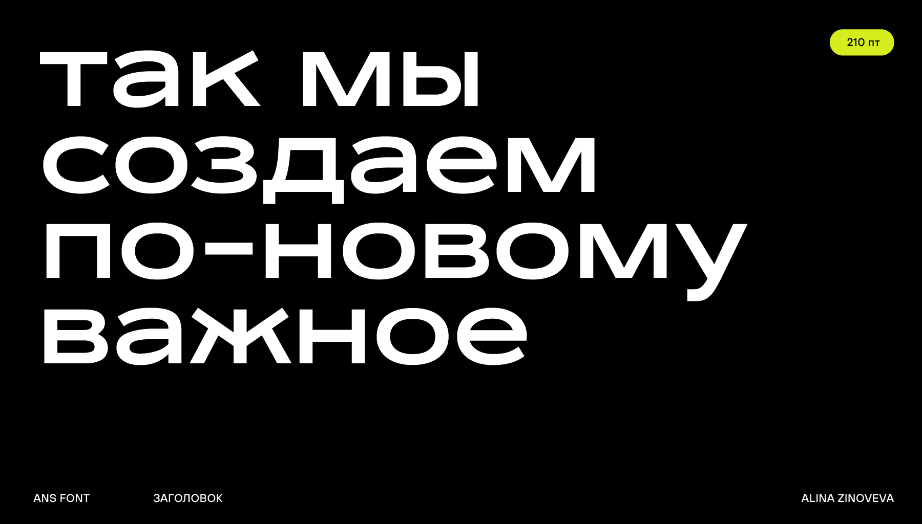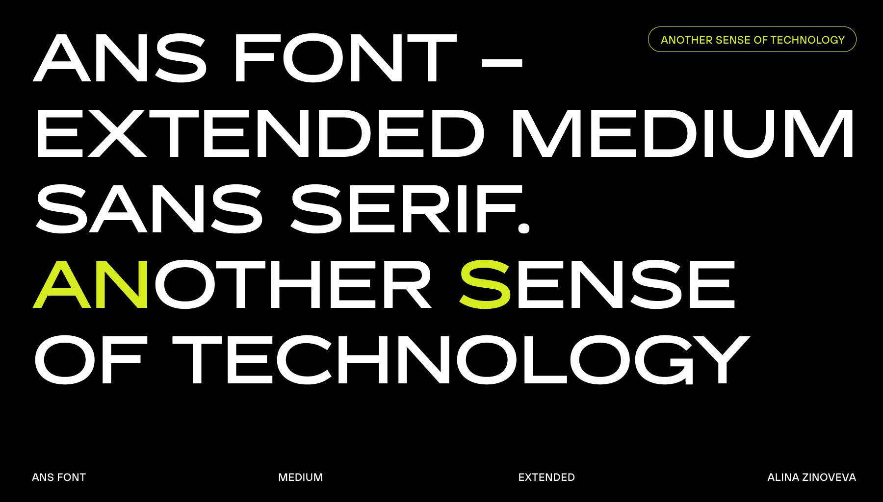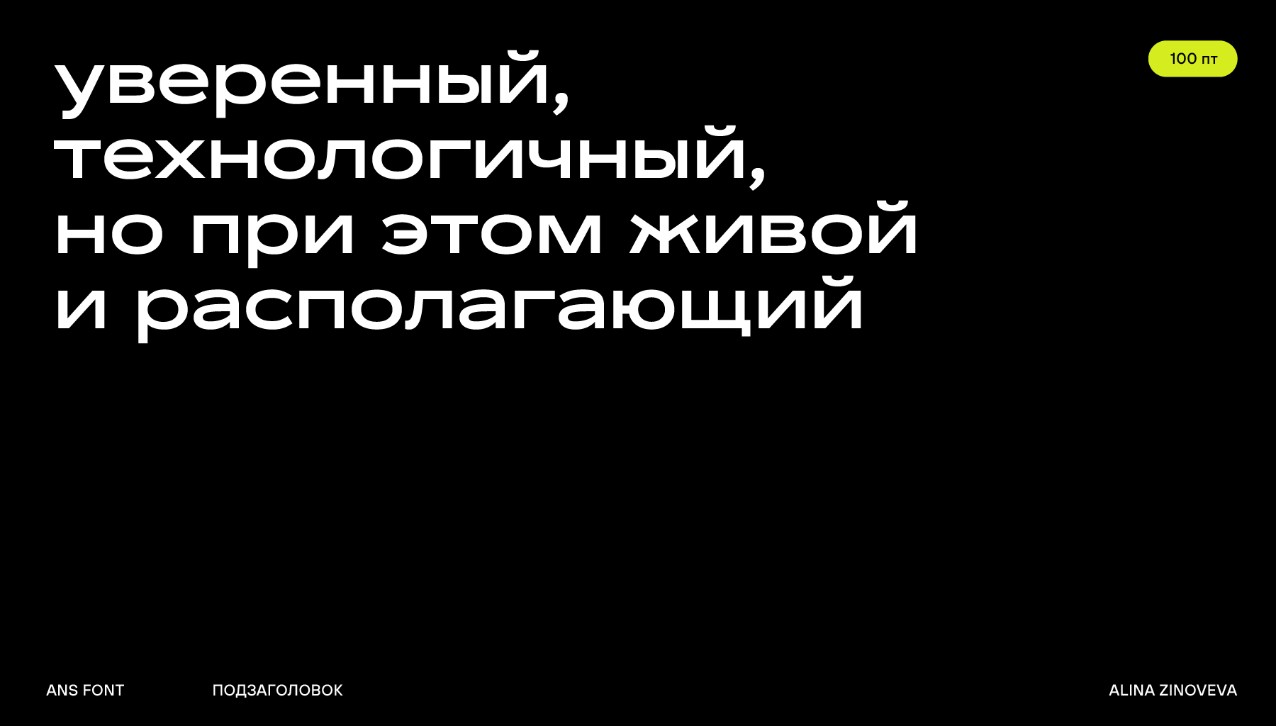 ANS (сокр. от another sense of technology) – современный гротеск, в котором соединились два начала: технологичность и человечность. Широкая форма букв, приквадраченные овалы и арки у o, d, b, p, q и низкий контраст отсылают к технологичности и уверенности. А плавные выносные элементы букв a, c, л, у, открытые апертуры и перпендикулярные срезы штрихов делают этот шрифт живым, динамичным, открытым и располагающим. ANS рекомендуется использовать в заголовках, подзаголовках и небольших блоках текста до 12 пт.