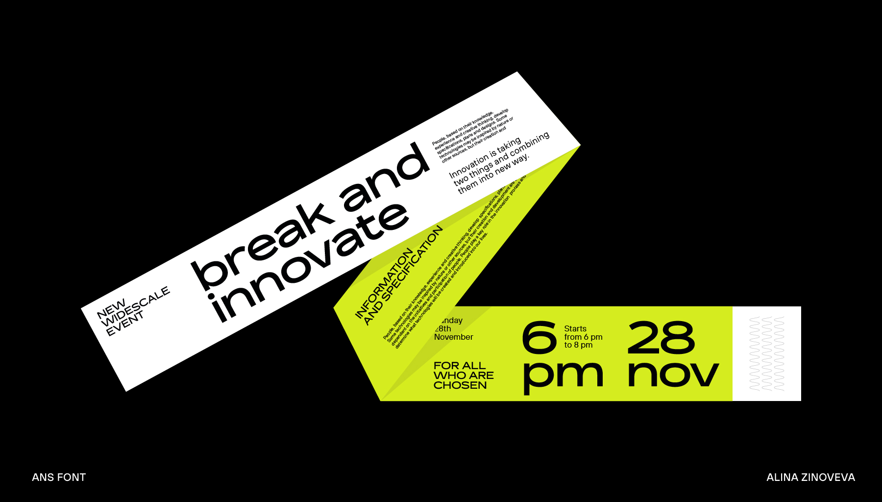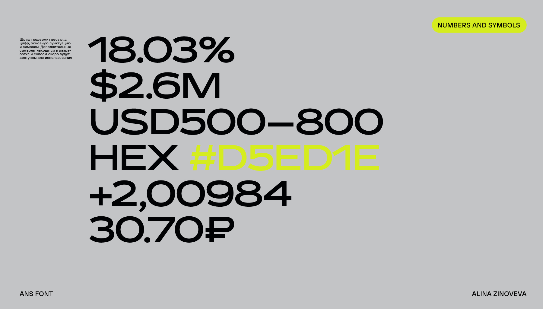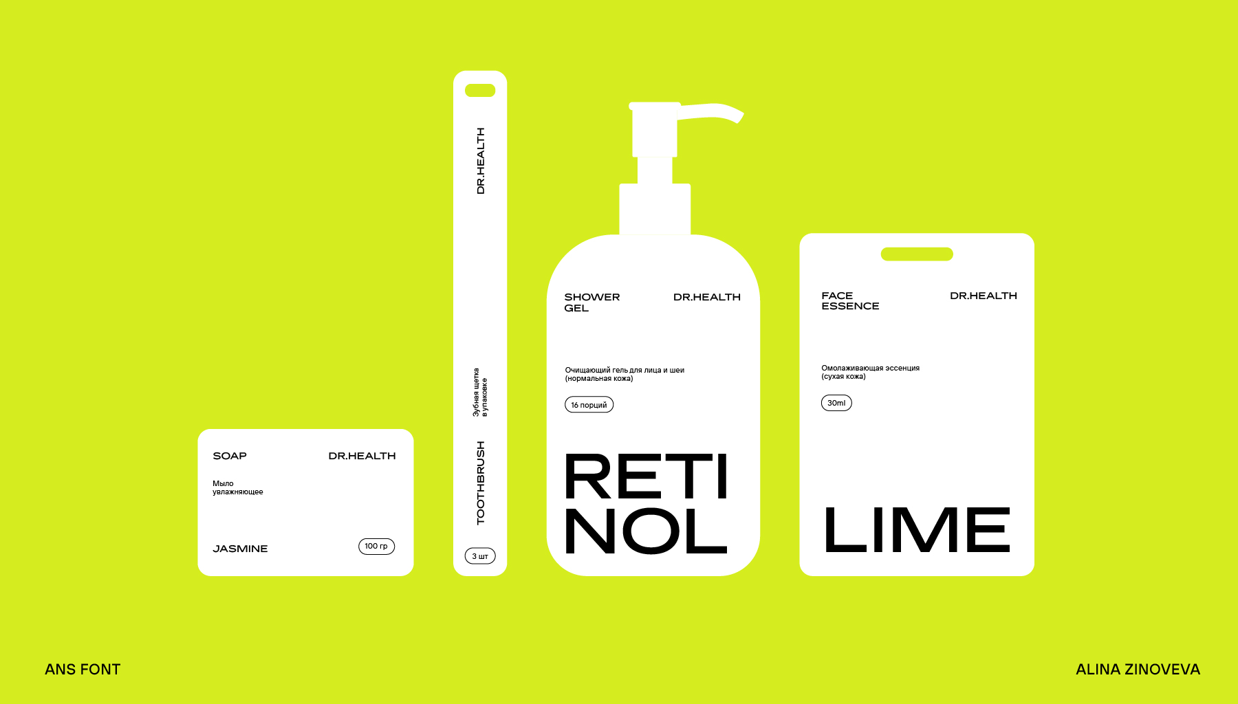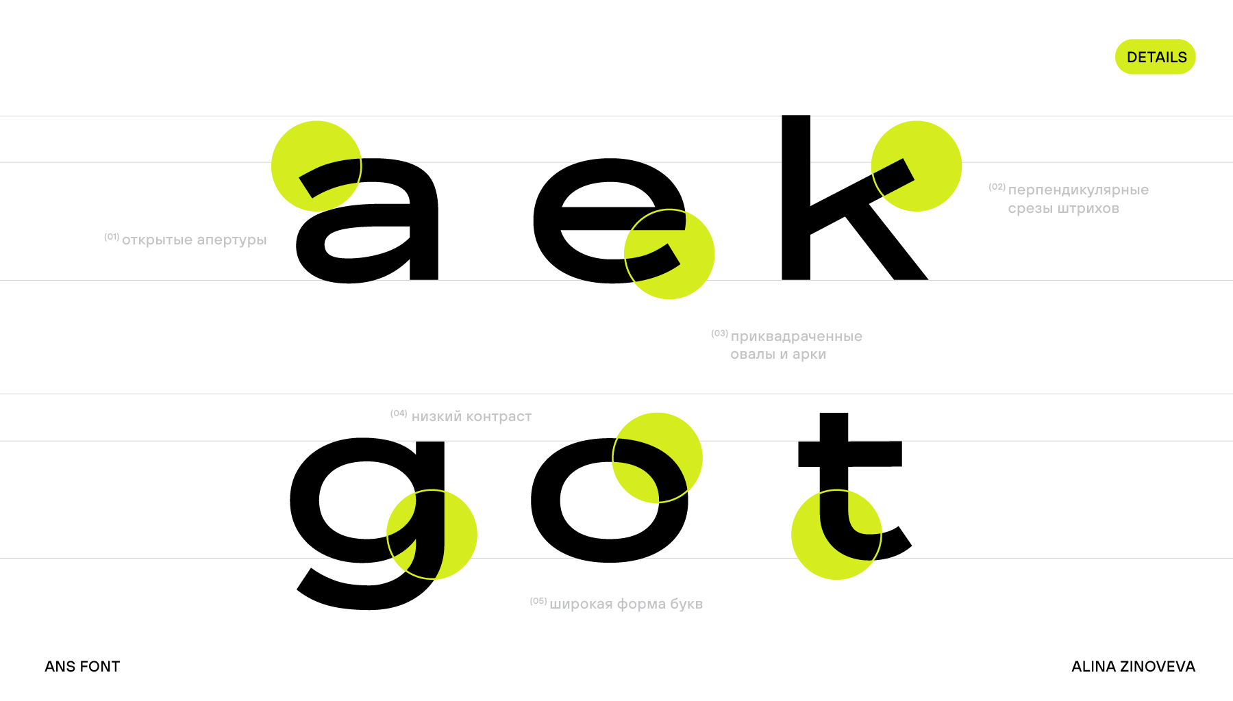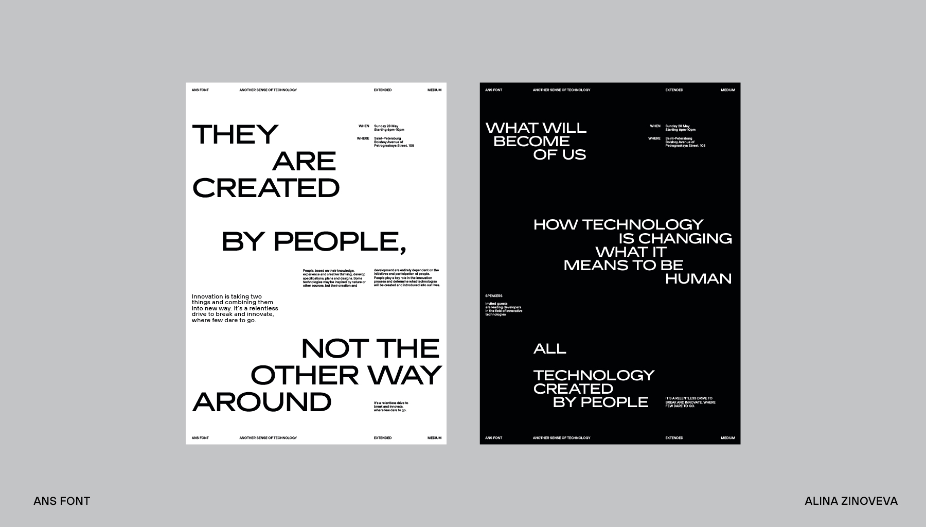 ANS (сокр. от another sense of technology) – современный гротеск, в котором соединились два начала: технологичность и человечность. Широкая форма букв, приквадраченные овалы и арки у o, d, b, p, q и низкий контраст отсылают к технологичности и уверенности. А плавные выносные элементы букв a, c, л, у, открытые апертуры и перпендикулярные срезы штрихов делают этот шрифт живым, динамичным, открытым и располагающим. ANS рекомендуется использовать в заголовках, подзаголовках и небольших блоках текста до 12 пт.