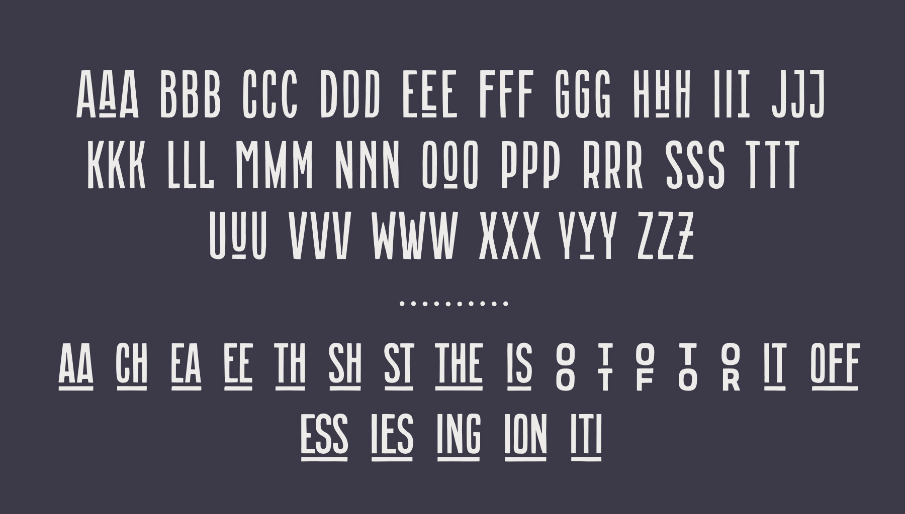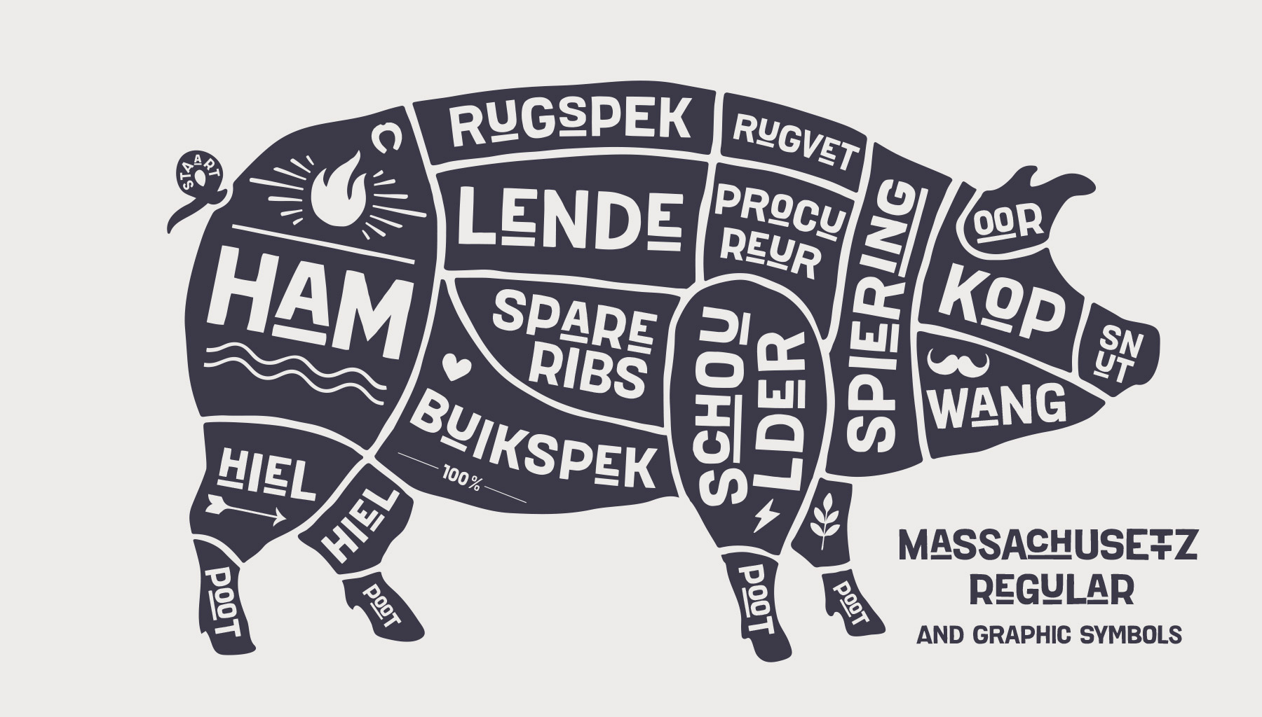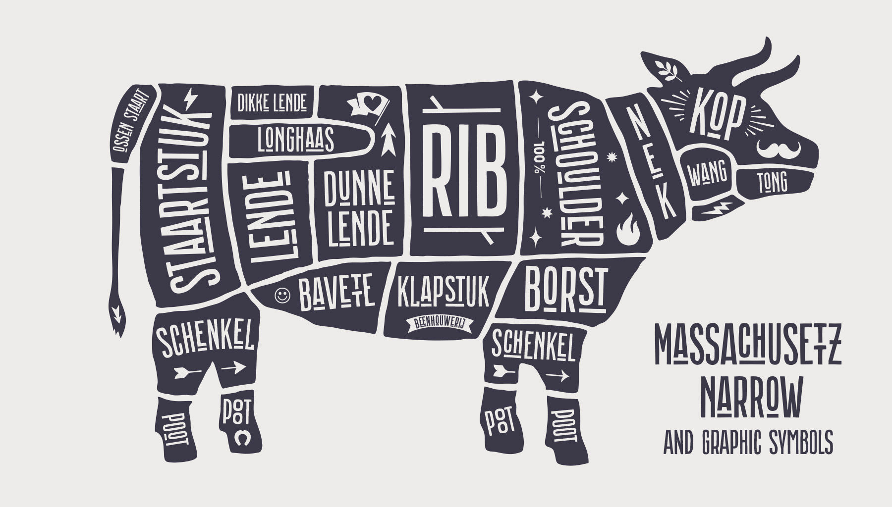 В шрифте Massachusettz содержится множество альтернативных букв, различных лигатур и графических элементов. Он легко адаптируется и уверенно взаимодействует с дизайнером, а также может изменяться в зависимости от контекста и цели использования.