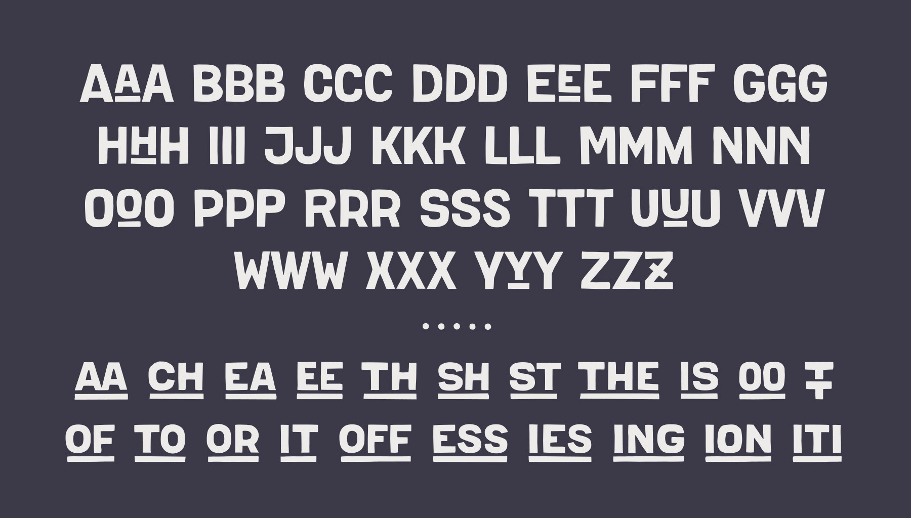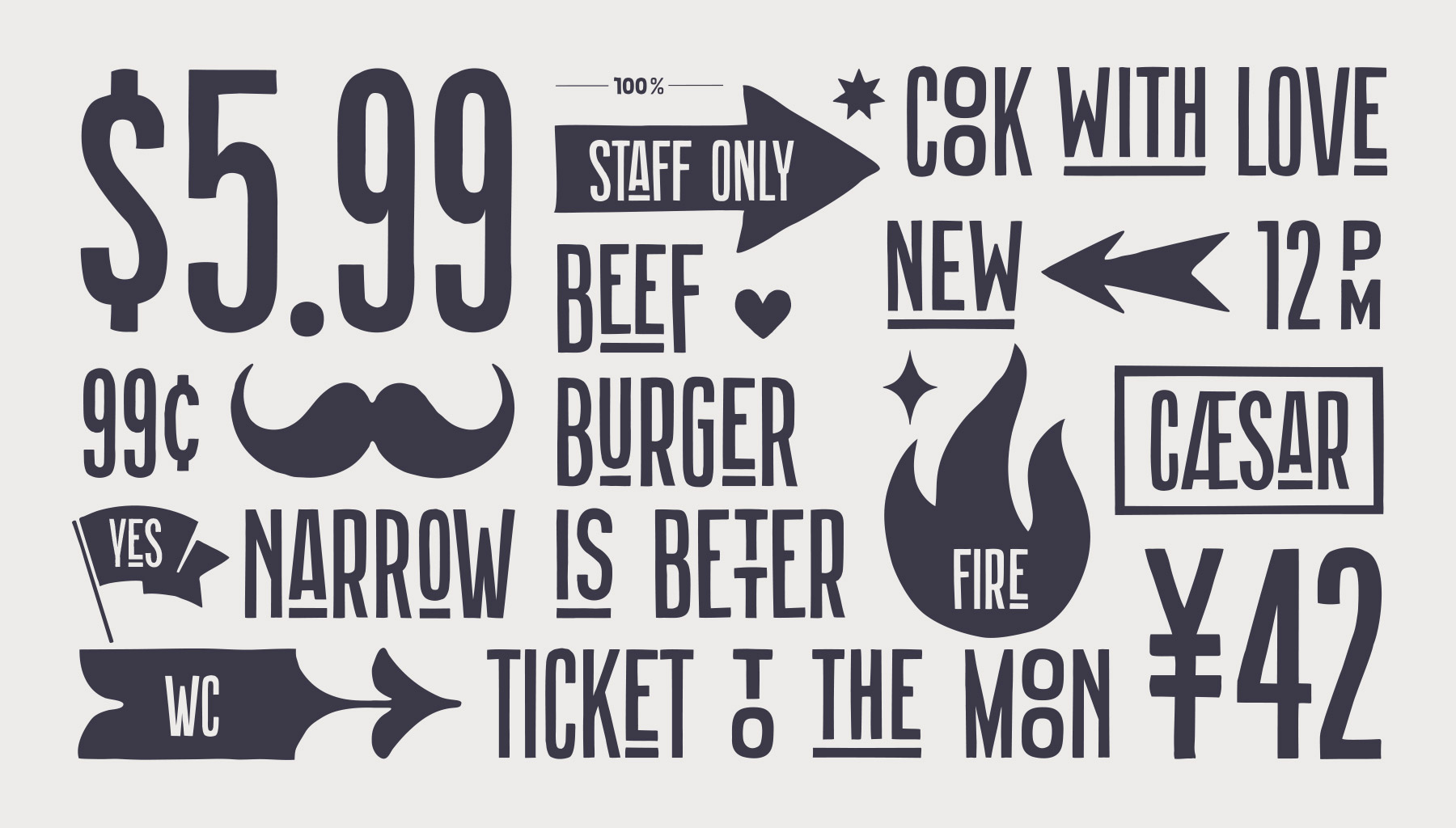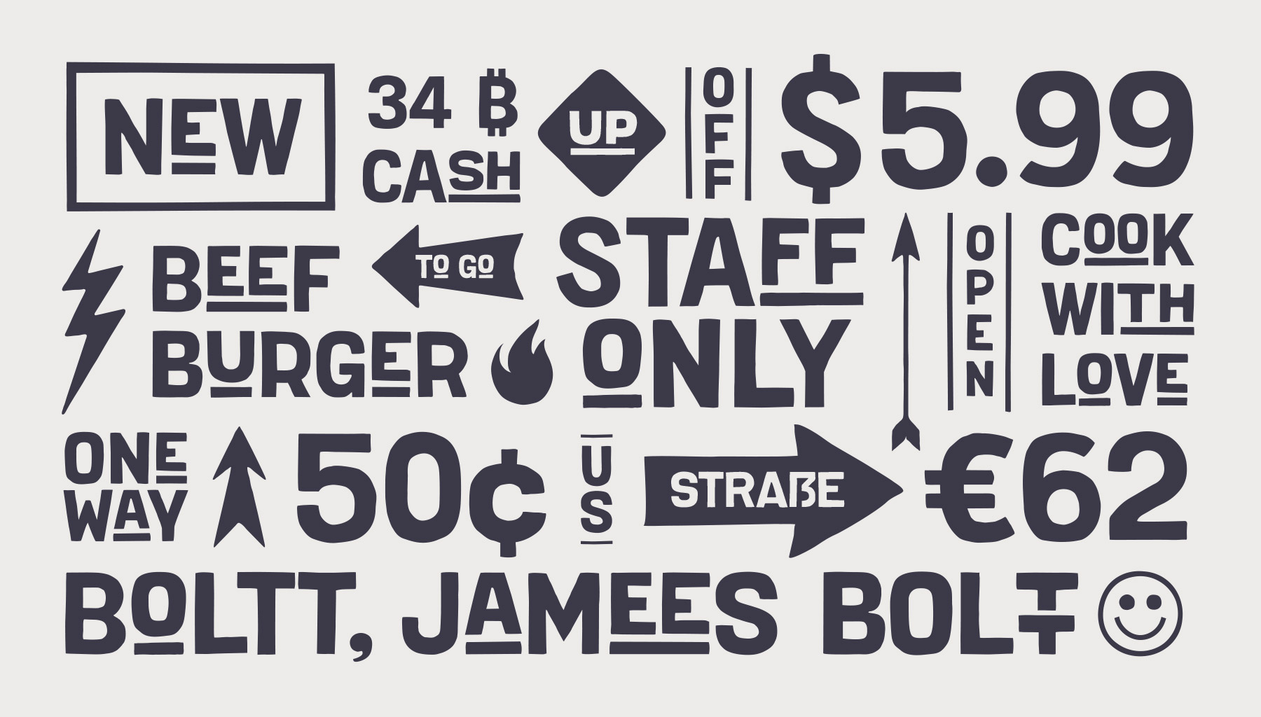 Плотный рукописный шрифт с неровными краями и игривой базовой линией. Он создает яркое впечатление, обладает дружелюбным, игривым и коммуникативным характером. Включает в себя обычное и узкое начертания, а также символьный набор для обогащения графическими элементами.