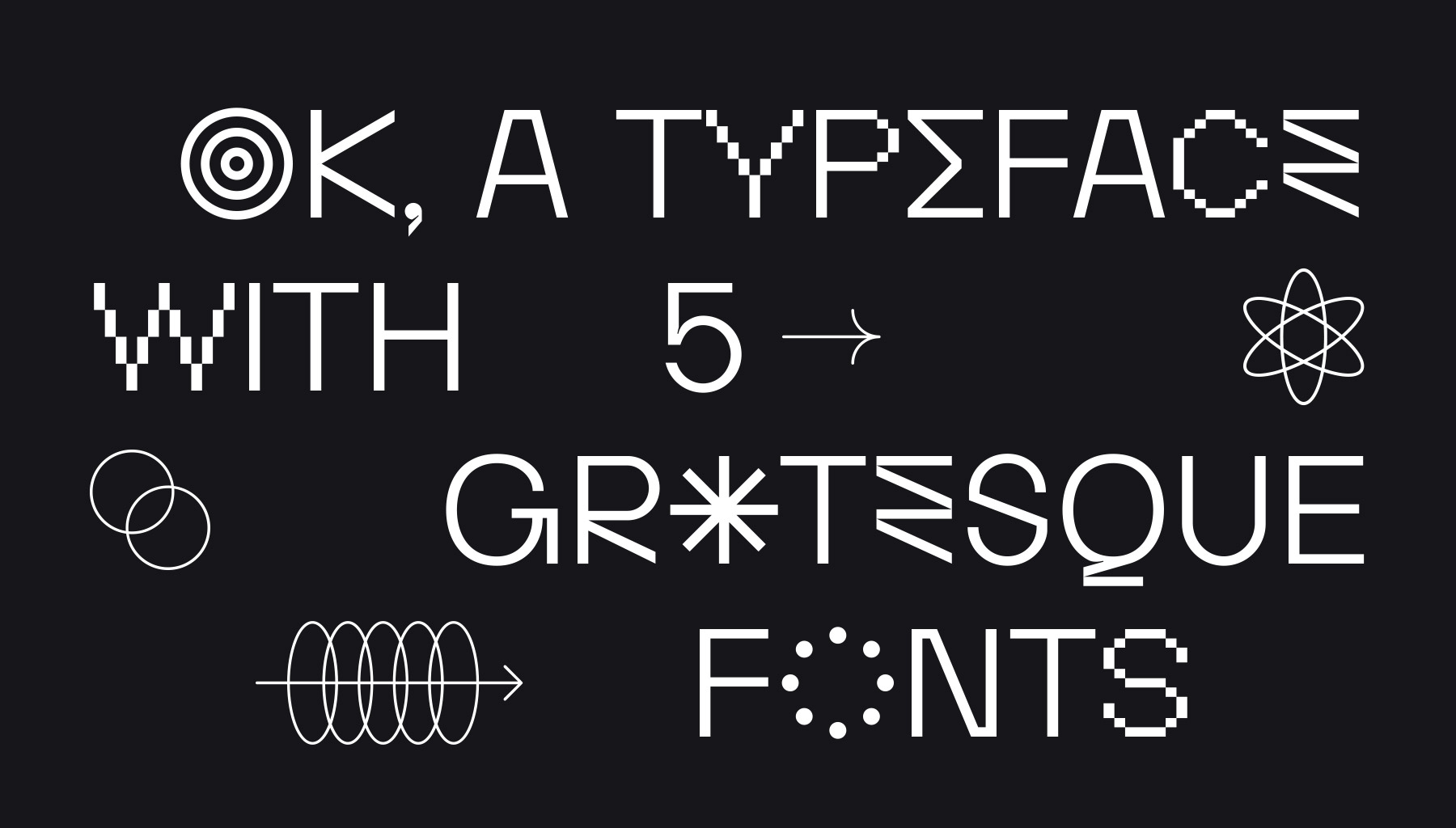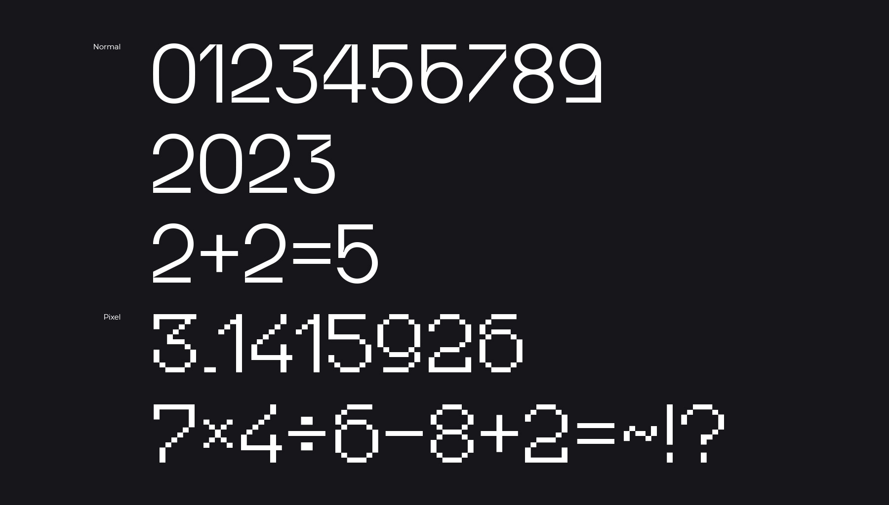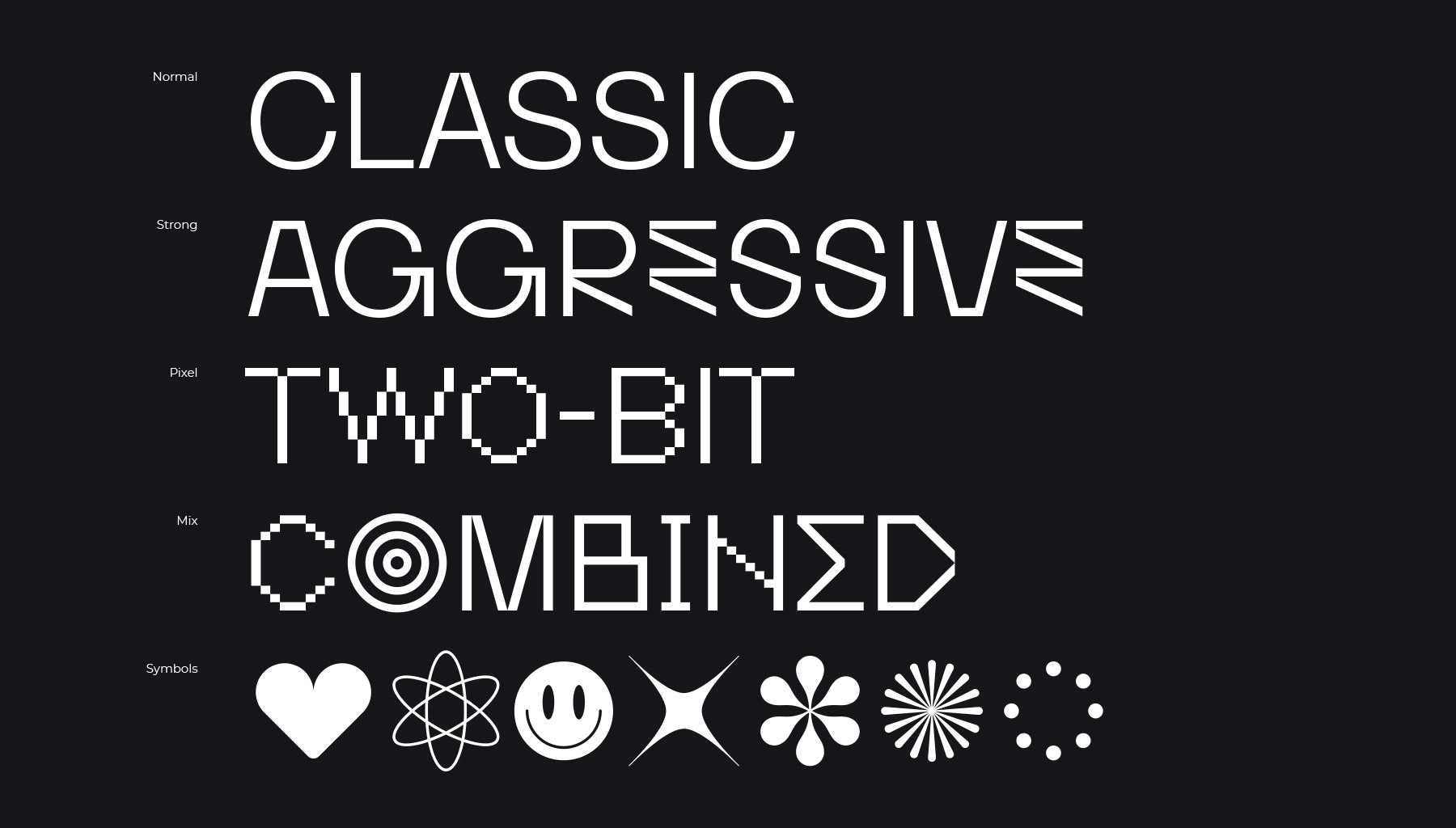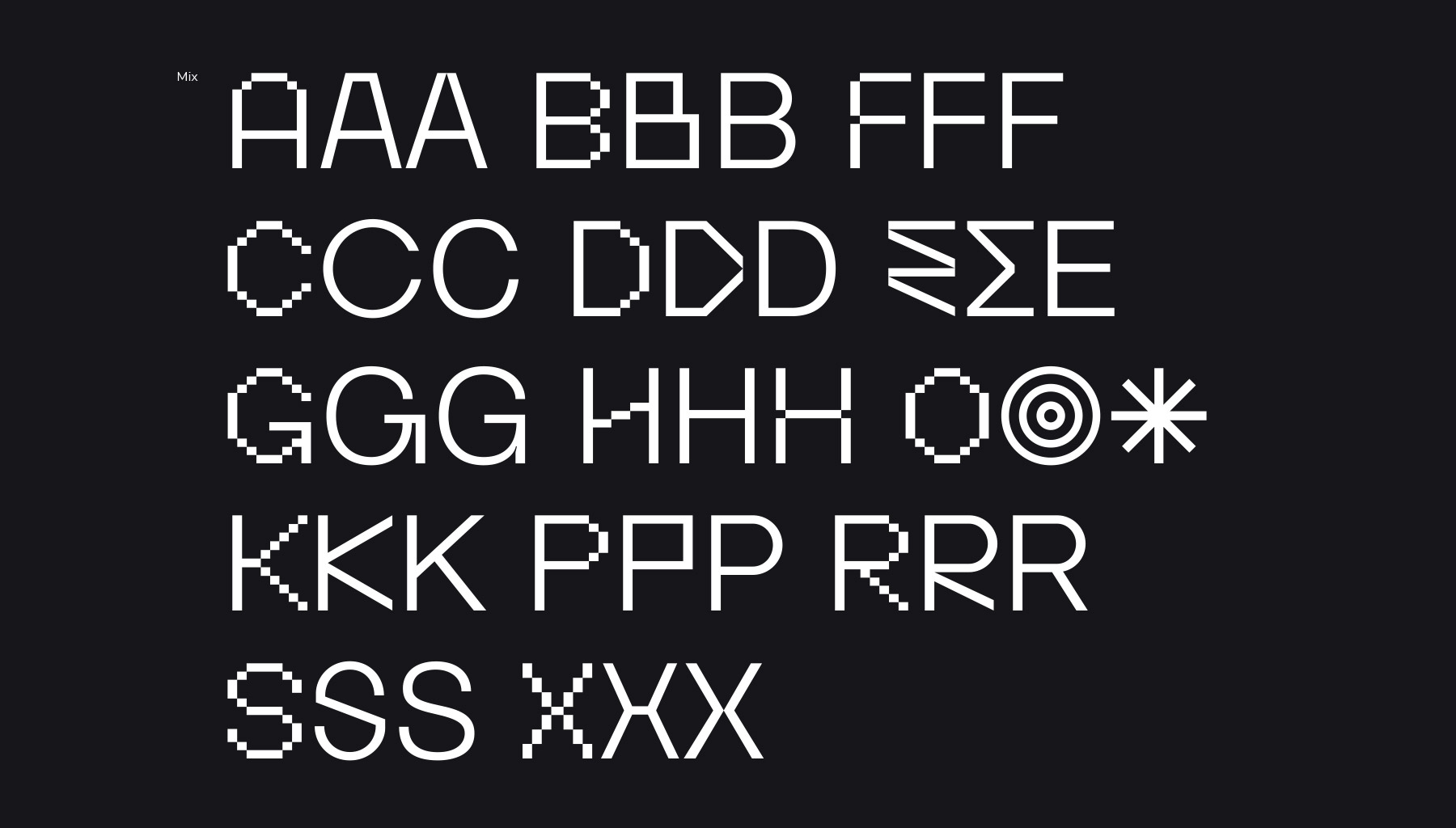 Включает в себя несколько шрифтов: классический спокойный гротеск, активный гротеск с ломанными формами букв, пиксельный шрифт, комбинацию из этих трех шрифтов и символьный шрифт.