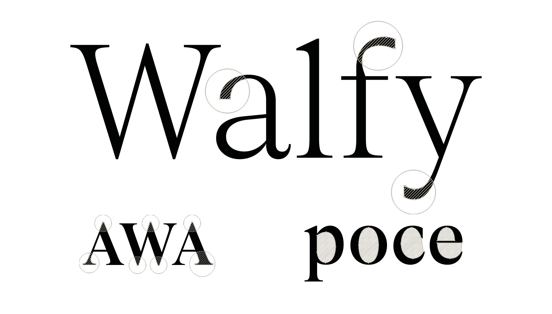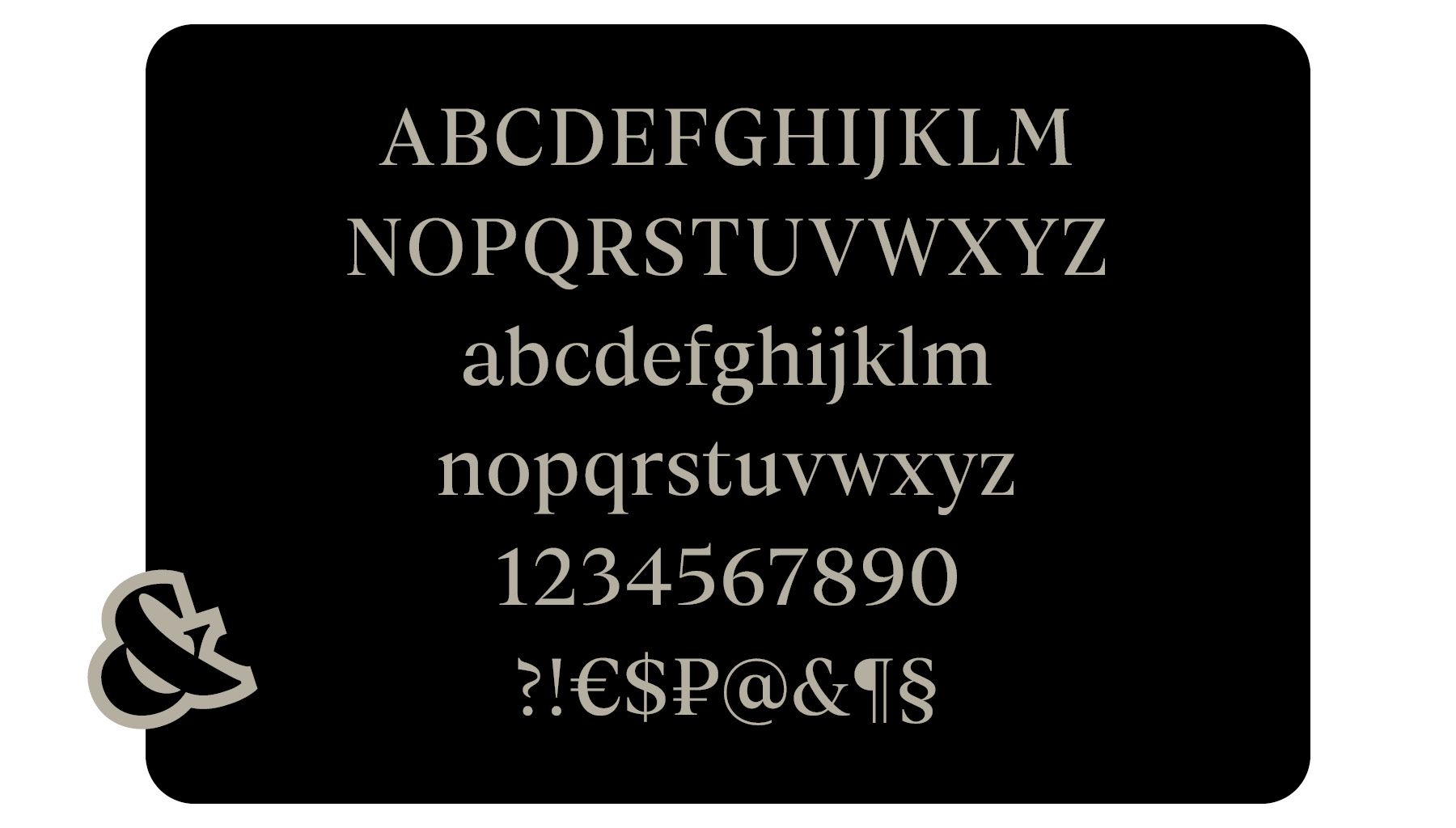 Классические острые засечки плавно перетекают в вертикальные и горизонтальные штрихи. Апексы хоть и скомпенсированы, но остаются достаточно острыми, чтобы подчеркнуть акцидентный характер шрифта.