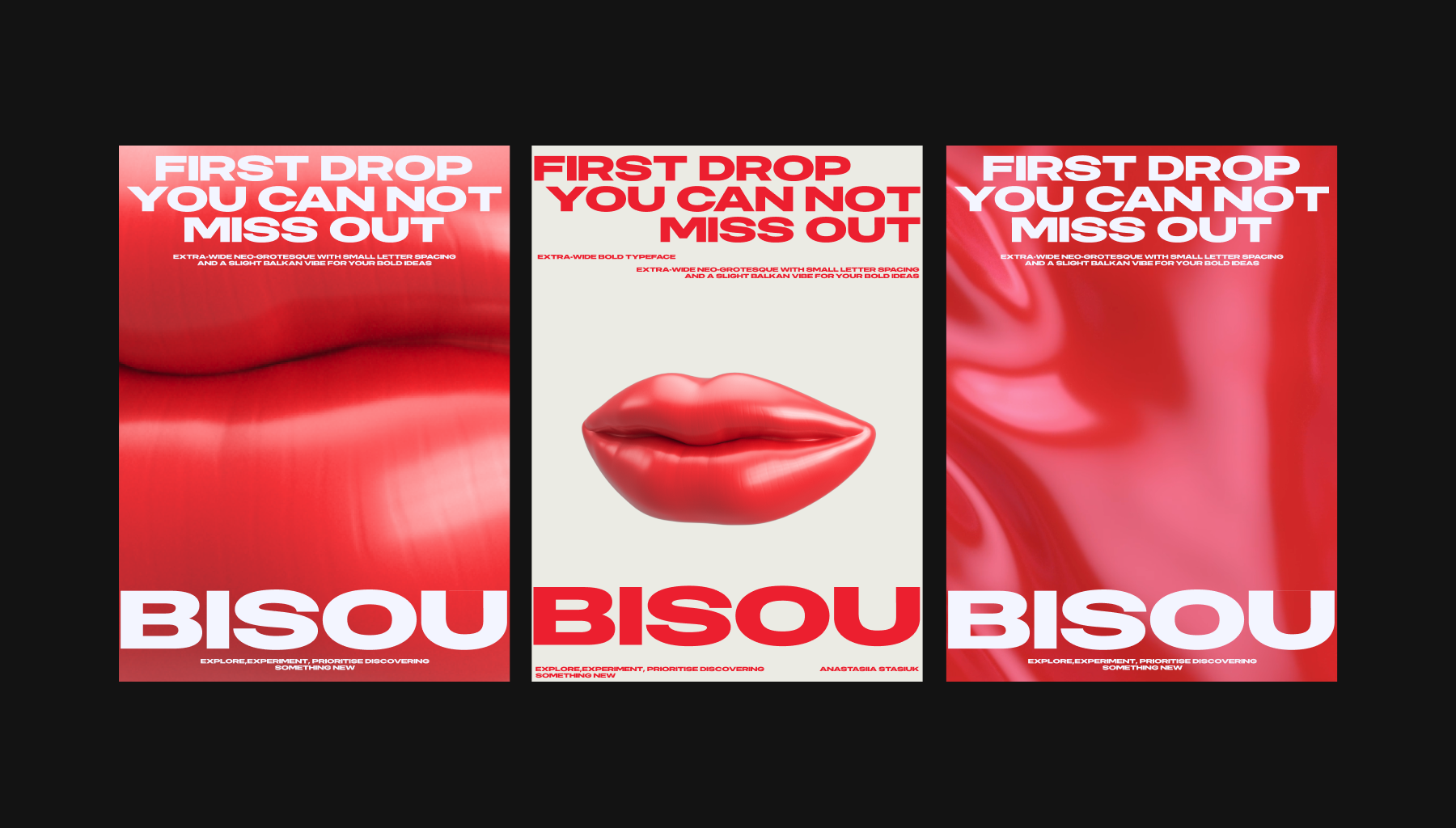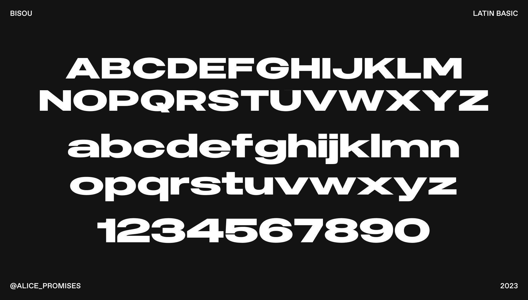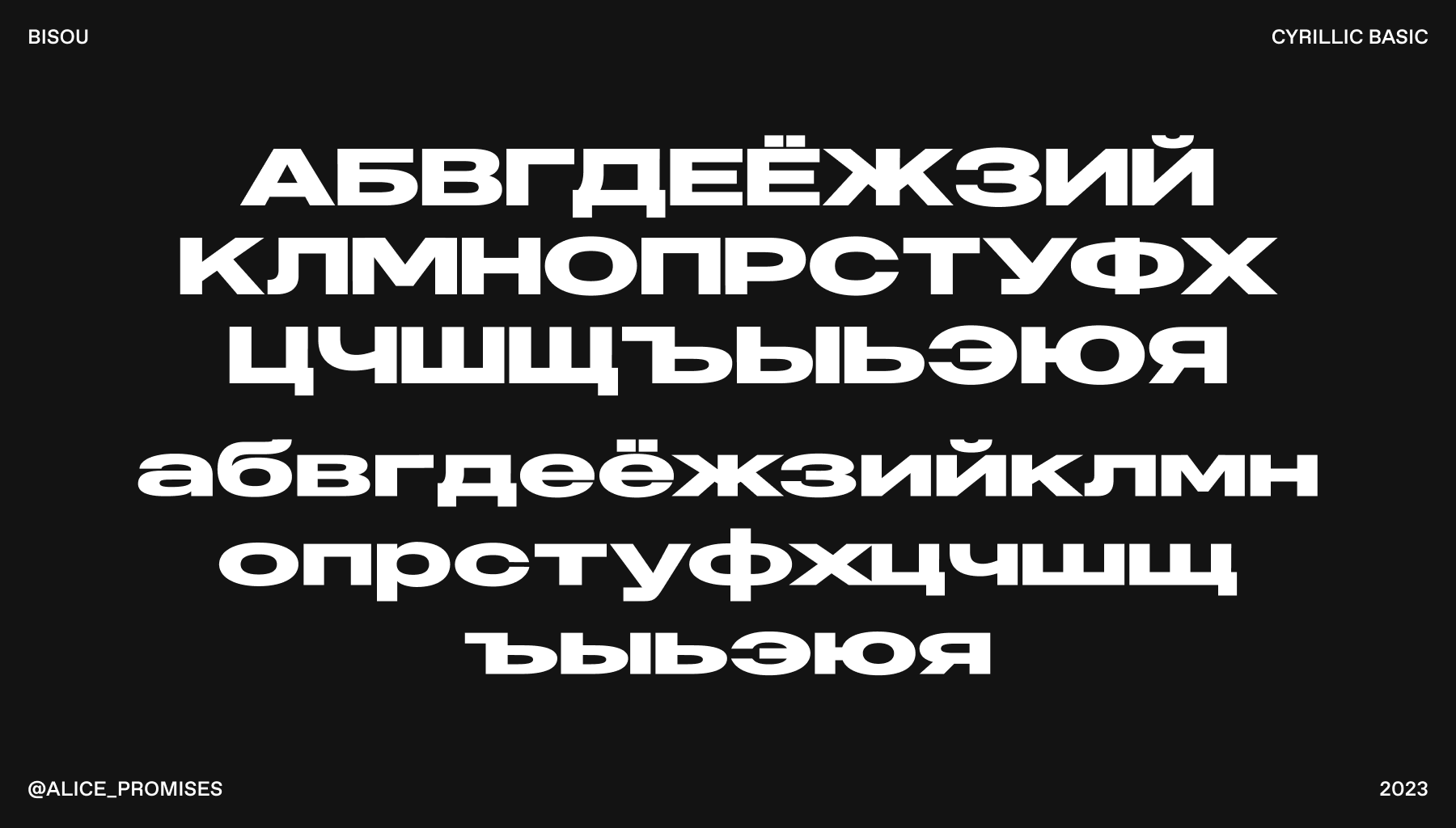 Bisou — супер-широкий акцидентный нео-гротеск в жирном начертании c закрытыми апертурами. Название Bisou в переводе с французского означает “поцелуй”. Метафора поцелуя возникла из-за напряжения, которое создается благодаря небольшим межбуквенным расстояниям. Пропорции шрифта подчеркнуты сужеными по вертикали широкими строчными буквами как в латинице, так и в кириллице, а также укороченными выносными элементами строчных знаков. Особое балканское настроение шрифта задают кириллические У со сломом горизонтального штриха и форма скруглений в строчных j,f,t,r. Bisou идеально подойдет для набора заголовков и коротких текстов.