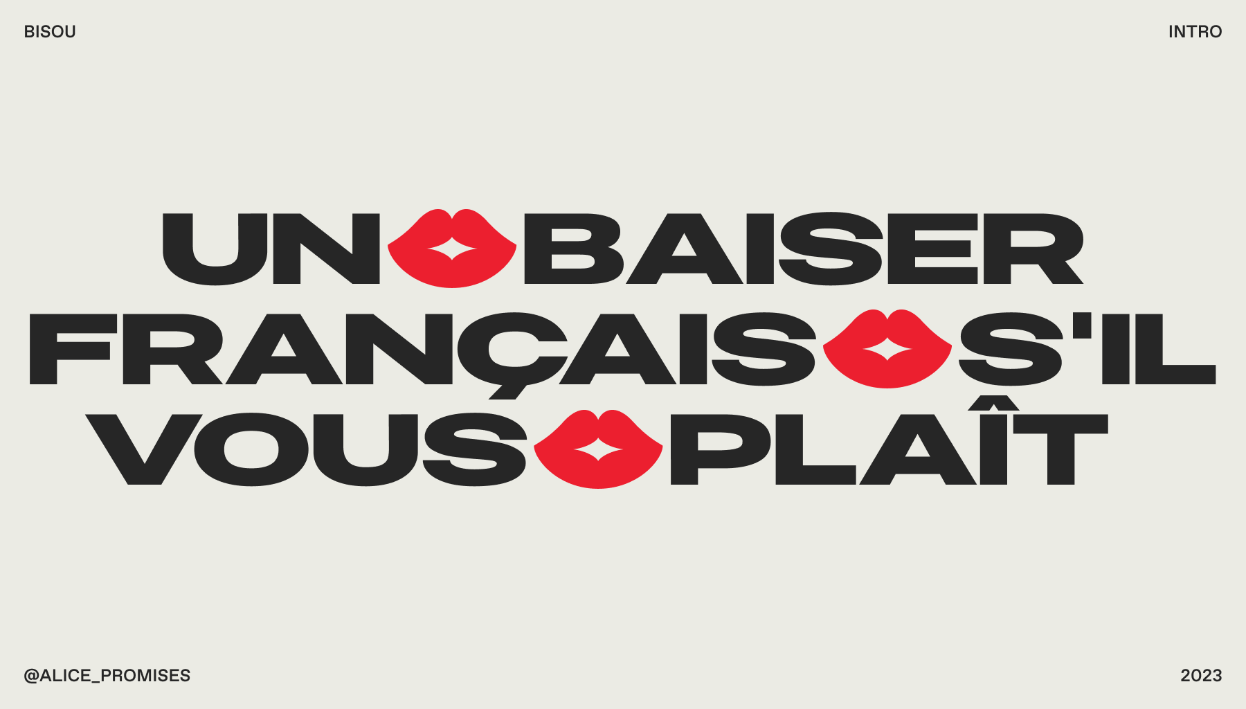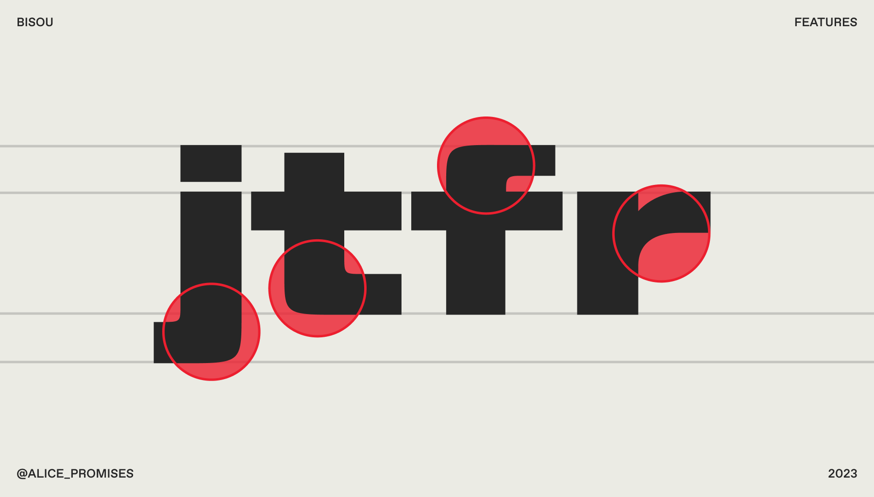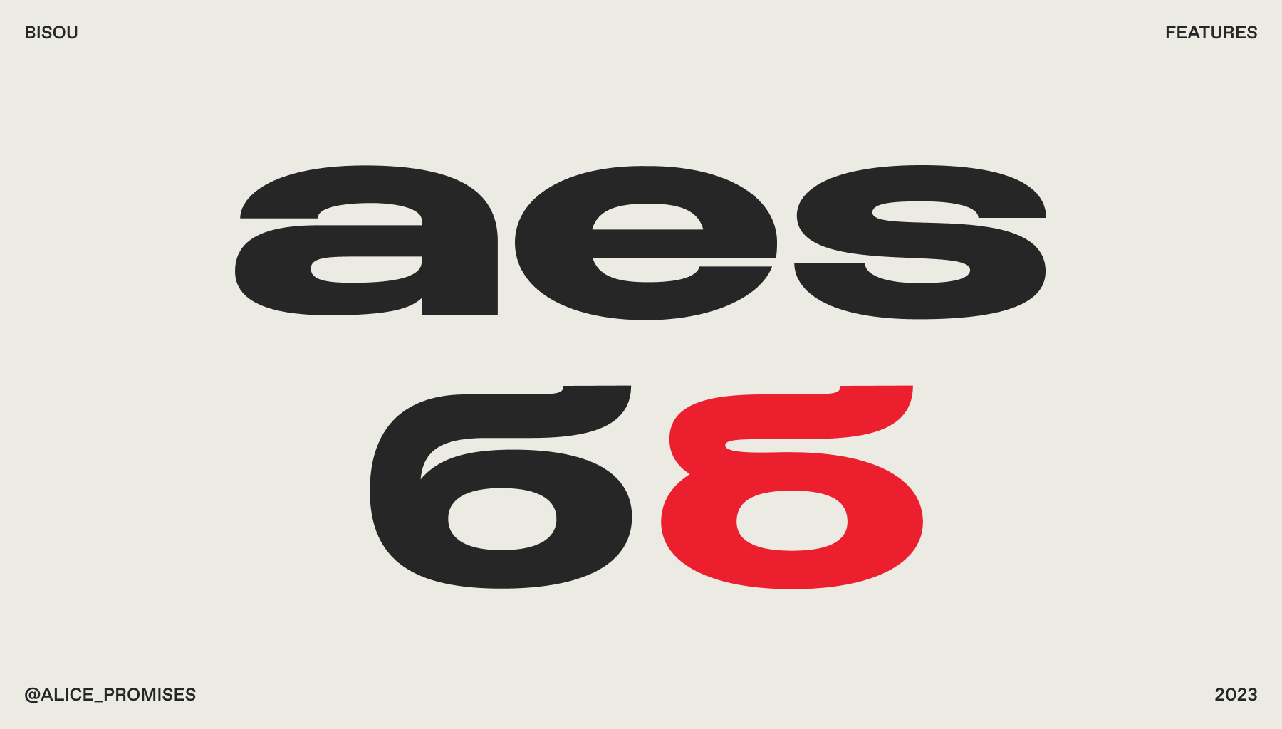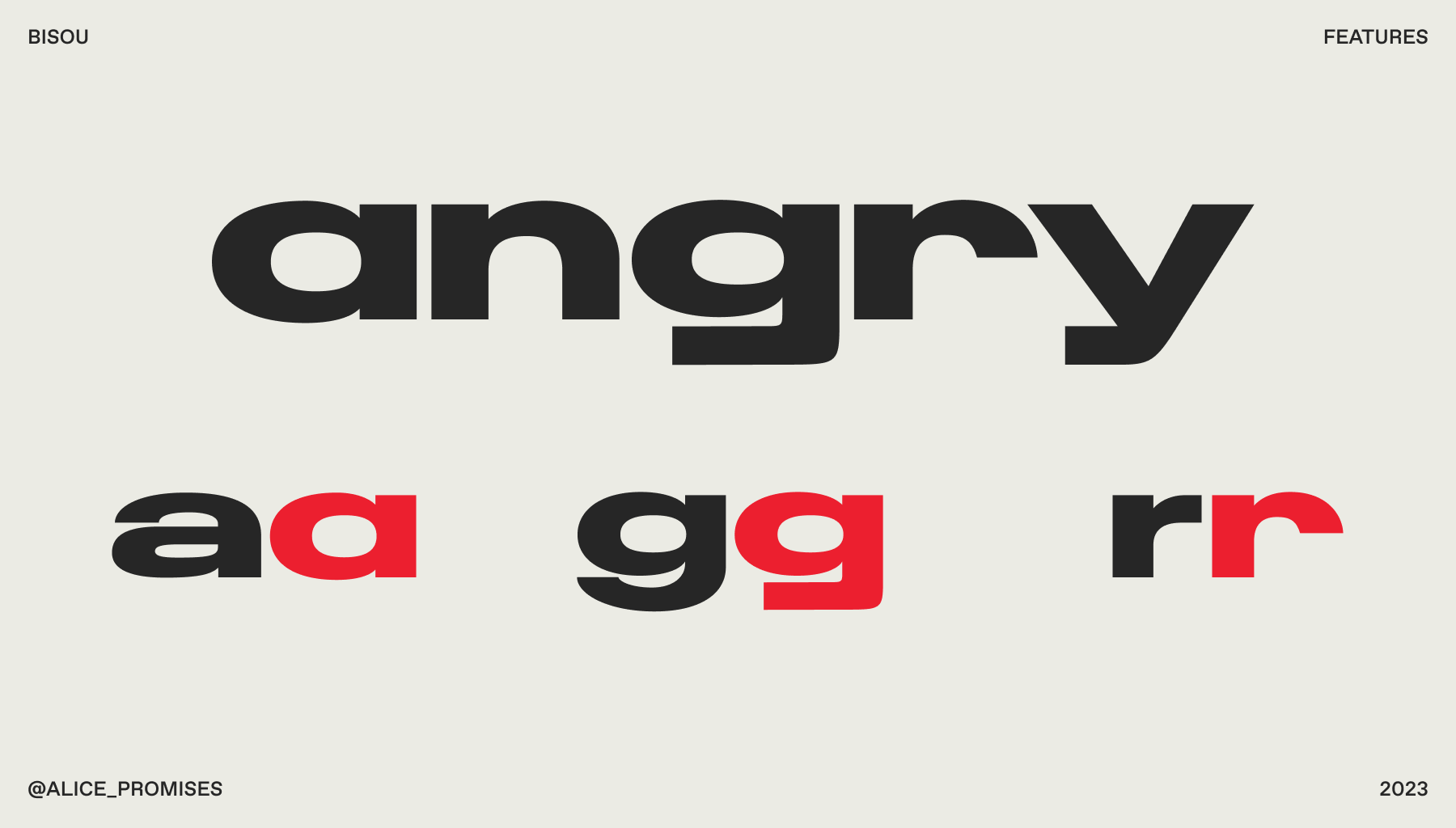 Bisou — супер-широкий акцидентный нео-гротеск в жирном начертании c закрытыми апертурами. Название Bisou в переводе с французского означает “поцелуй”. Метафора поцелуя возникла из-за напряжения, которое создается благодаря небольшим межбуквенным расстояниям. Пропорции шрифта подчеркнуты сужеными по вертикали широкими строчными буквами как в латинице, так и в кириллице, а также укороченными выносными элементами строчных знаков. Особое балканское настроение шрифта задают кириллические У со сломом горизонтального штриха и форма скруглений в строчных j,f,t,r. Bisou идеально подойдет для набора заголовков и коротких текстов.