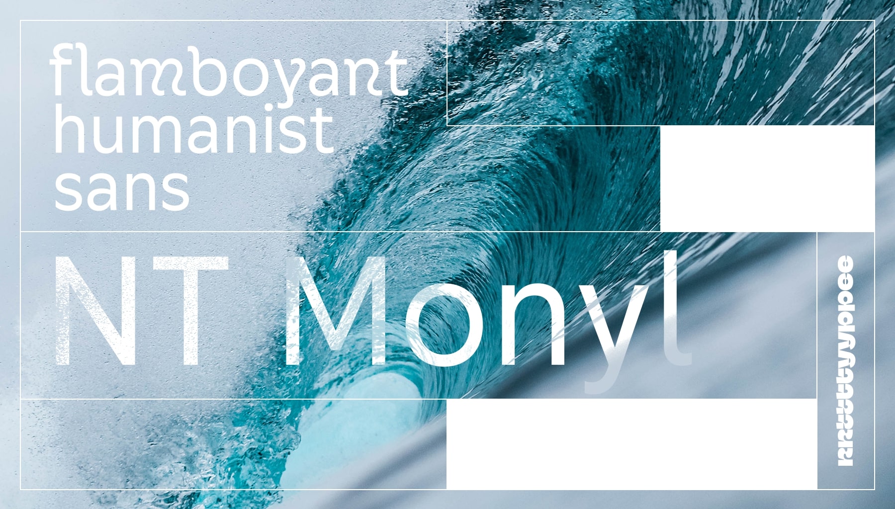 NT Monyl – открытый гуманистический гротеск, у которого есть две стороны. С одной стороны – спокойный гуманистический набор, который работает в тексте, а с другой – яркий вибрирующий, который подходит для заголовков. Вторая сторона будет доступна в виде стилистического сета и ее можно будет включить в OpenType фичах.