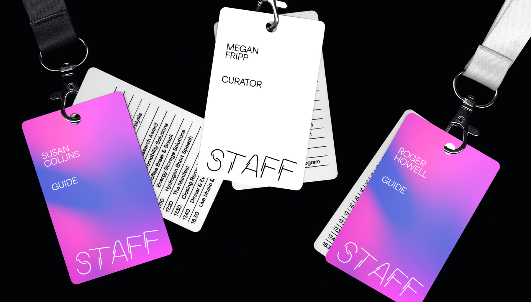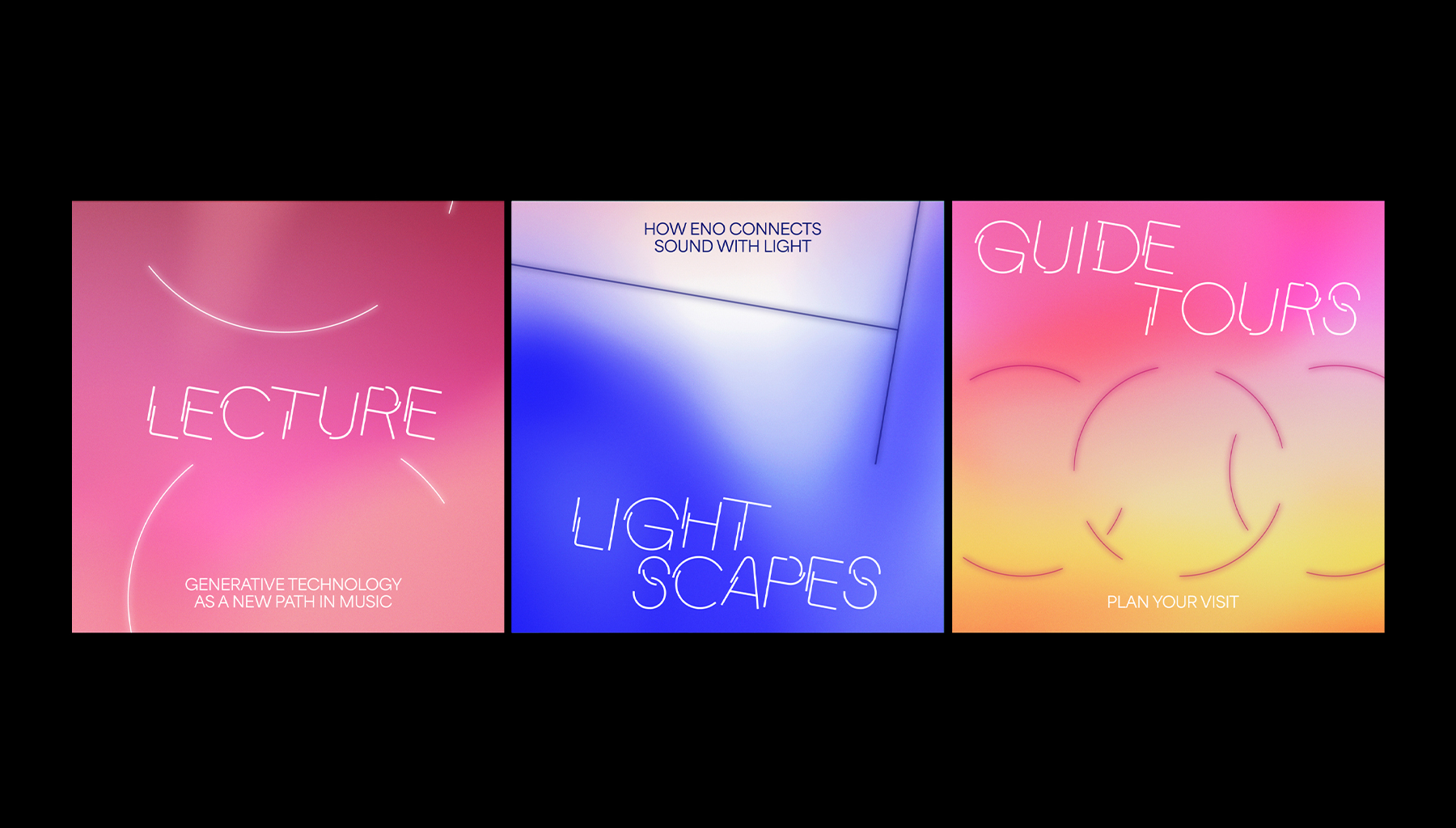 Айдентика выставки основана на визуальном облике художественных работ Брайана Ино, в которых используются перпендикулярные линии и мотив круга. Графика наслаивается на макеты, создавая генеративные шаблоны, аналогичные генеративному подходу Ино к своему творчеству.