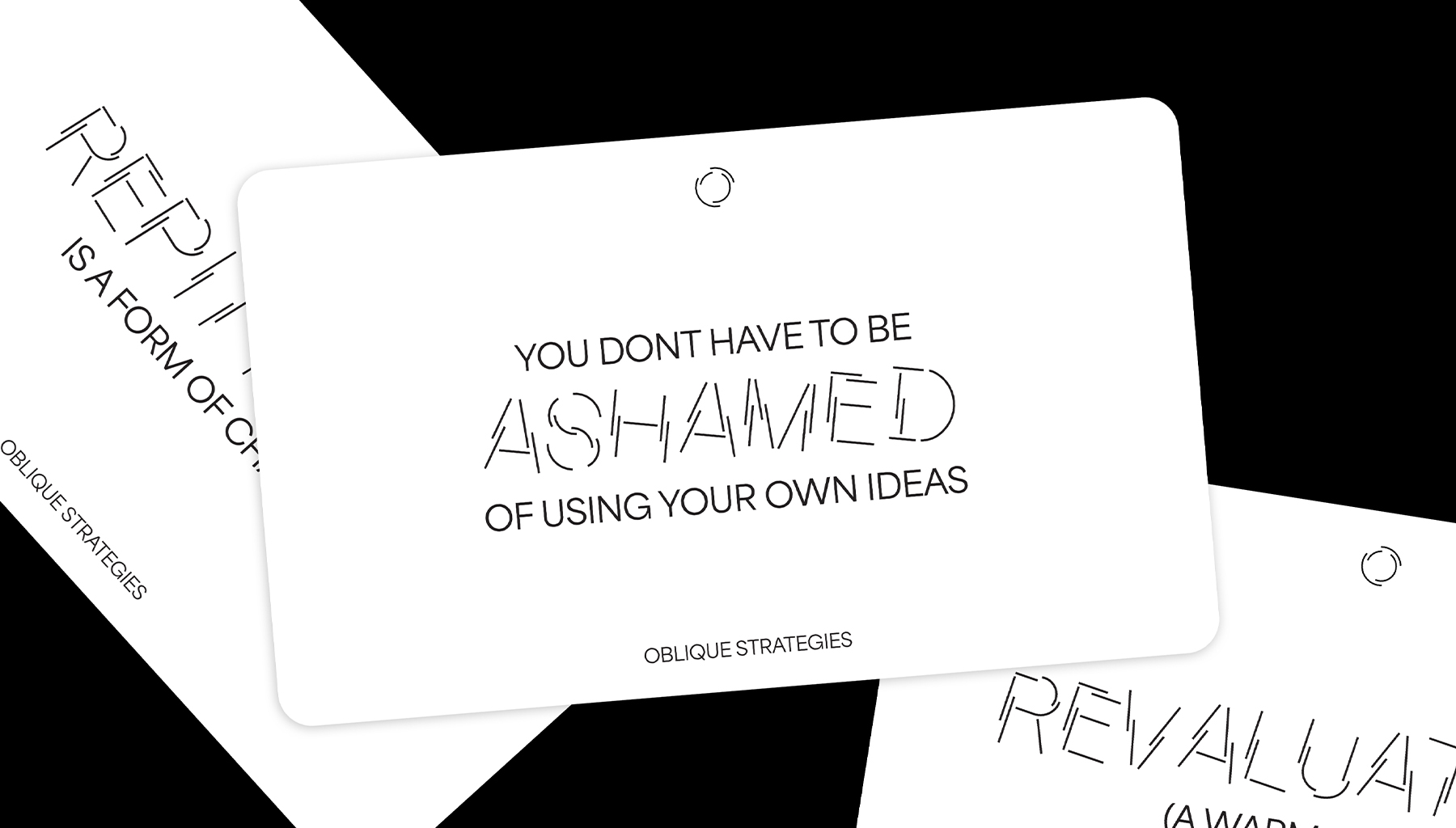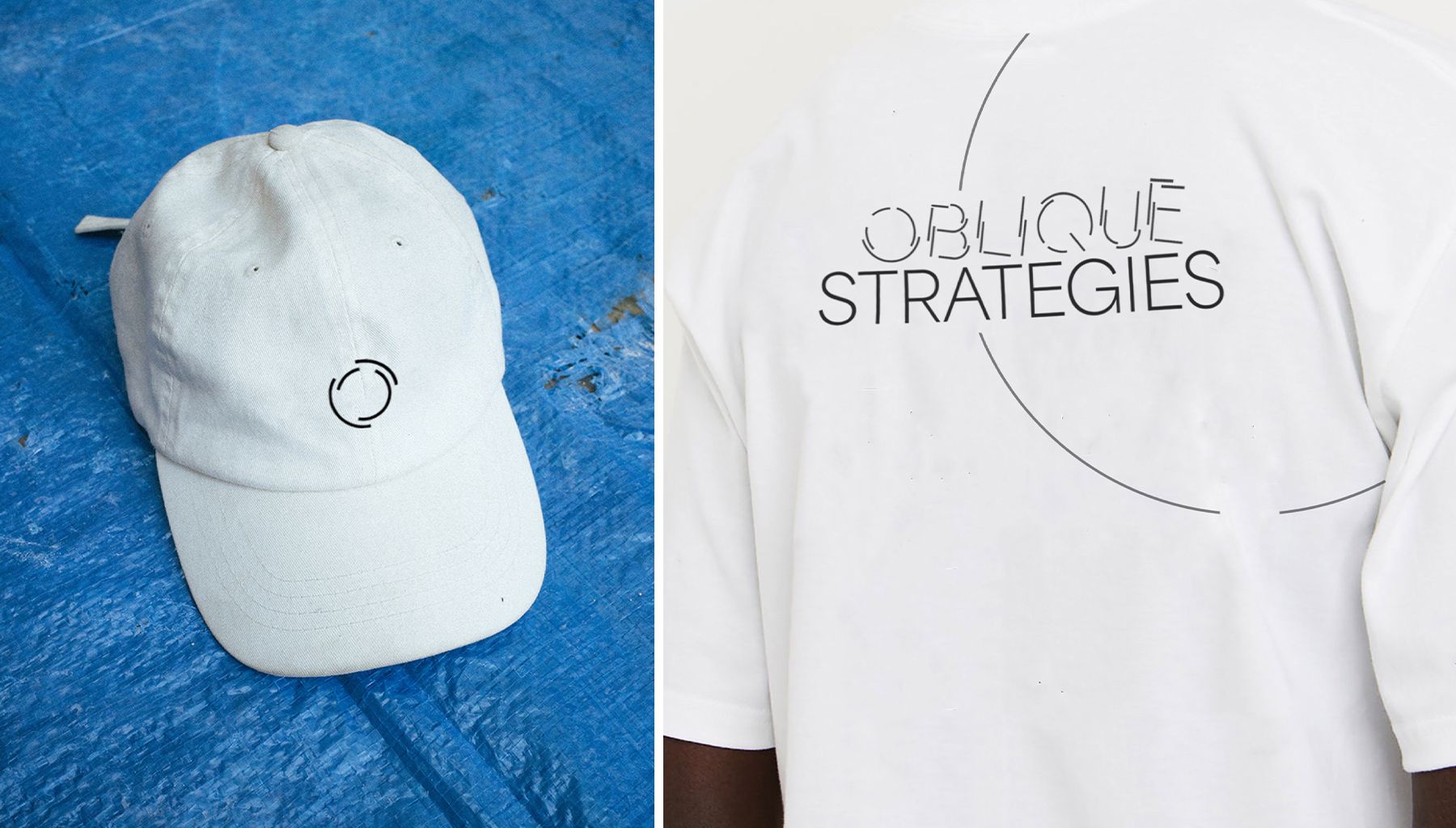 Название выставки и шрифта – отсылка к карточному методу Oblique Strategies, созданному Брайаном Ино и Питером Шмидтом в 1975 году. Карточки с указаниями помогают музыкальным деятелям и другим представителям творческих профессий взглянуть на свою работу под другим углом. Наклон штрихов в шрифте – олицетворение «наклонной» стратегии Ино.
