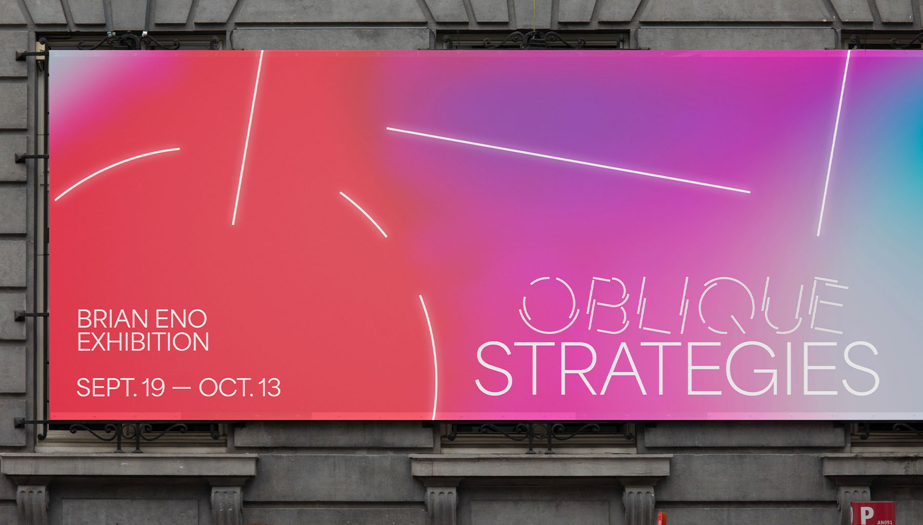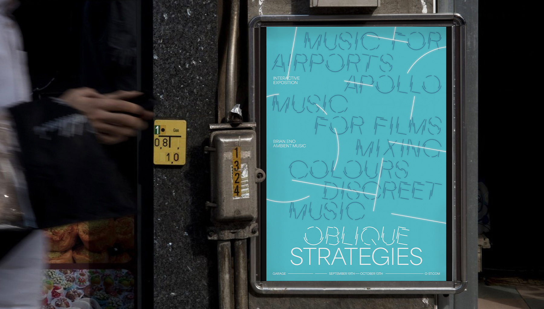 Выставка Oblique Strategies посвящена личности Брайана Ино и его многогранному творчеству. Экспозиция включает в себя звуковые и световые инсталляции, видеоарт, генеративные произведения, а также рассказывает о биографии основоположника эмбиент-музыки и значимой фигуры в мире музыки.