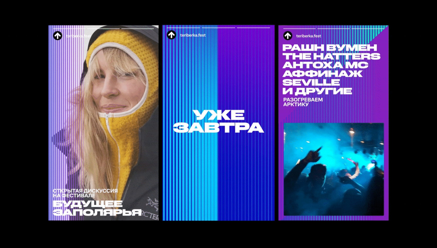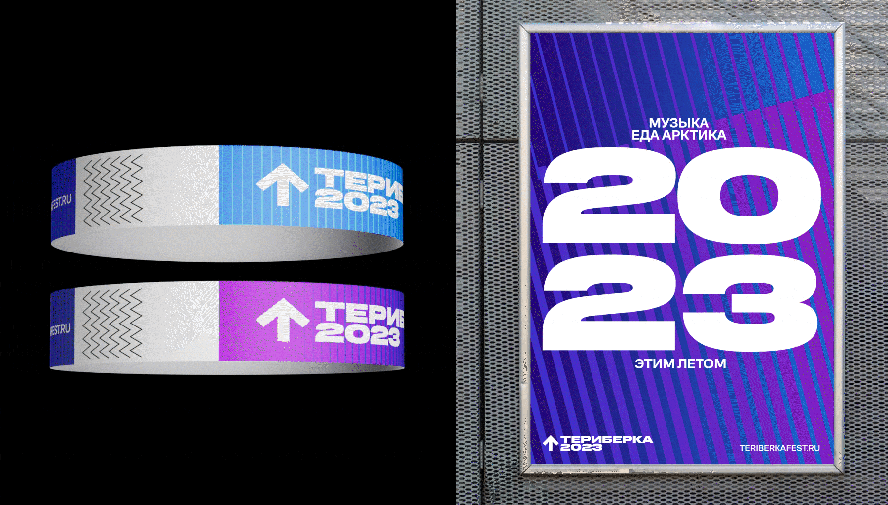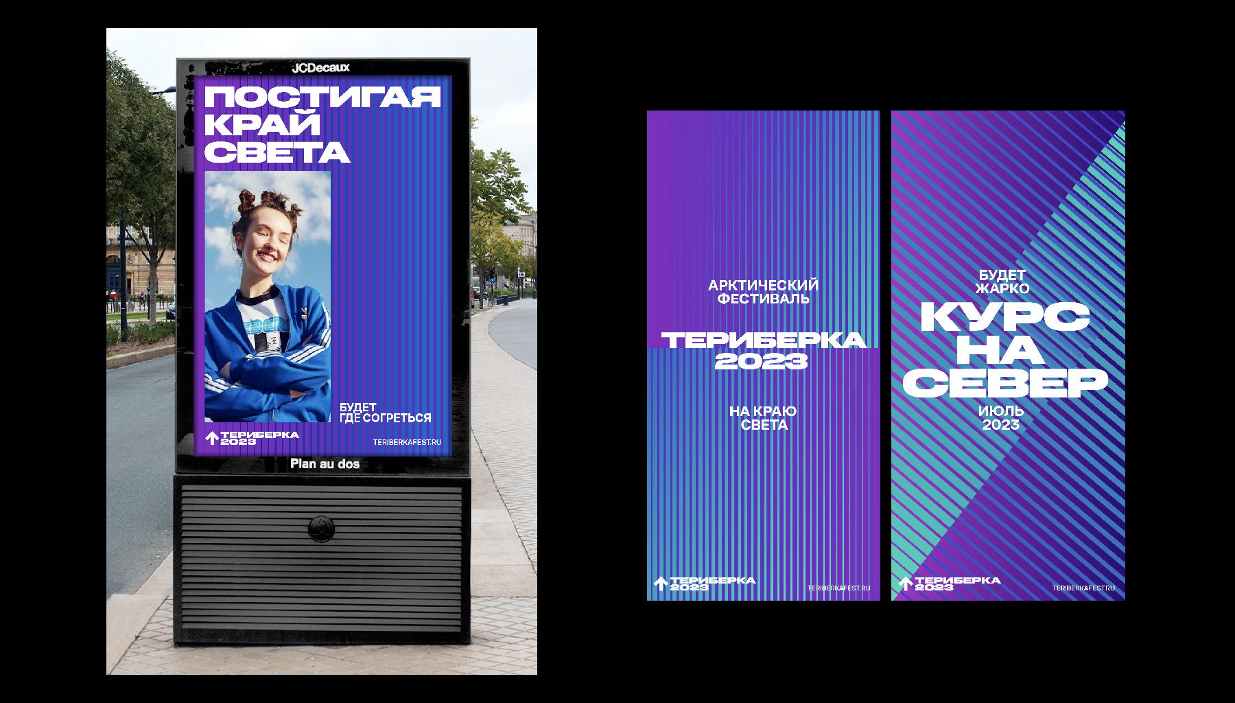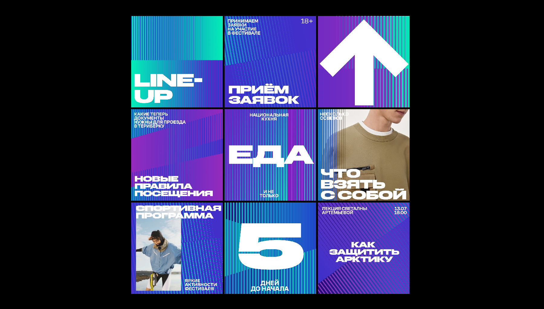 Айдентика фестиваля строится на одном из главных символов заполярья — северном сиянии. Физическая основа этого явления перетекла в графическое решение, которое, переливаясь, подсвечивает яркую сущность фестиваля от макета к макету, плавно выходя на мерч, в основе котрого специально подобранная двухцветная ткань. Плотная, брутальная типографика сохраняет суровое северное настроение села, при этом не теряя свою фестивальную, болдовую фактуру. Всё это дополняется ироничным копирайтингом, заигрывающим с стереотипами о крайнем севере.