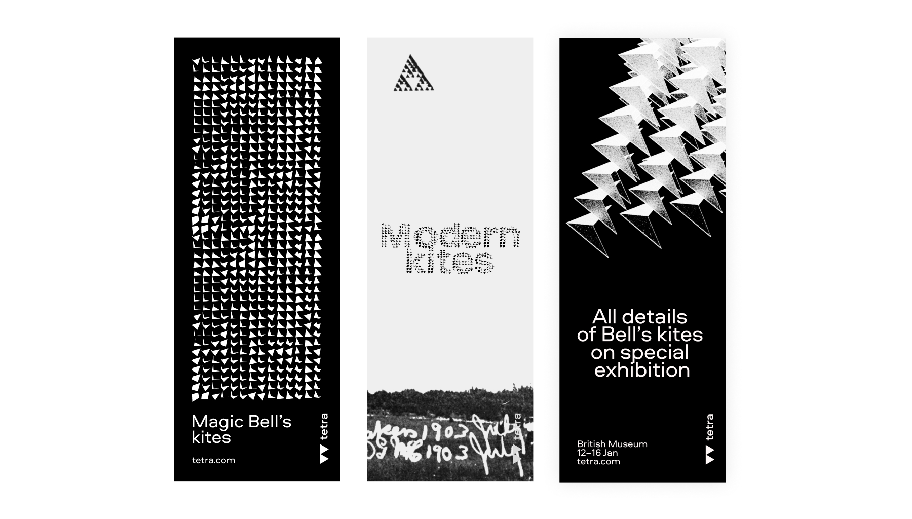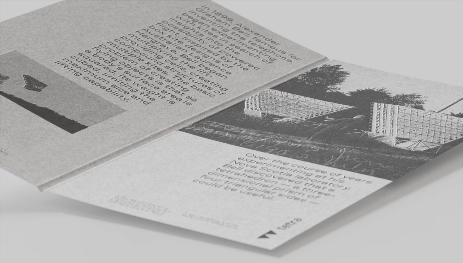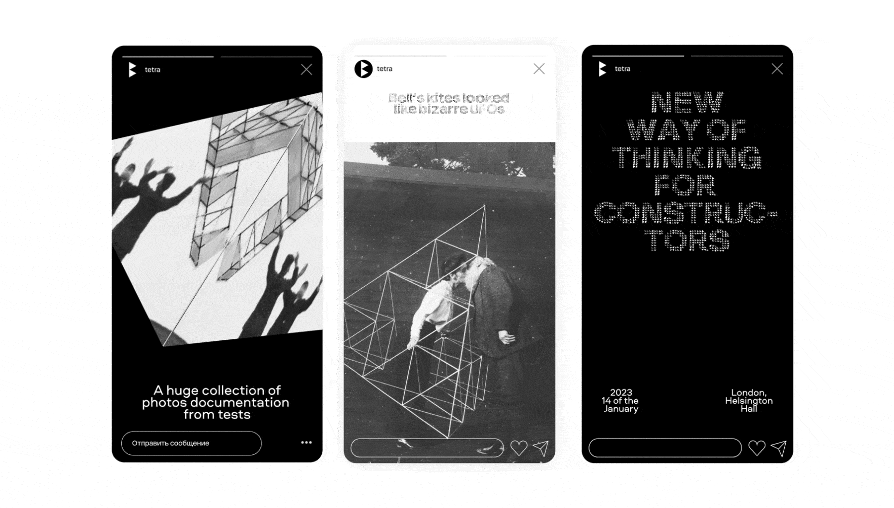 Кейс посвящен удивительным конструкциям Александра Белла, великого изобретателя, который верил, что тетраидерные конструкции поднимут нас в небо. Он создавал невиданные формы, в основе которых лежала тетраидерная форма. Поэтому и в основе айдентики выставки тоже лежит тераидер, который образует подвижные конструкции, буквы и символы. Специально для кейса был разработан акцидентный шрифт Tetraiderica, глифы которого тоже могут подняться в небо.