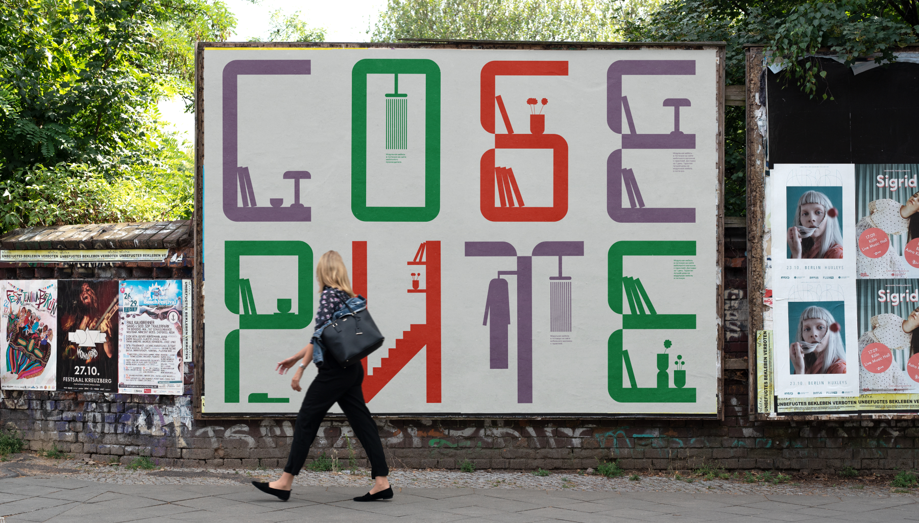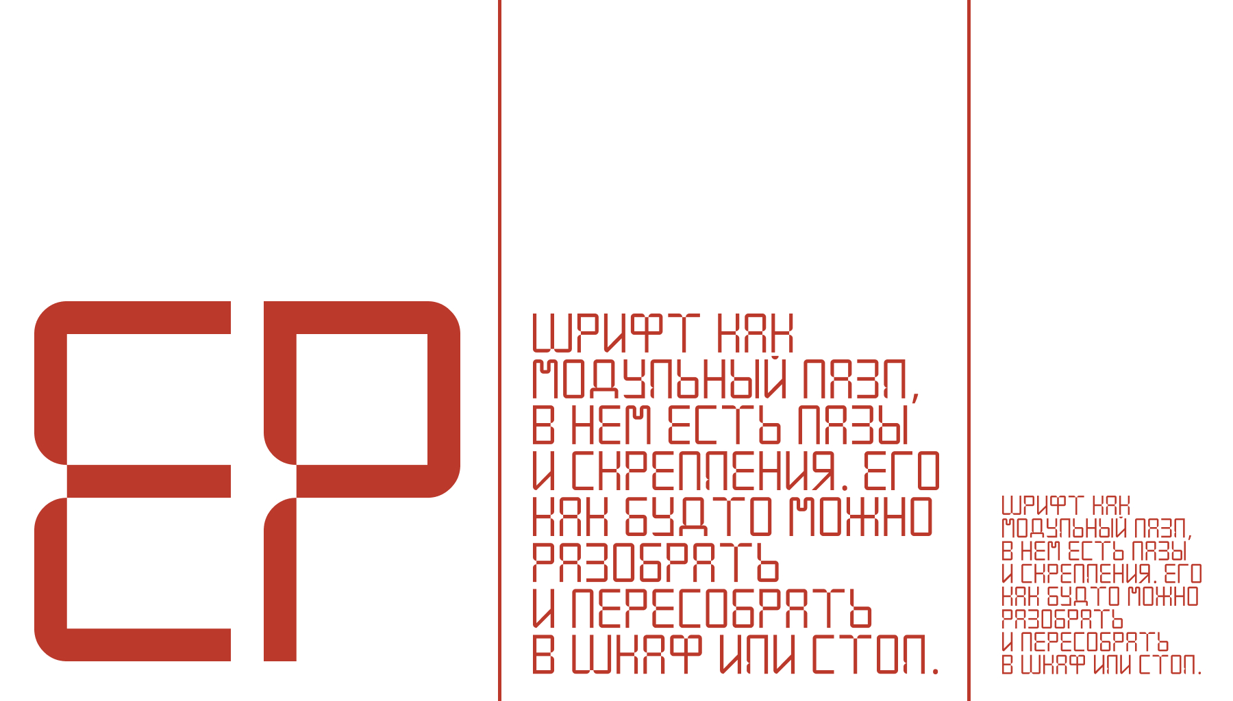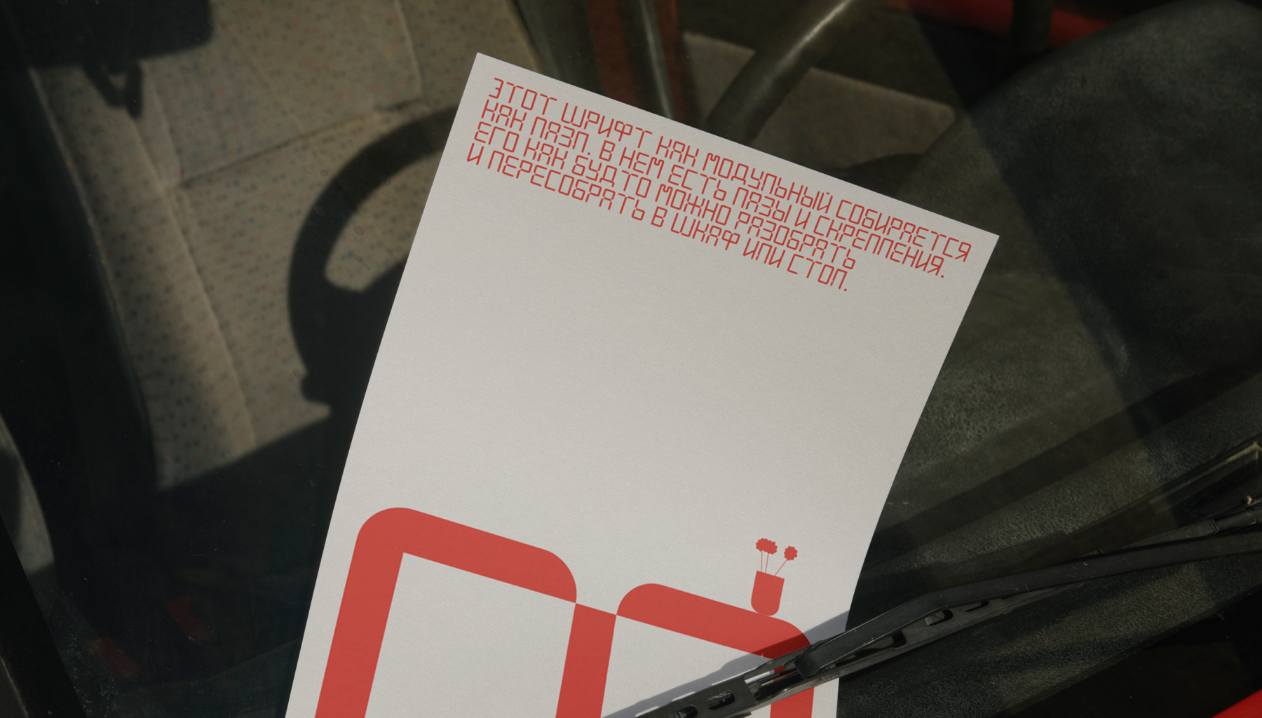 Шрифт — основа проекта. Как мебель формирует и задает цель пространству, так и шрифт создан, чтобы быть центральным элементом и занимать как можно больше места на формате, задавать ему интонацию. Также это позволяет лучше разглядеть его детали и «крепления». Поэтому он в основном используется на плакатах и в заголовках.