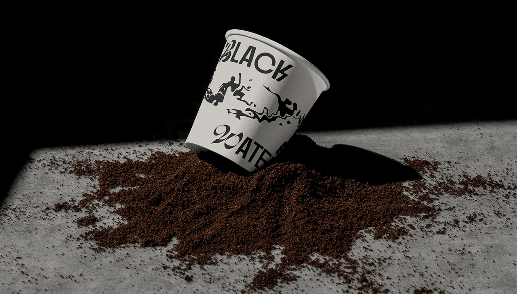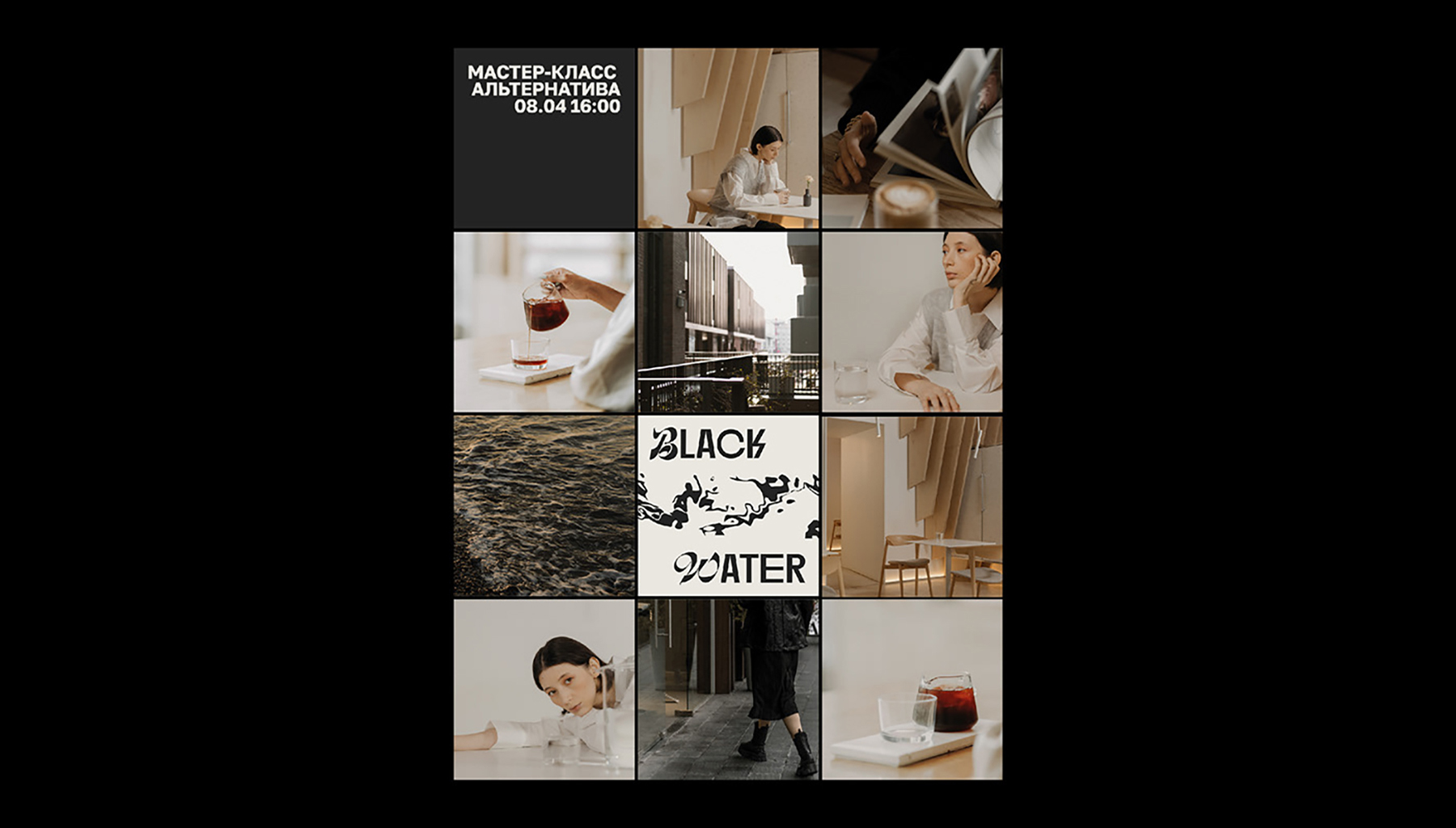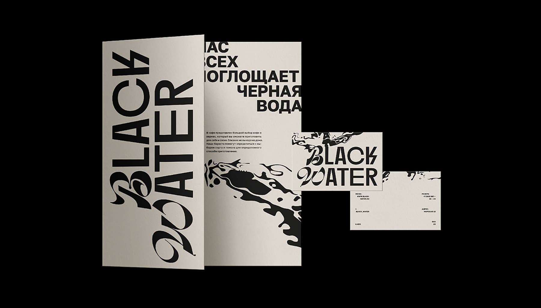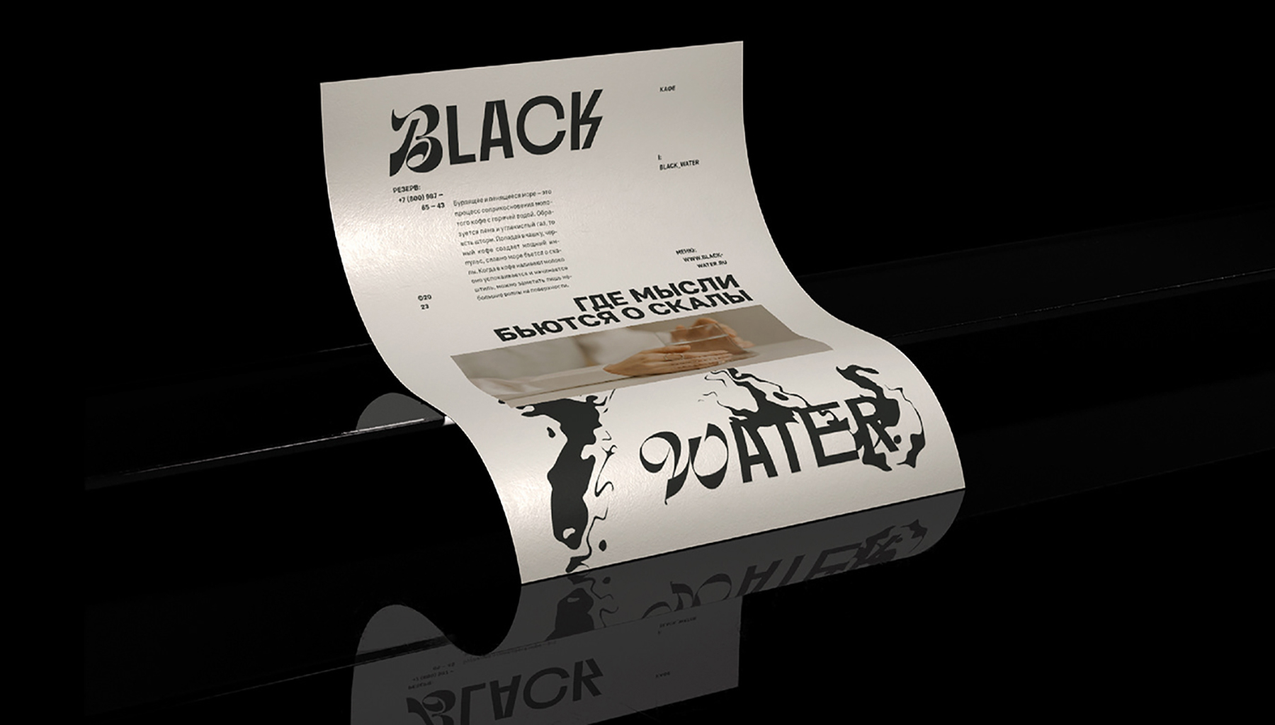 BLACK WATER в переводе с английского — «черная вода», это черный кофе, такой же черный как Черное море. Бурлящее и пенящееся море — это процесс соприкосновения молотого кофе с горячей водой. Образуется пена и углекислый газ, то есть шторм. Попадая в чашку, черный кофе создает мощный импульс, словно море бьется о скалы. Когда в кофе наливают молоко оно успокаивается и наступает штиль, можно заметить лишь небольшие волны на поверхности.