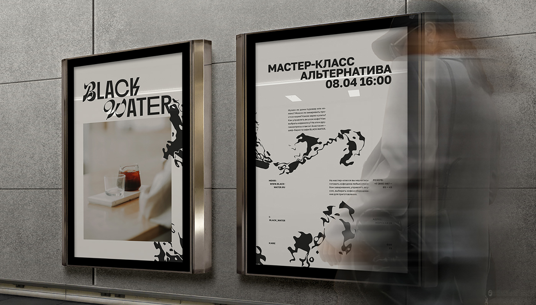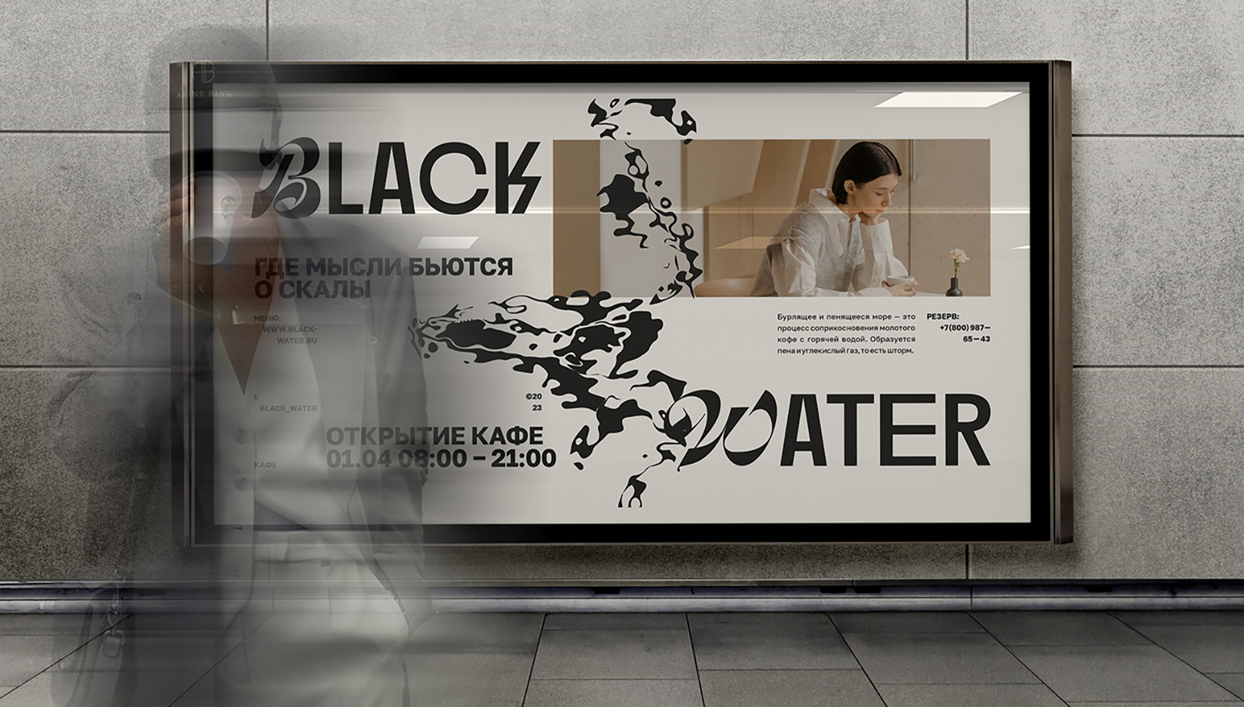 Чтобы отразить графически идею бренда, мы разработали анимацию бушующего моря, выгрузили покадрово и трассировали. Тем самым получили динамическую айдентику. Мы также разработали слоган для бренда «Там, где мысли бьются о скалы, нас всех поглощает чёрная вода»: люди часто погружены в свои мысли — в среднем у человека в голове возникает около 6 200 разных мыслей в сутки и это только в среднем. Мы связали процесс заваривания кофе с роем мыслей в голове: кофеин – нейростимулятор, то есть, попадая в мозг, он блокирует действие вещества, которое отвечает за стимуляцию сна и ускоряет работу нейронных связей в мозг, так как кофеин похож по структуре на аденозин и способен связываться с рецепторами вместо аденозина, повышая ощущение бодрости, ощущение подходящих мыслей в голове.