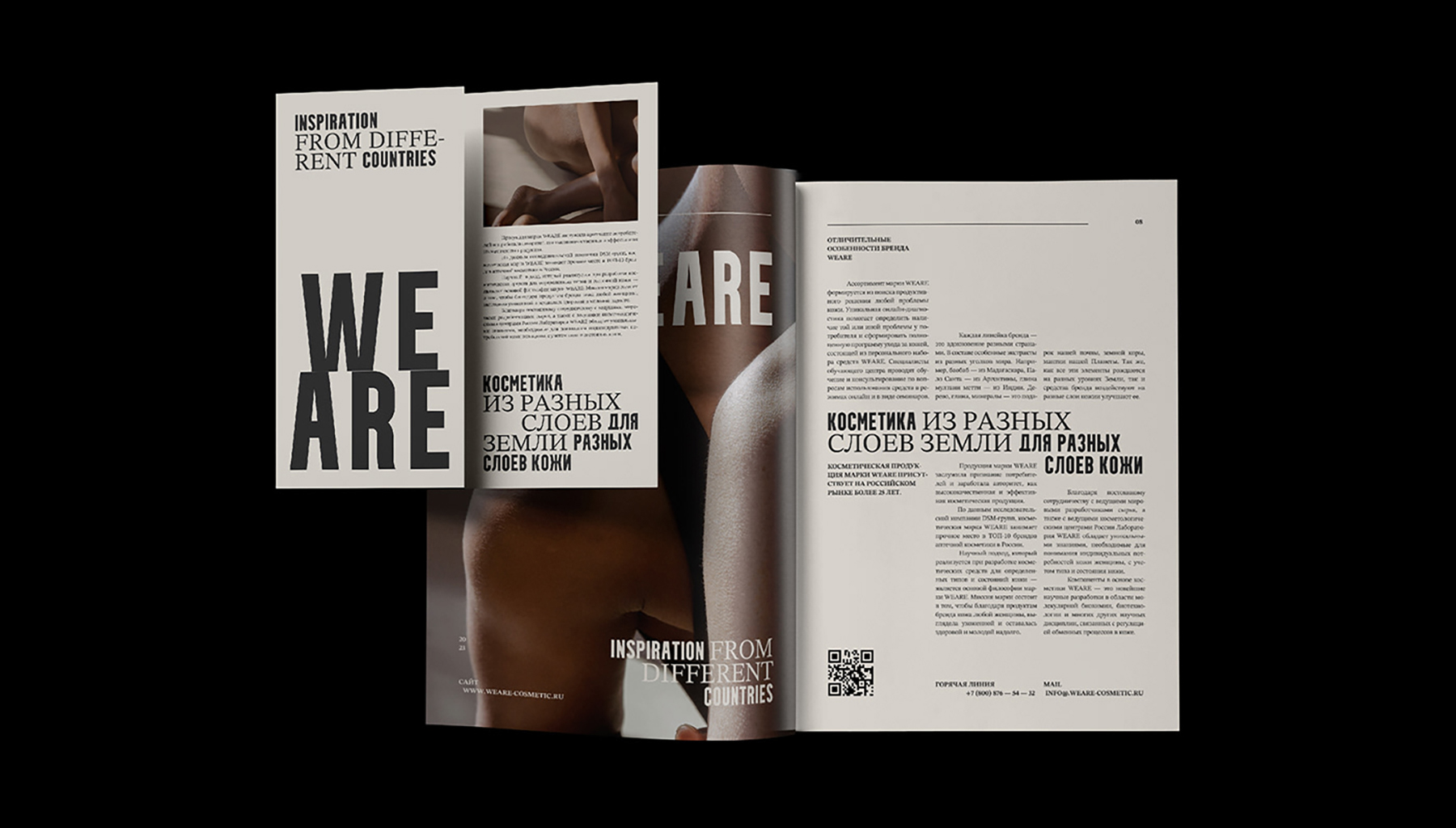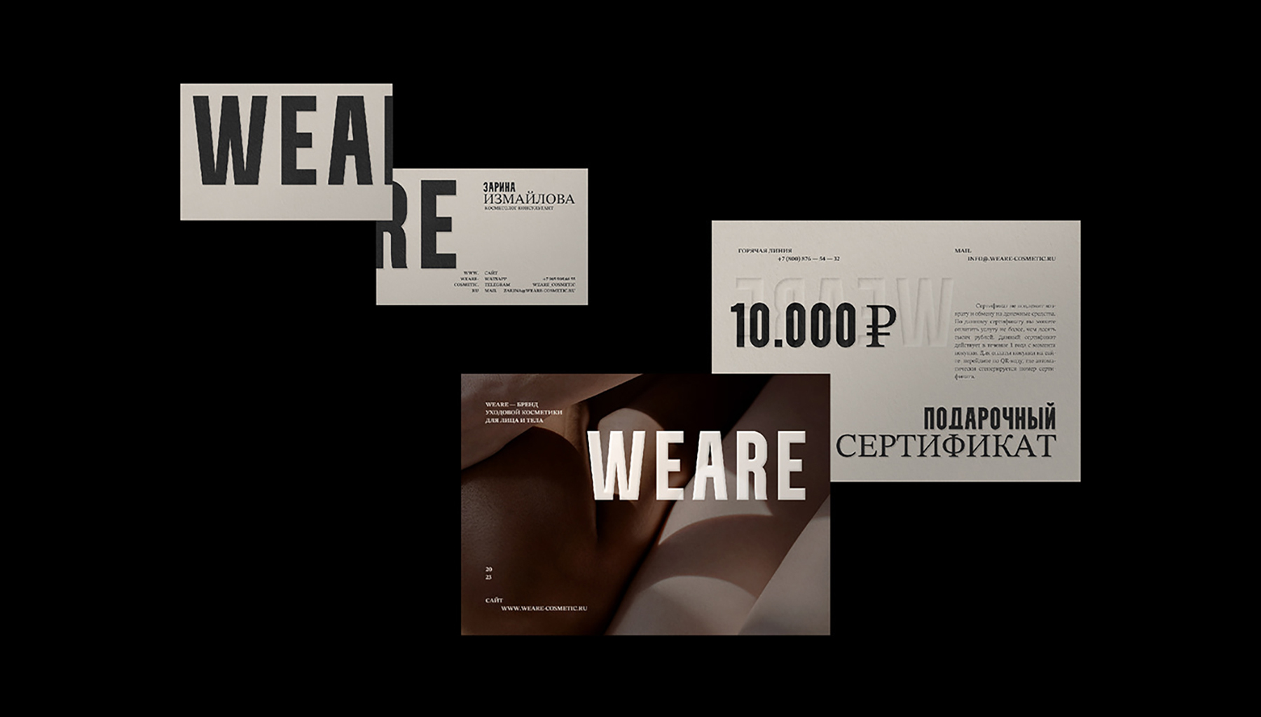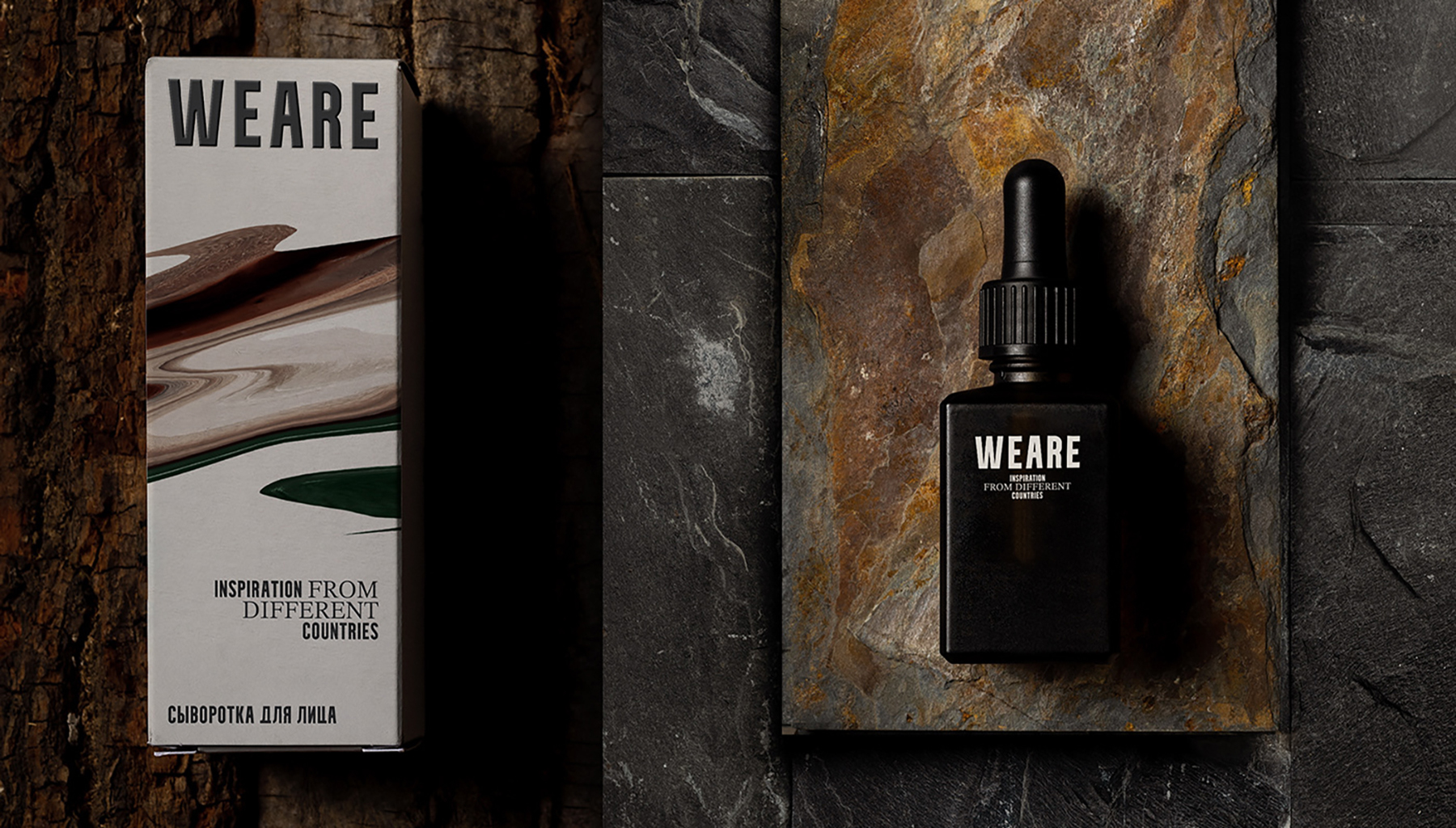 Концепция айдентики строится по принципу многослойности ухода и разнообразия элементов, входящих в состав: мы используем узкий жирный гротеск и контрастную ему утонченную антикву, мы сочетаем несочетаемое и объединяем это в вёрстке всего фирменного стиля. На упаковках мы используем графику, созданную на основе фотографий разных пород, разных слоев Земли: камень, пе-сок, глина, океан, водоросли — они растекаются по упаковке, будто крем, созданный самой природой. Weare создан, чтоб подарить наслаждение в процессе ухода за кожей, дать прикоснуться к чему-то таинственному — к недрам нашей Планеты, стать частью целого.