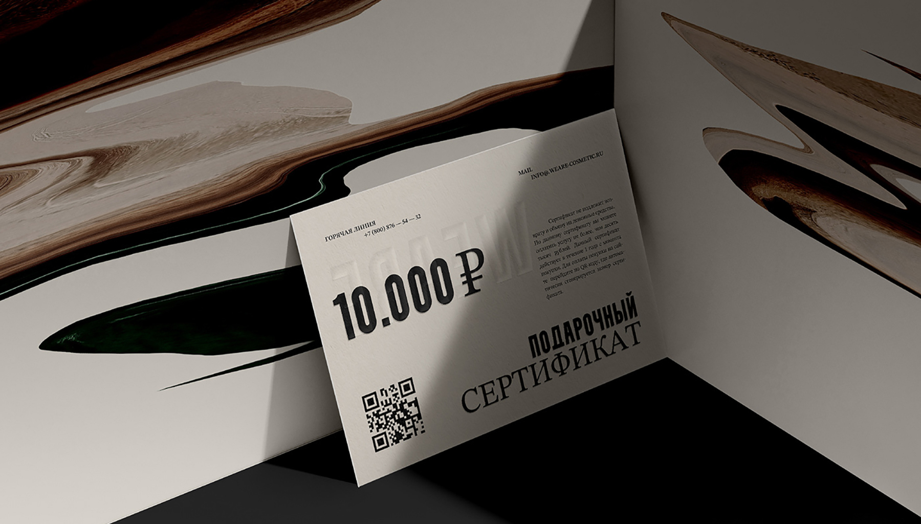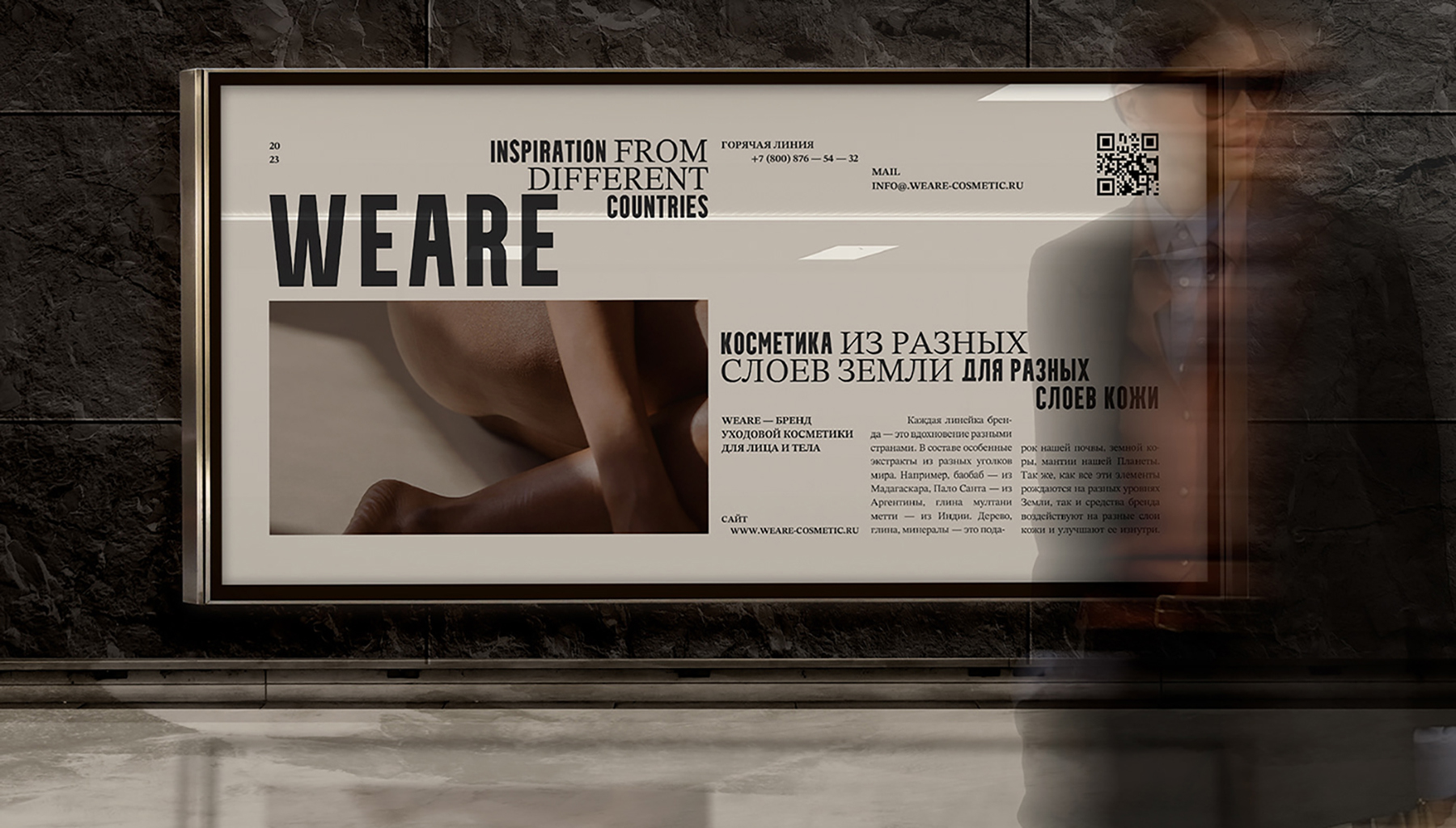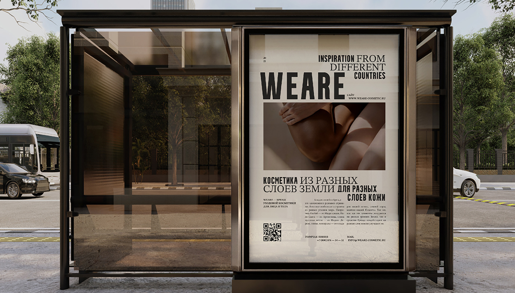 Концепция айдентики строится по принципу многослойности ухода и разнообразия элементов, входящих в состав: мы используем узкий жирный гротеск и контрастную ему утонченную антикву, мы сочетаем несочетаемое и объединяем это в вёрстке всего фирменного стиля. На упаковках мы используем графику, созданную на основе фотографий разных пород, разных слоев Земли: камень, пе-сок, глина, океан, водоросли — они растекаются по упаковке, будто крем, созданный самой природой. Weare создан, чтоб подарить наслаждение в процессе ухода за кожей, дать прикоснуться к чему-то таинственному — к недрам нашей Планеты, стать частью целого.