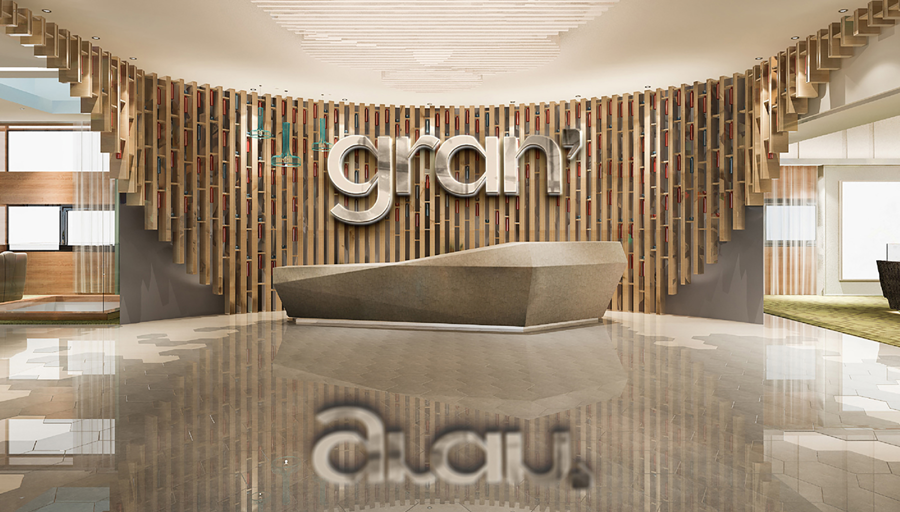 Слово «Gran’» — с русского языка переводится как грань, что можно интерпретировать как грань разума, грани колонн и саму форму здания — четкая, геометричная как грани.